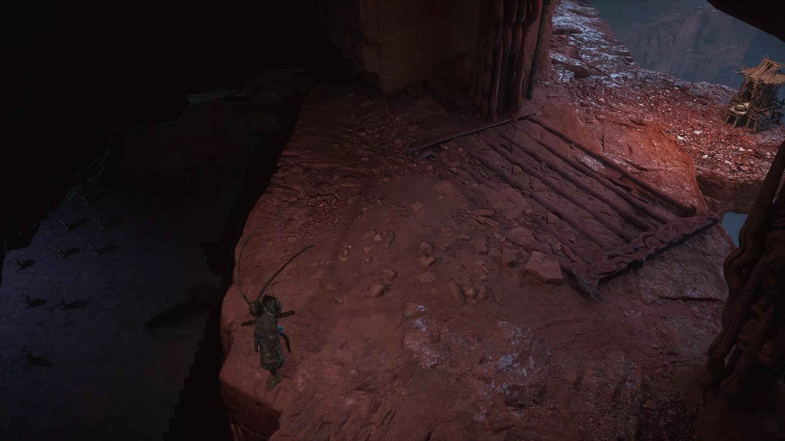 我们返回并进入洞穴。往前走一点,左边悬崖边上会有一个木制小屋。小屋上有冥想点[3/24]——【黑风崖洞】