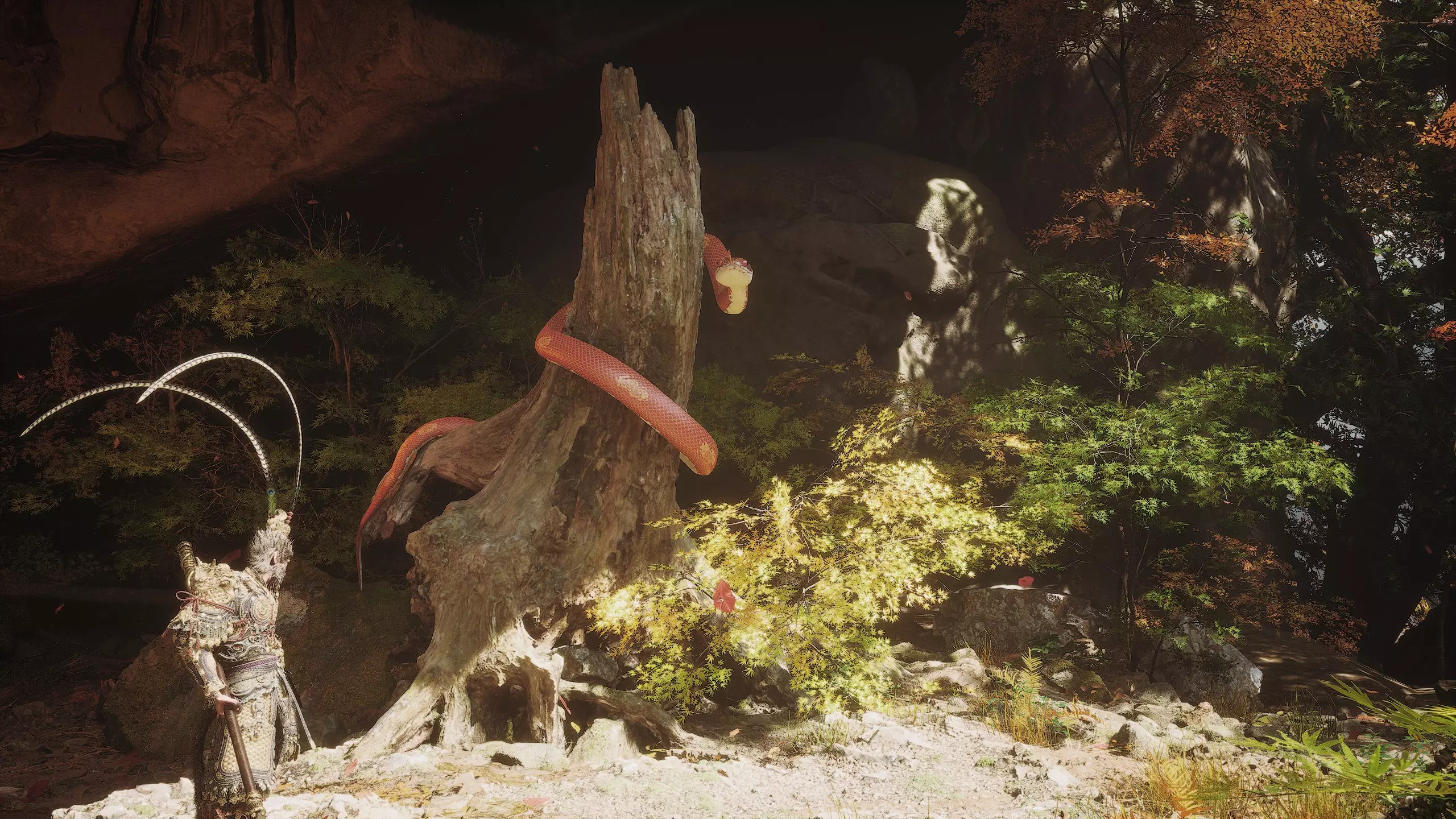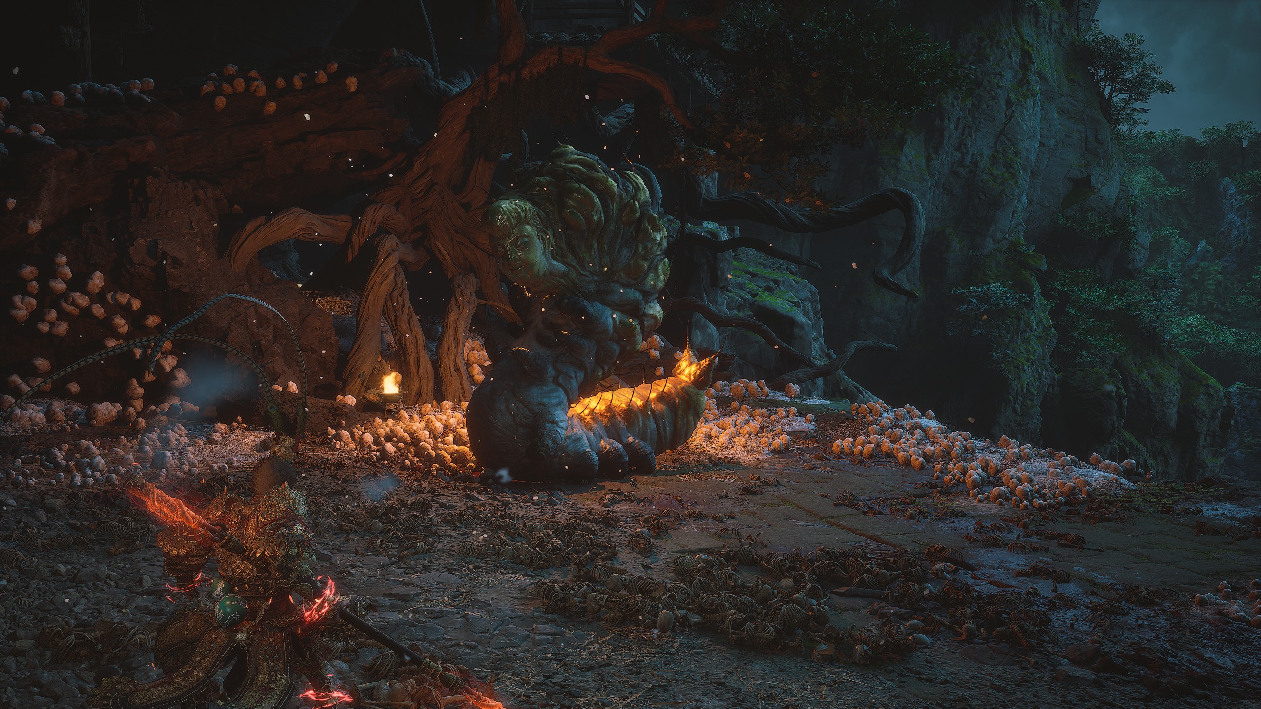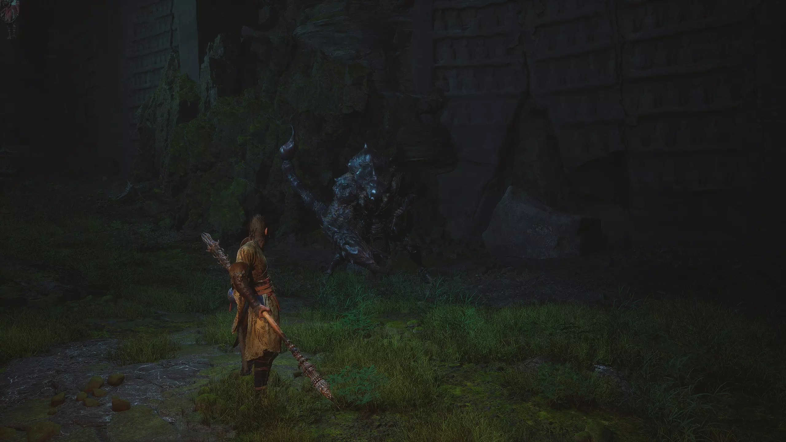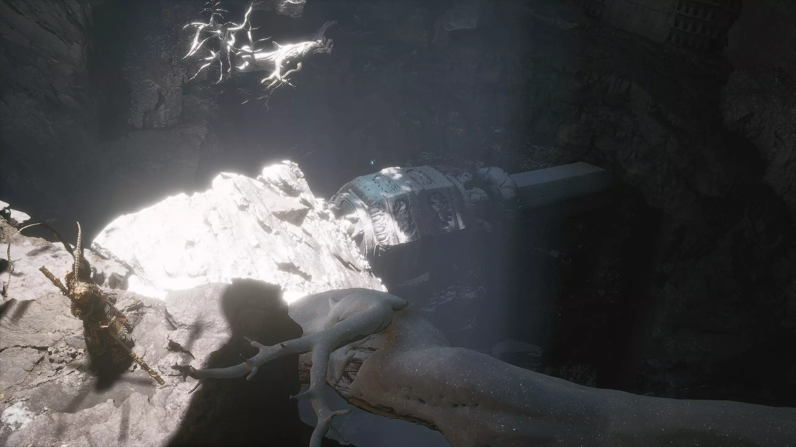 进入岩石上形成的洞口,激活【回溯之路】祭坛。经过祭坛后,沿着小路前往山顶。途中会遇到敌人,我们可以一击将其消灭。在尽头来到阳光明媚的林间空地,激活【纯真之巅】祭坛。激活祭坛后,与悟空石互动,进入其中。里面有游戏的最终 boss【石猴(大圣遗骨)】。