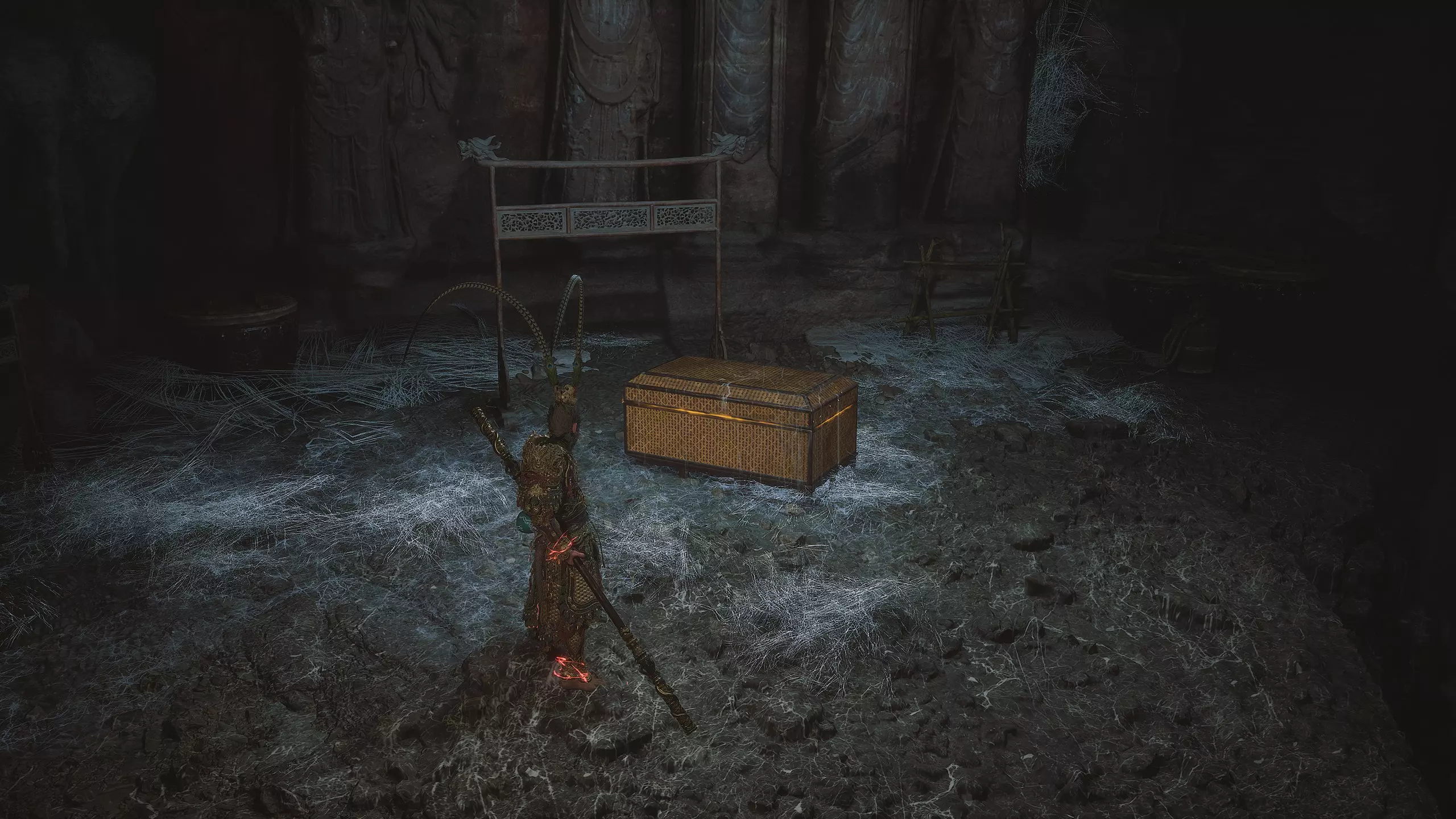 过了桥后进入洞穴。洞内会遇到一座雕像,雕像旁有一个宝箱,里面放着奇物[5/36]——【玻璃圣物匣】