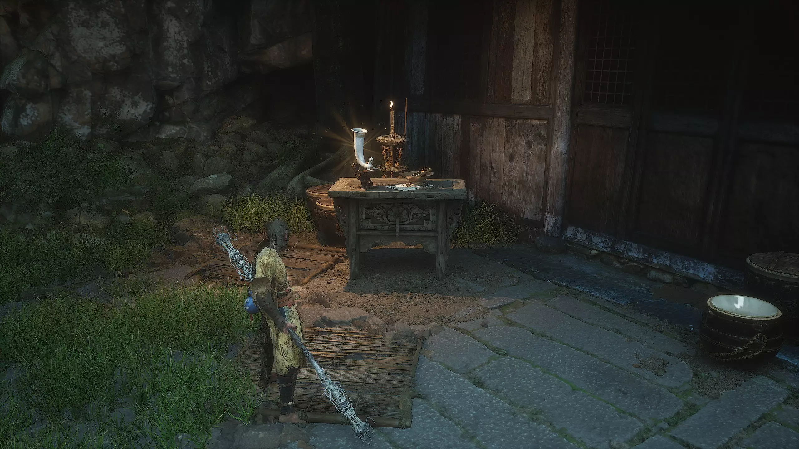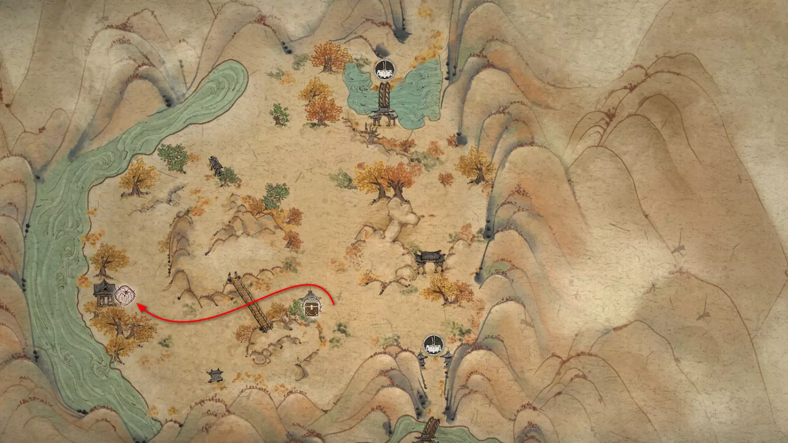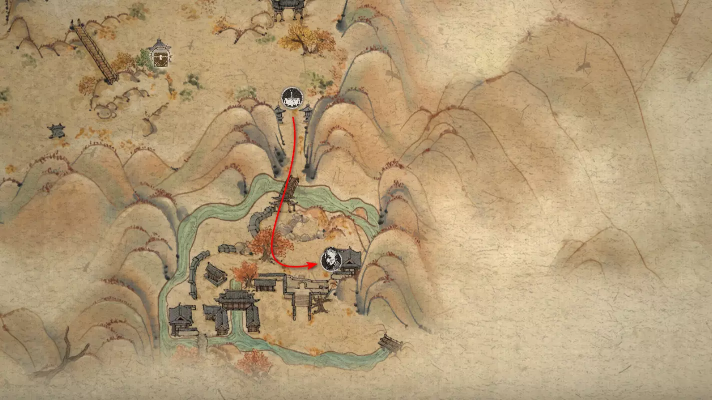 离开村庄,开启【风尽村】祭坛并走过桥梁。下一座桥处有 Boss 等待。击败它可获得其【妖王之魂】[10/54]——“虎之侍从”以及重要物品“旧拨浪鼓”