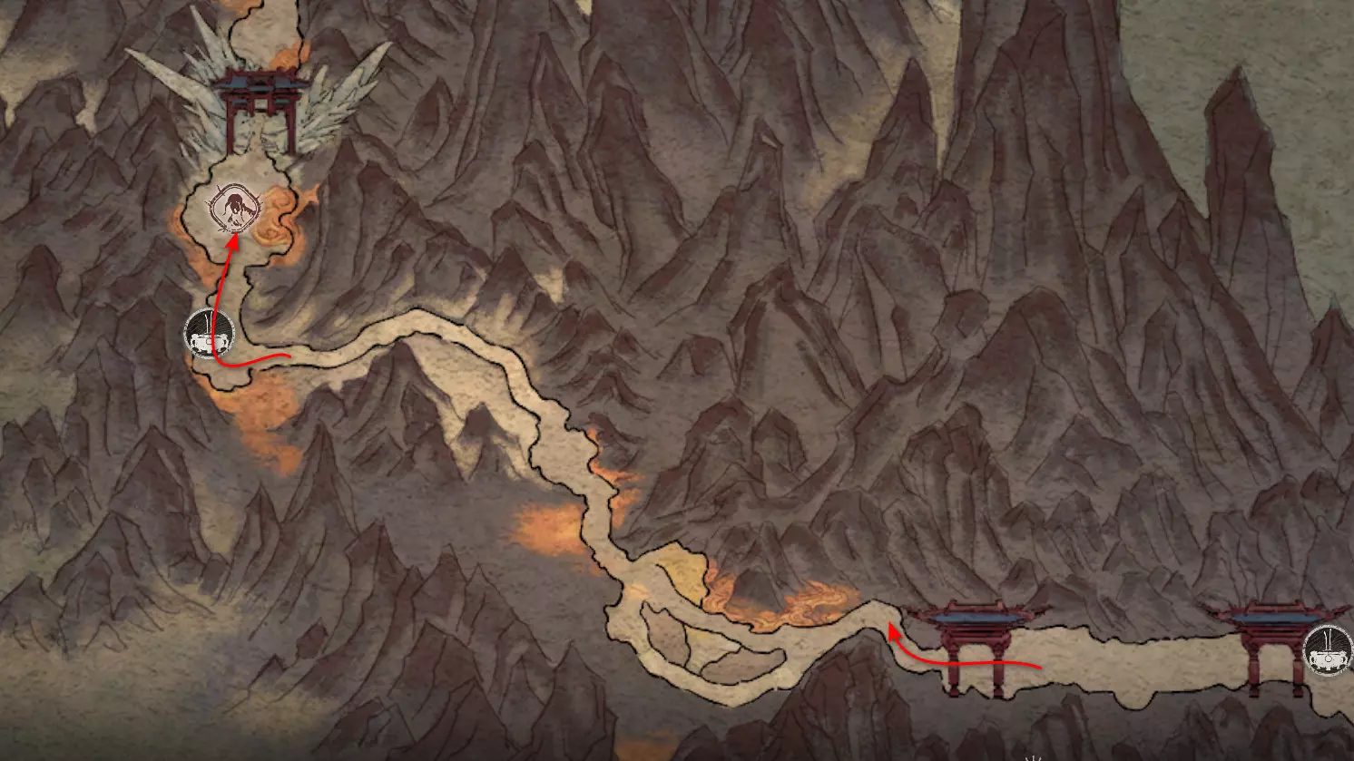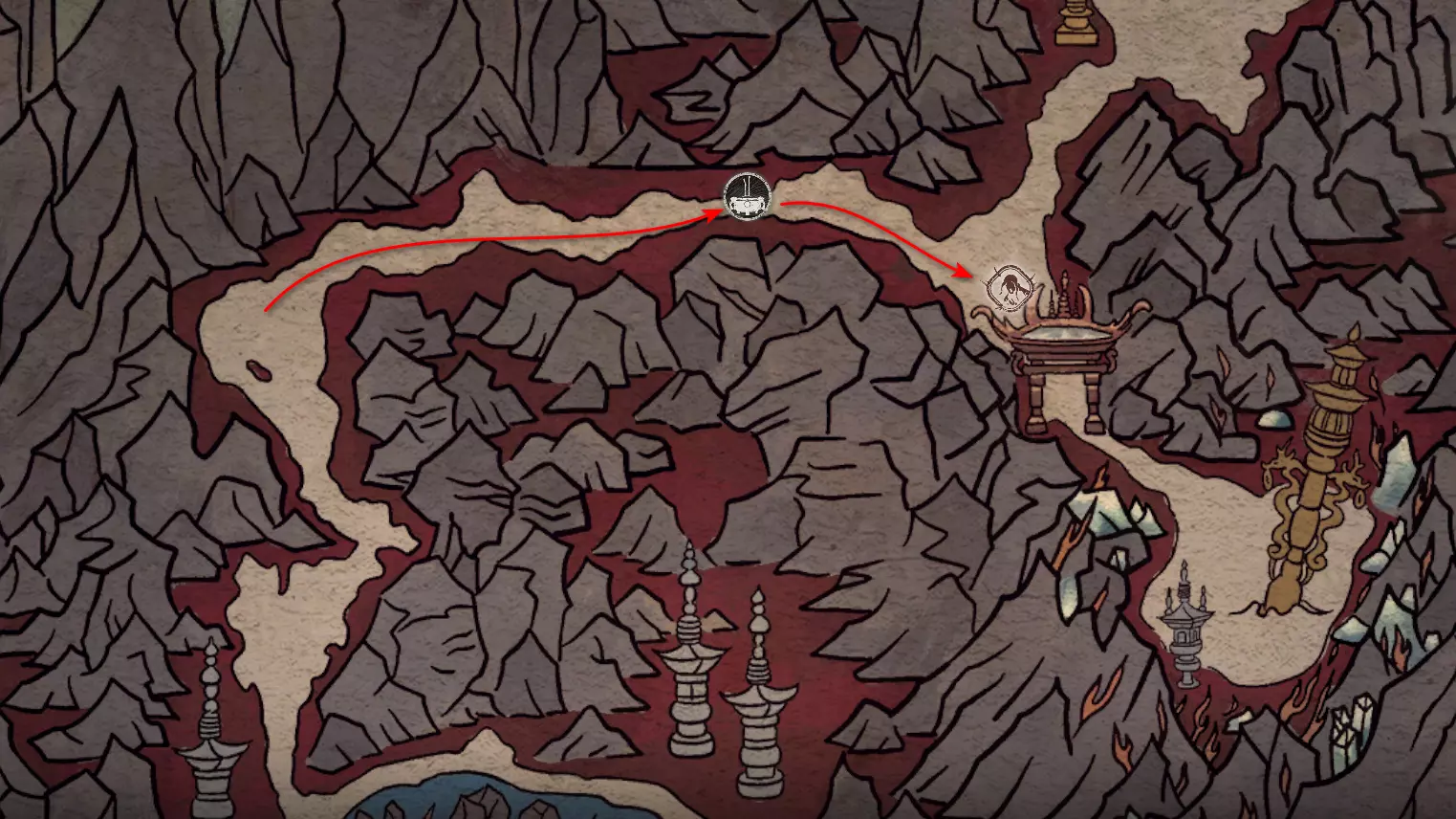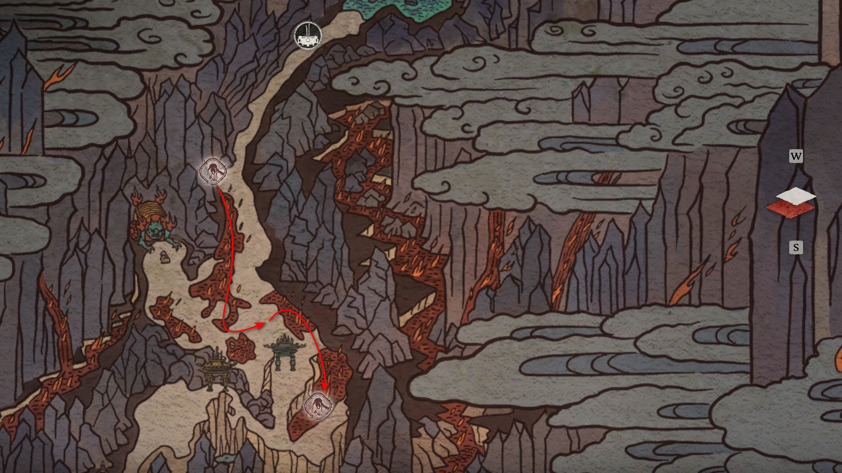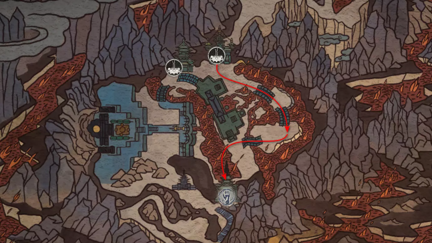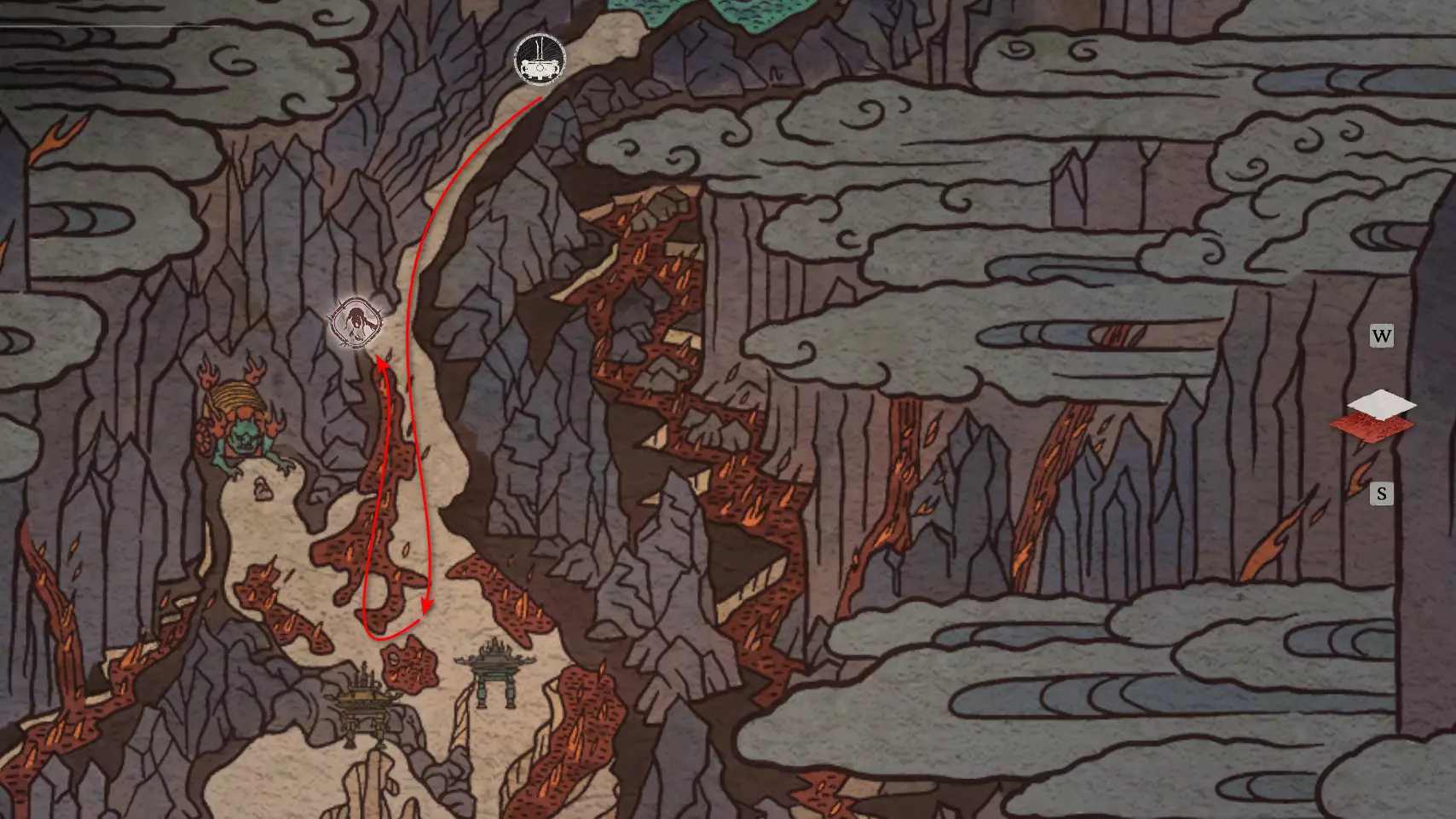 躲避它一直走到路的尽头,那里会触发一段过场动画,动画中狐狸用扇子扑灭了火焰。沿着打开的路径走到【火山口塌陷熔炉】祭坛处。