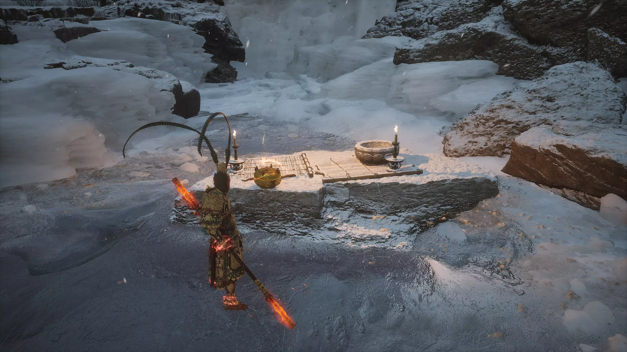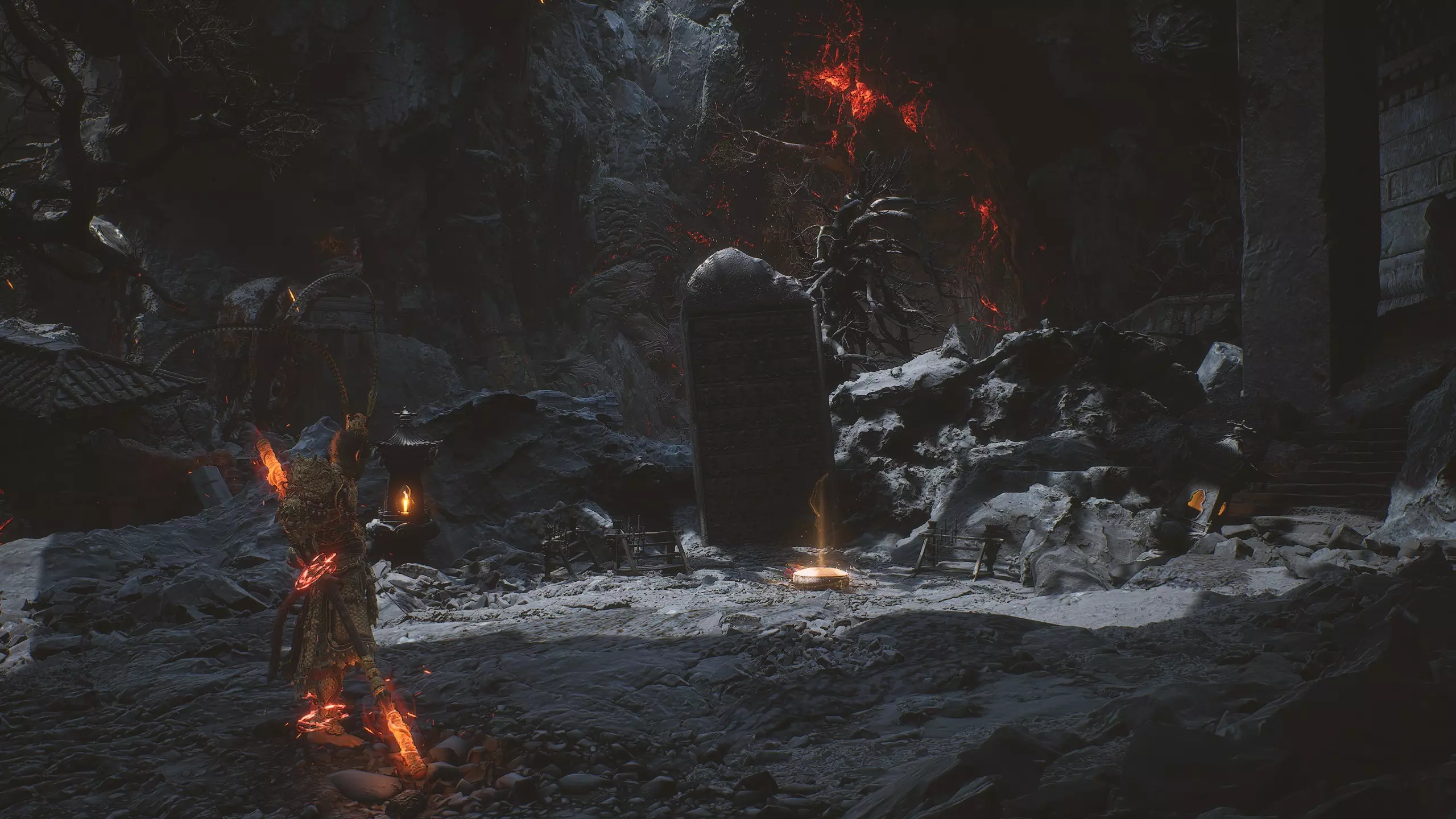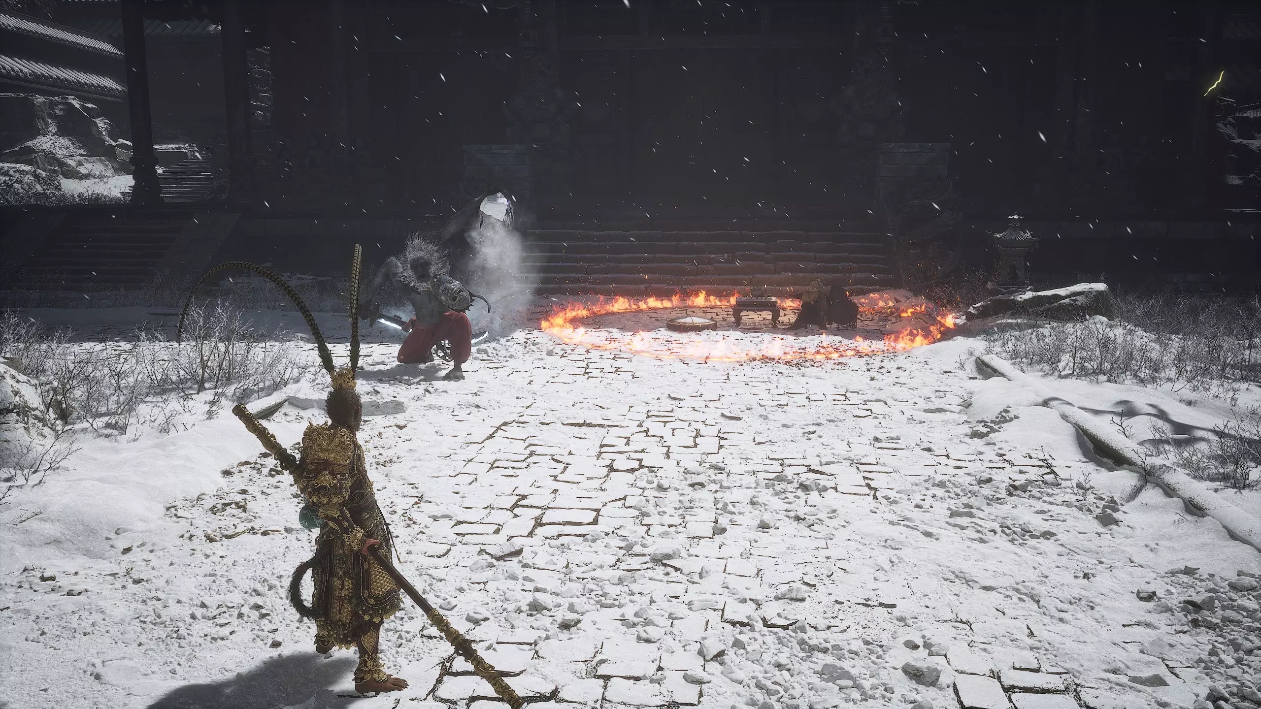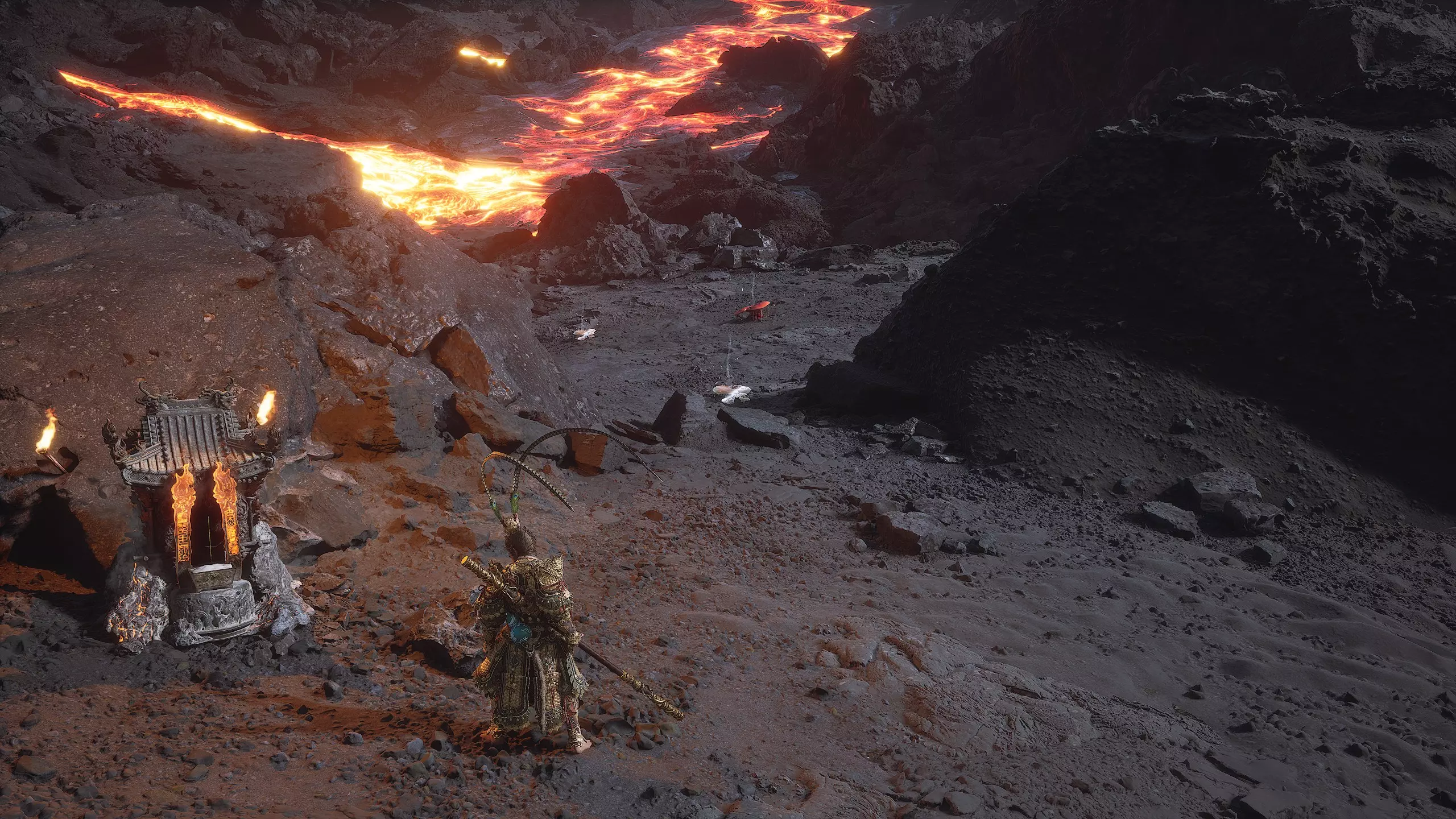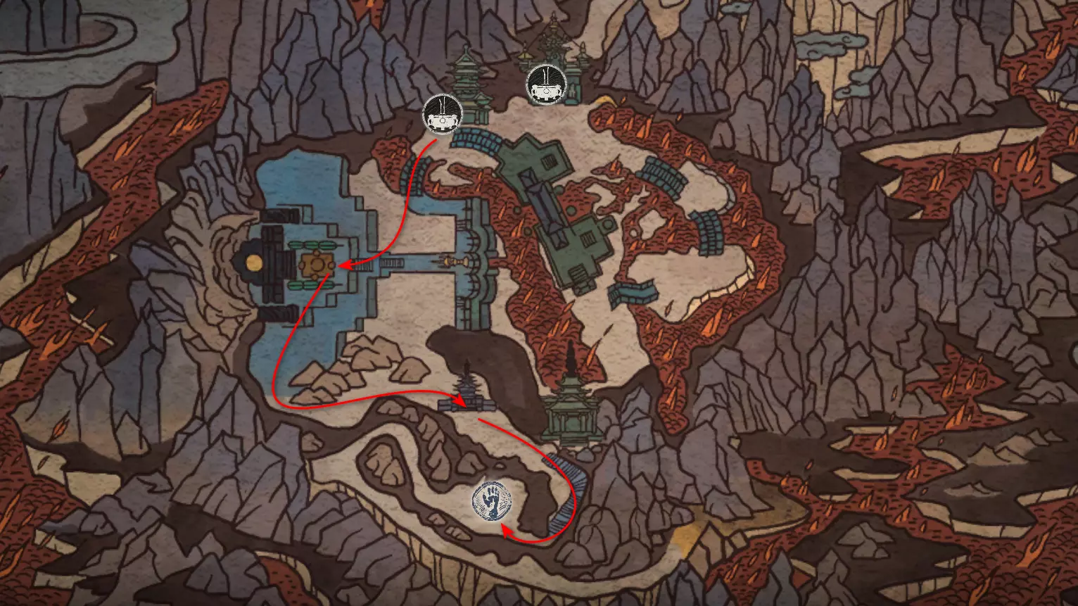 躲避它一直走到路的尽头,那里会触发一段过场动画,动画中狐狸用扇子扑灭了火焰。沿着打开的路径走到【火山口塌陷熔炉】祭坛处。