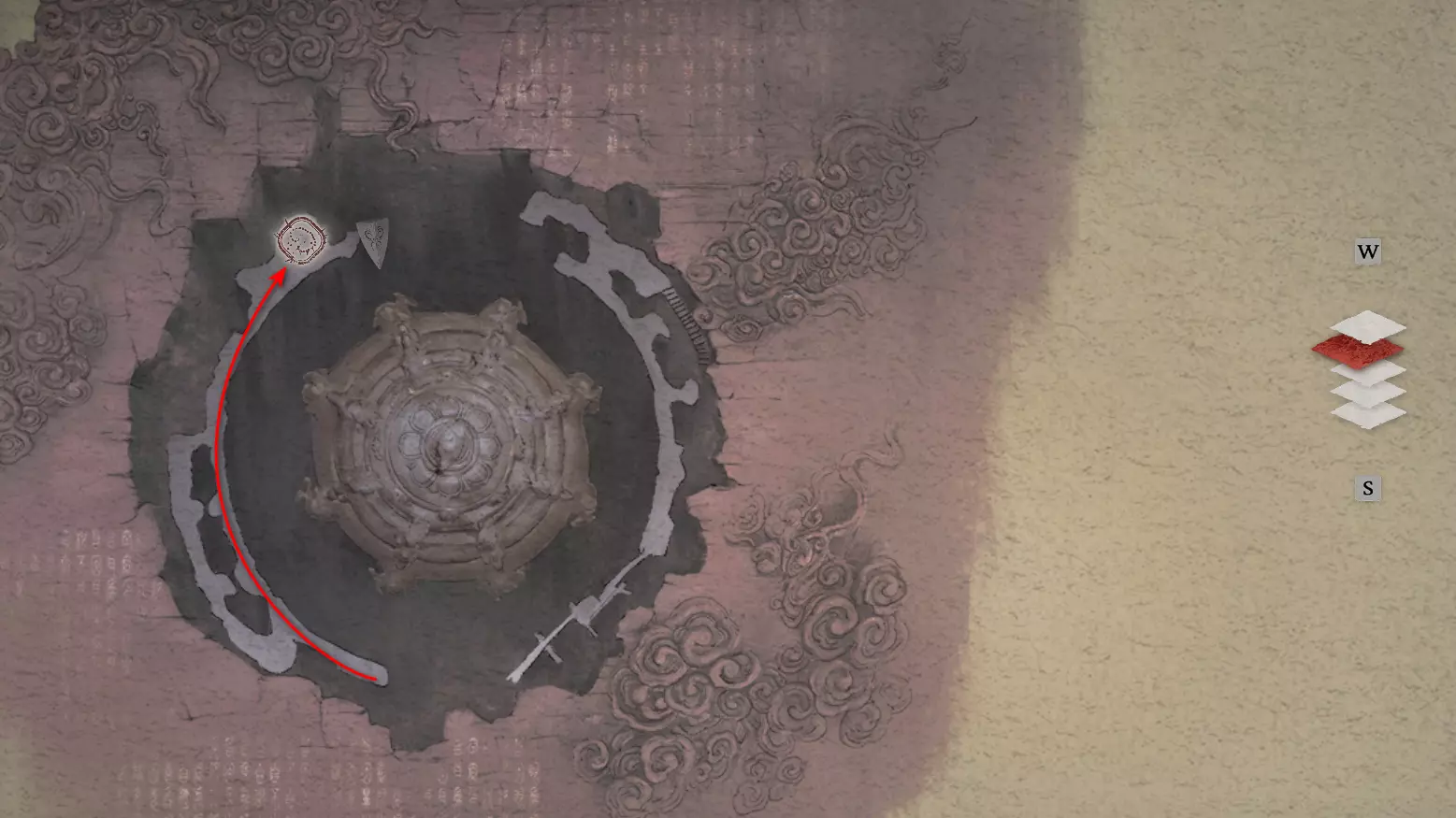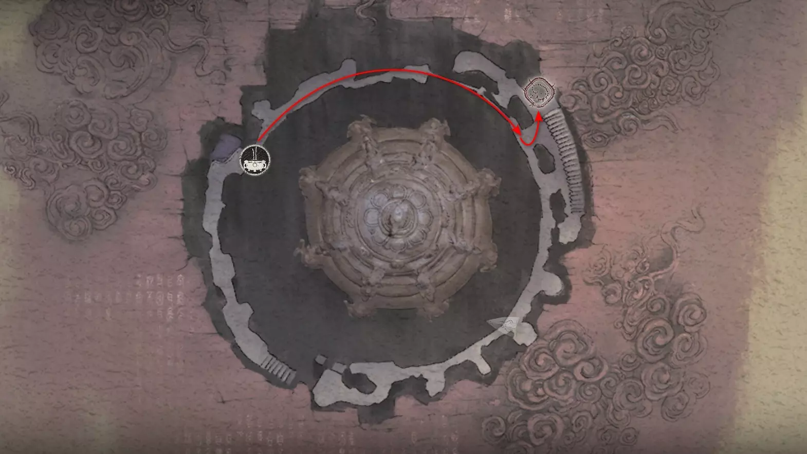 被诅咒的血脉 所有鼠群都已被消灭。 这个竞技场中有一面装饰墙。在与 Boss 战斗时,Boss 可能会将其破坏,或者你可以对其使用【漂泊死灭】自行破坏。墙内可以拾取重要物品【月之鳞】