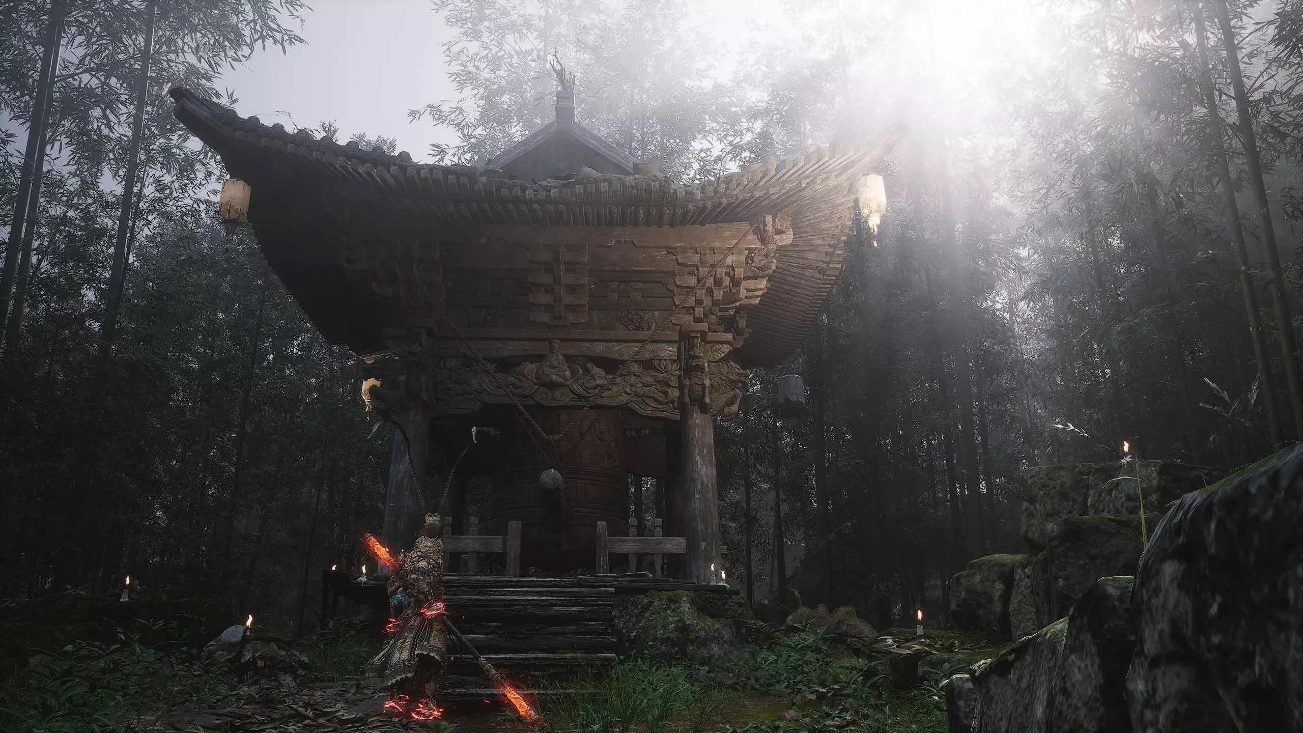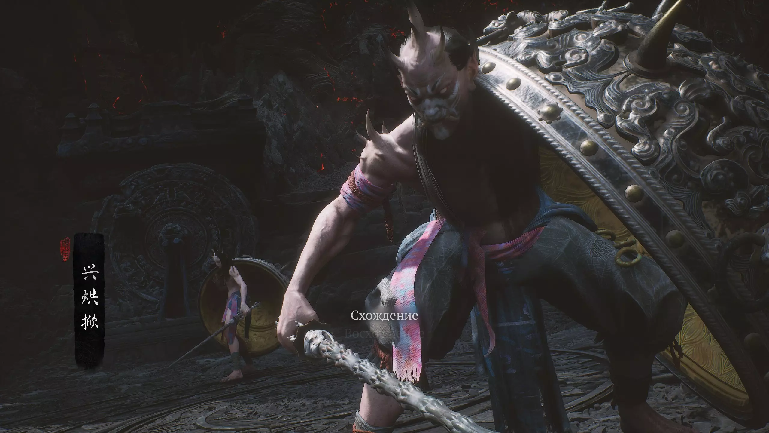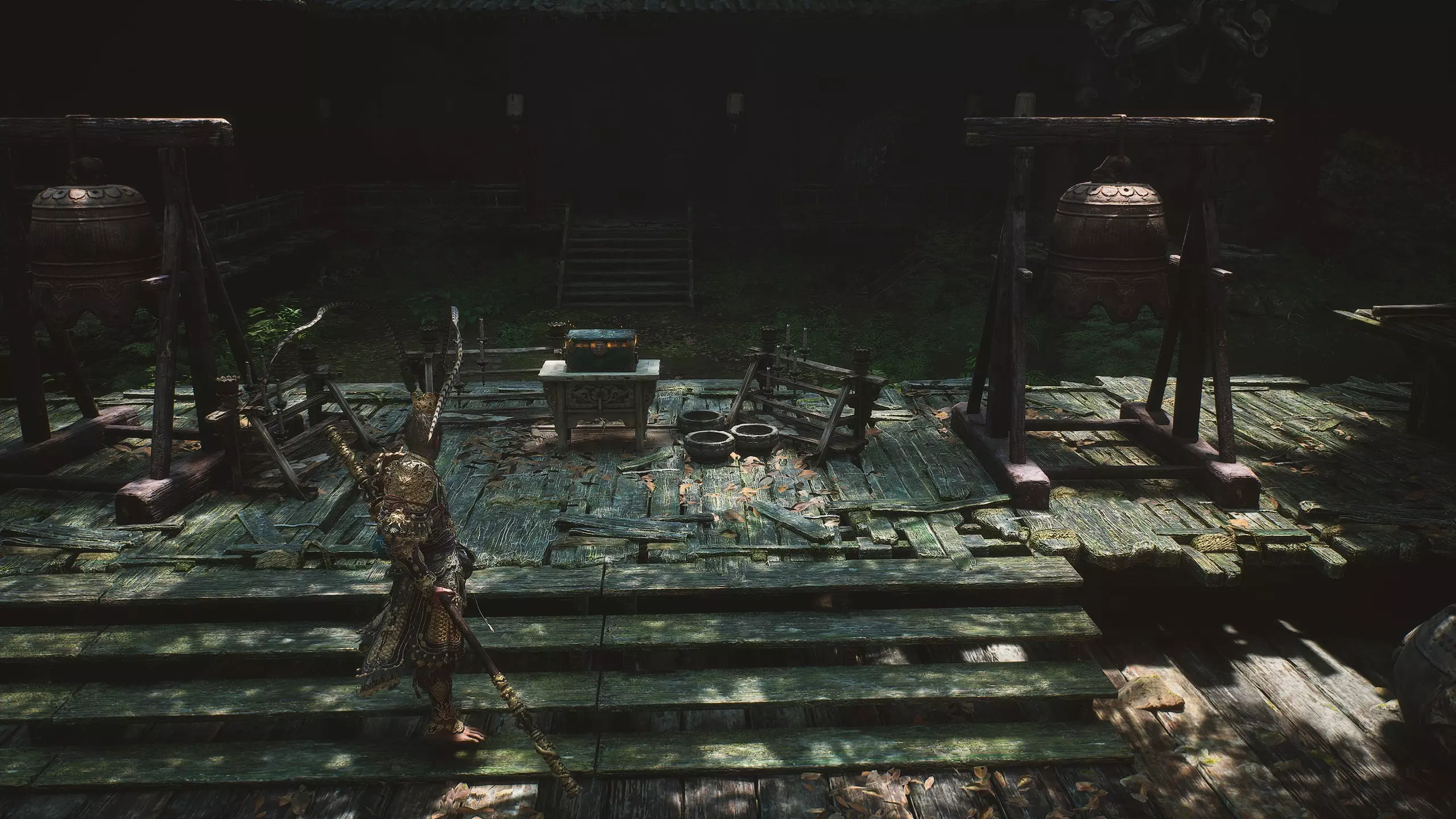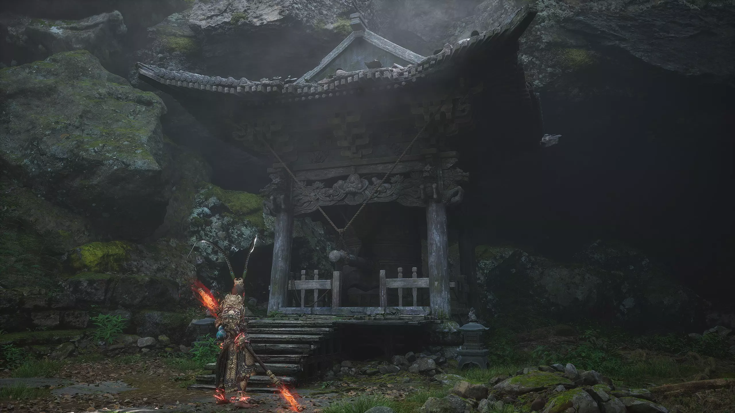 【邪祟之庙】 德高望重的老者久候旅人——终于等来了。 击败敌人后解锁新套装【4/17】: 青铜猴面 青铜缀片战云甲 青铜臂环 青铜战靴 第一章 - 黑风洞 击败首领后,我们会回到第三口钟处。在钟旁检查悬挂的尸体,获得 artifact【1/4】-【火焰披巾】