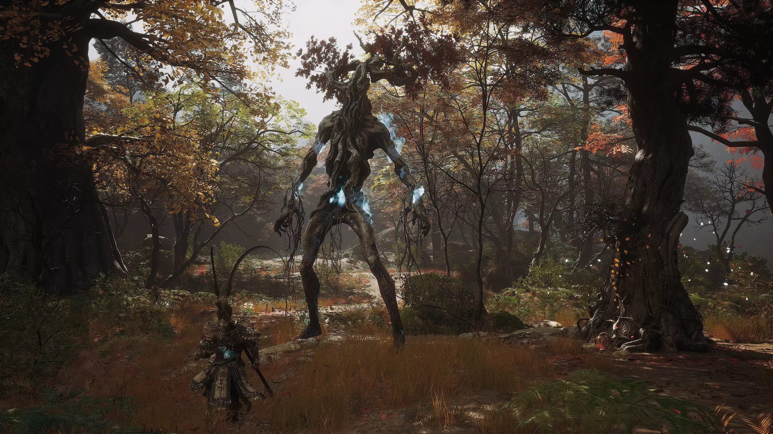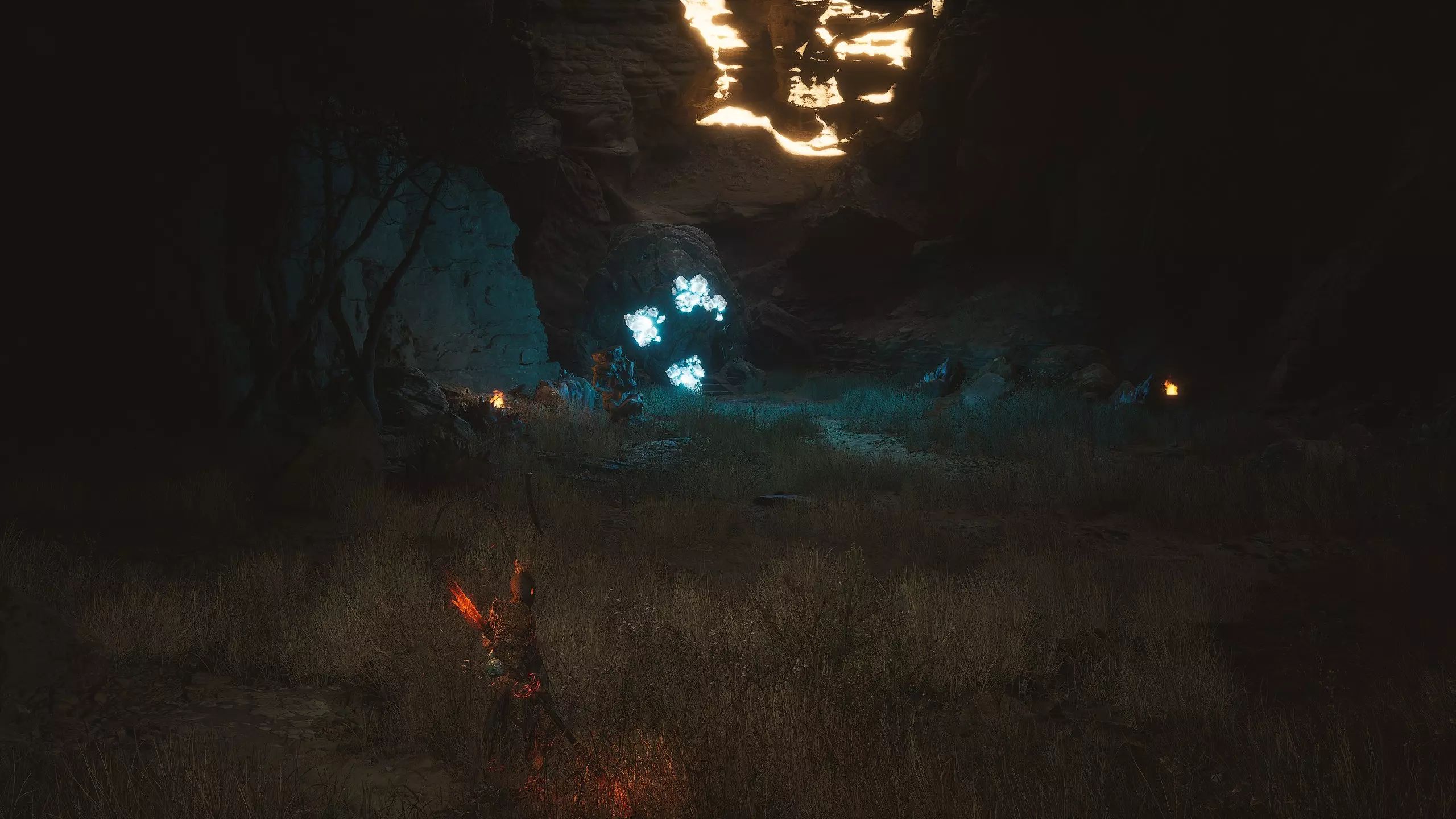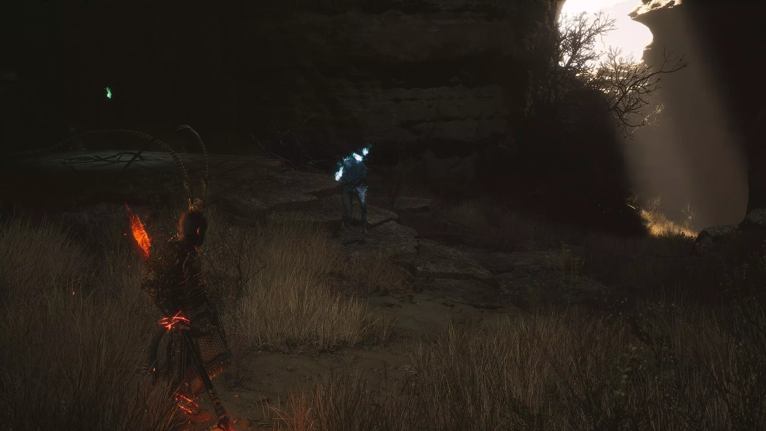 走出洞穴,开启【洞穴(外部)】祭坛。登上木制平台。平台左侧的树旁有一个强大的敌人。击败它可获得【妖王之魂(4/54)-“猎狼者”】。