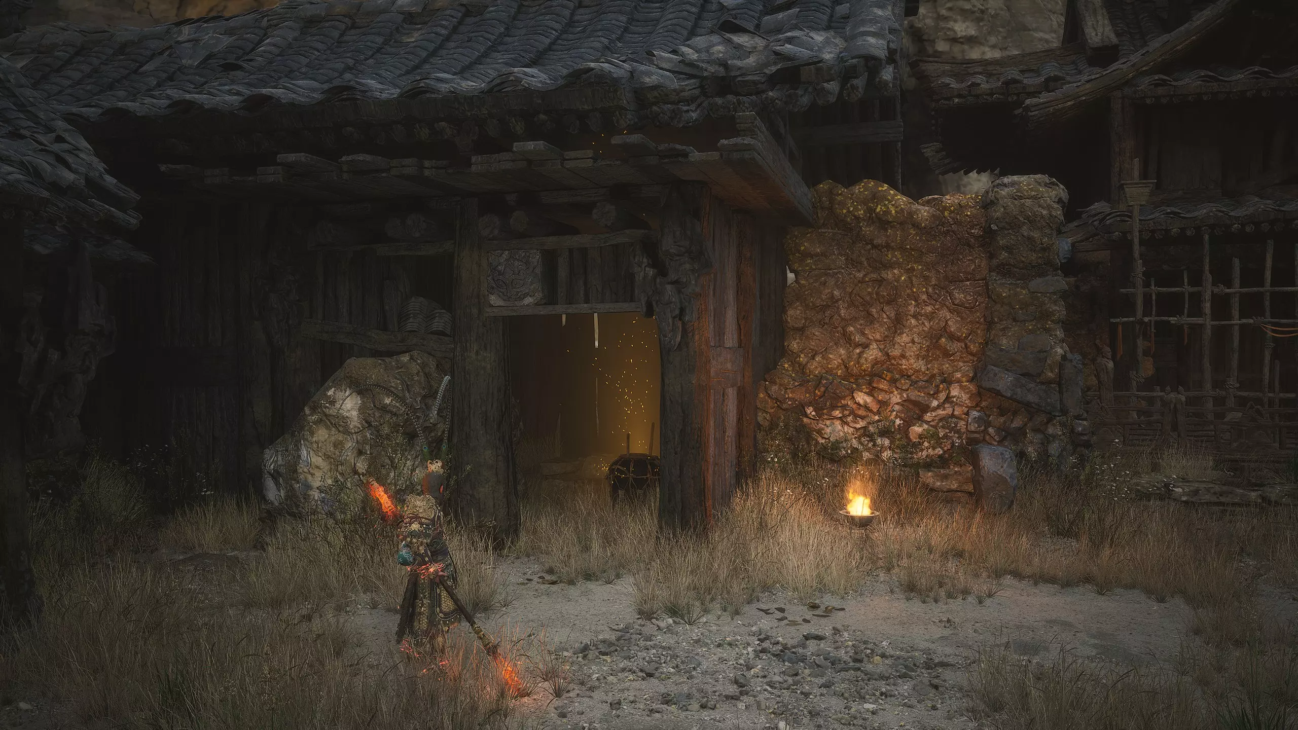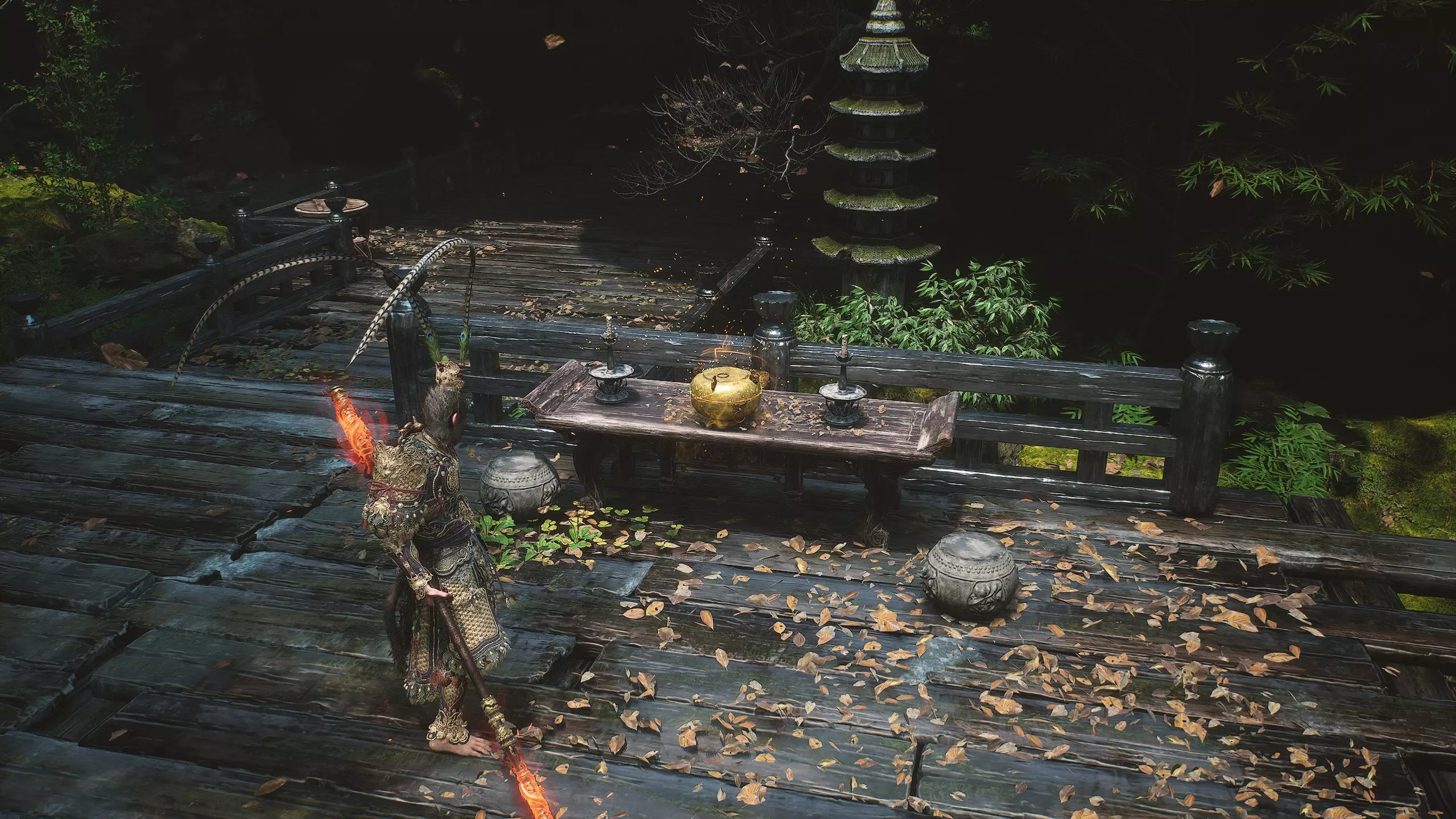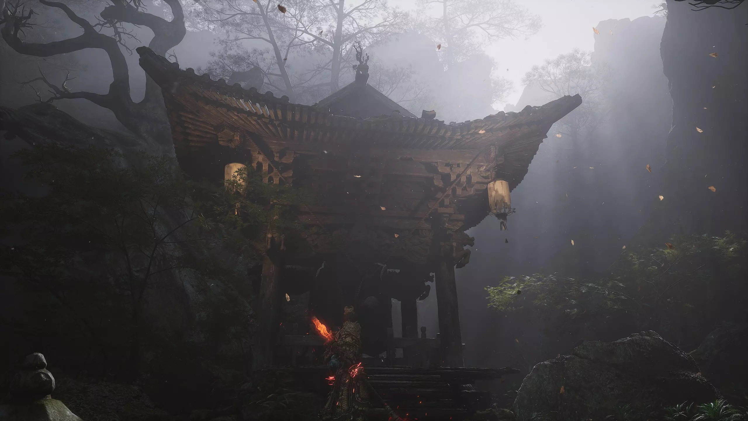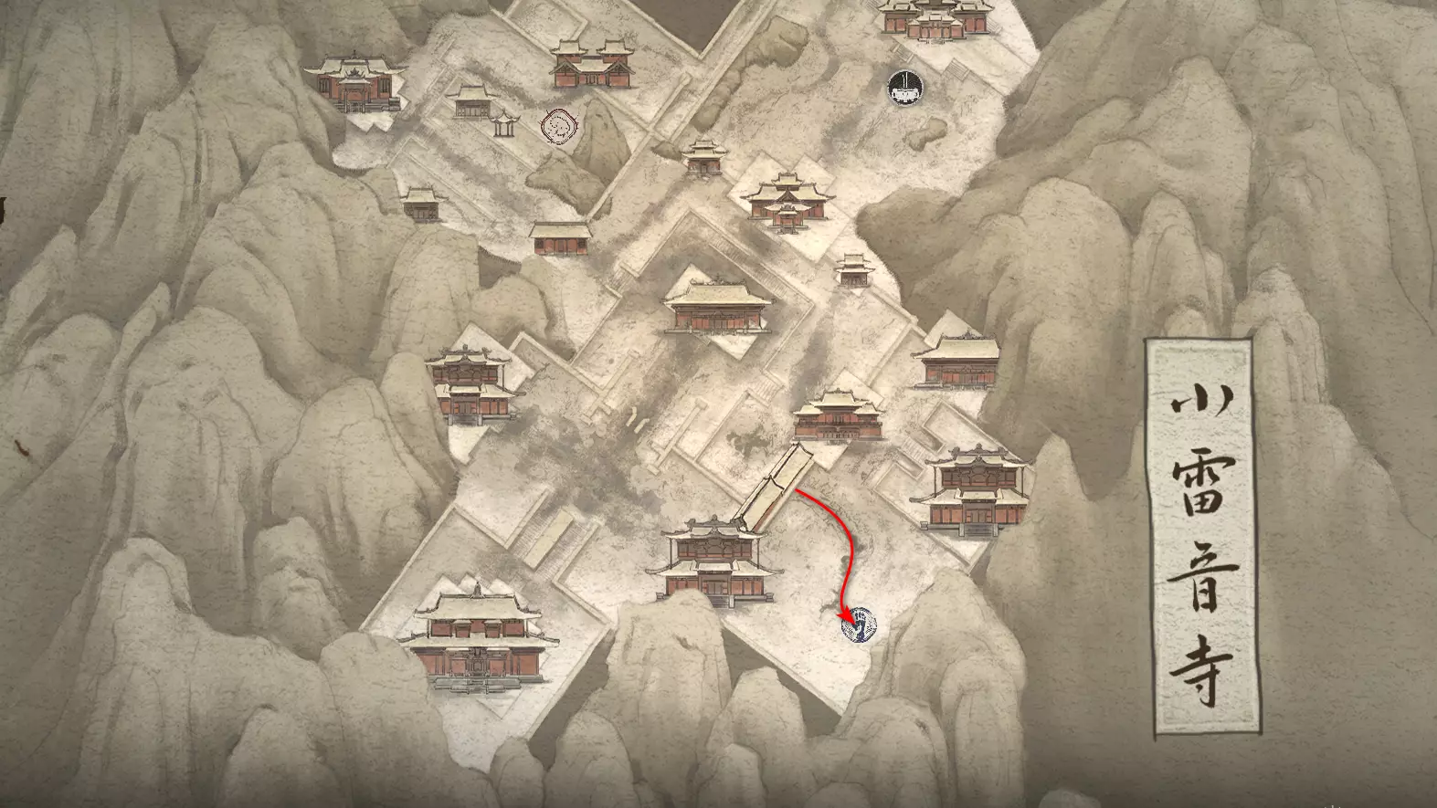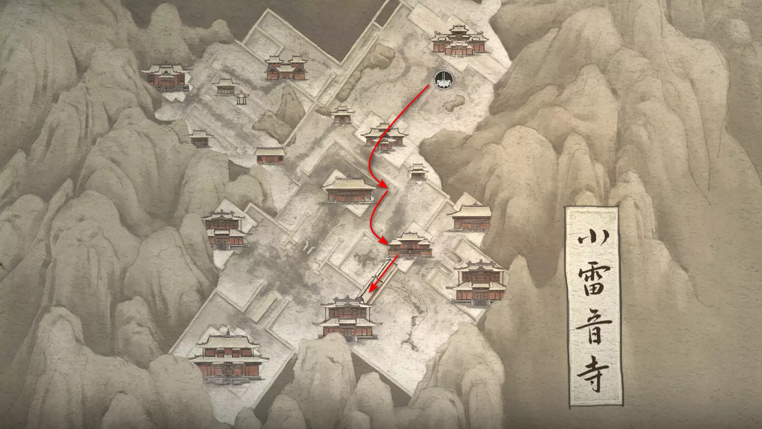 战斗结束后进入门内,沿着悬崖边的木制栈道前行,直至抵达一座寺庙。在寺庙内开启【观音殿】祭坛,祭坛上会出现新的套装盔甲[2/17]: 朝圣者头环 朝圣者服饰 朝圣者腕带 朝圣者绑腿 接着前往【林秀慈】Boss的战斗区域。击败Boss后可获得盔甲部件[1/11]:灰狼面具(头部)