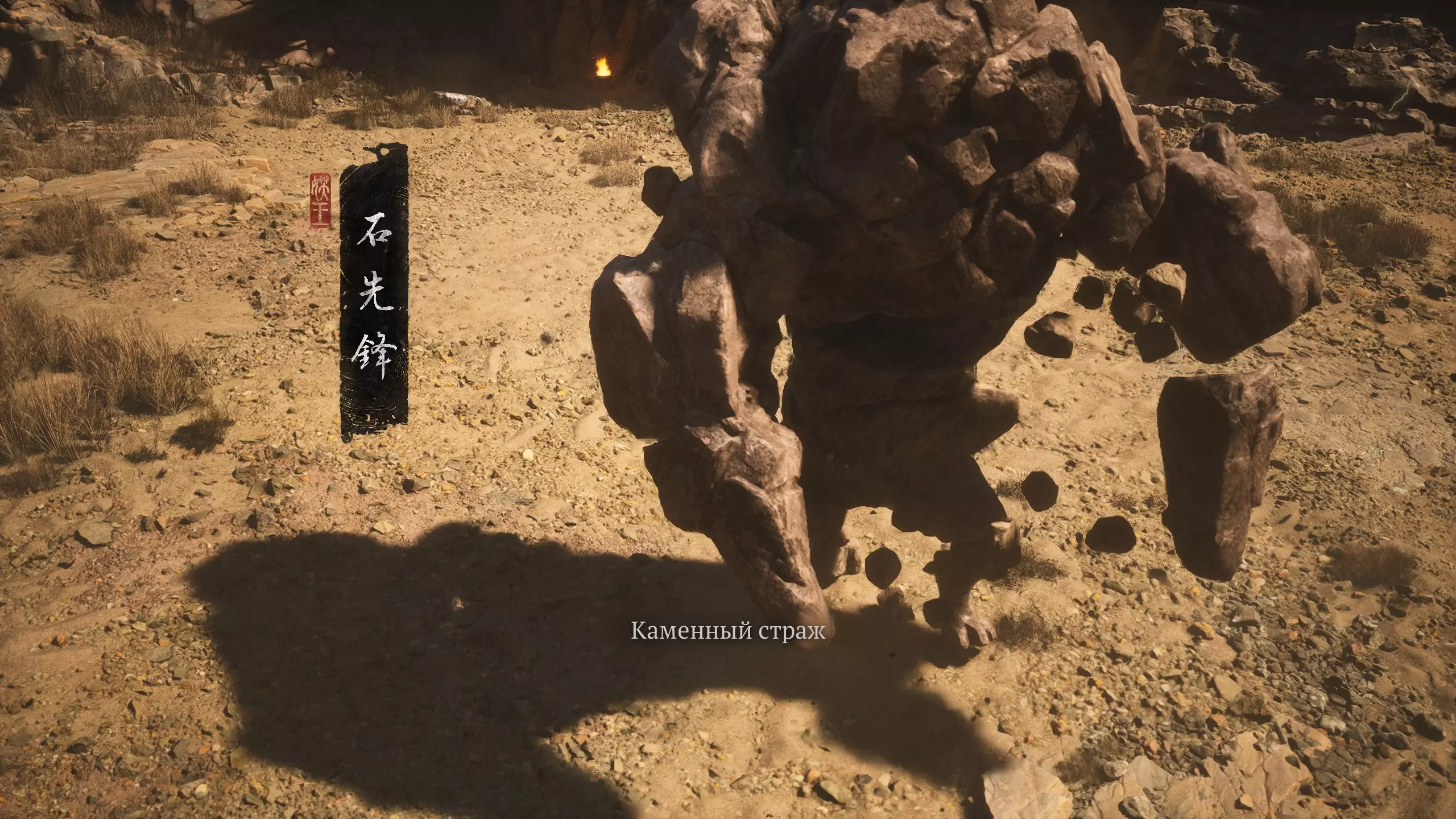 我们下去进入峡谷。那里会有人叫我们。这是石人角色。和他对话并把【石头精华】物品交给他。战斗就会开始。