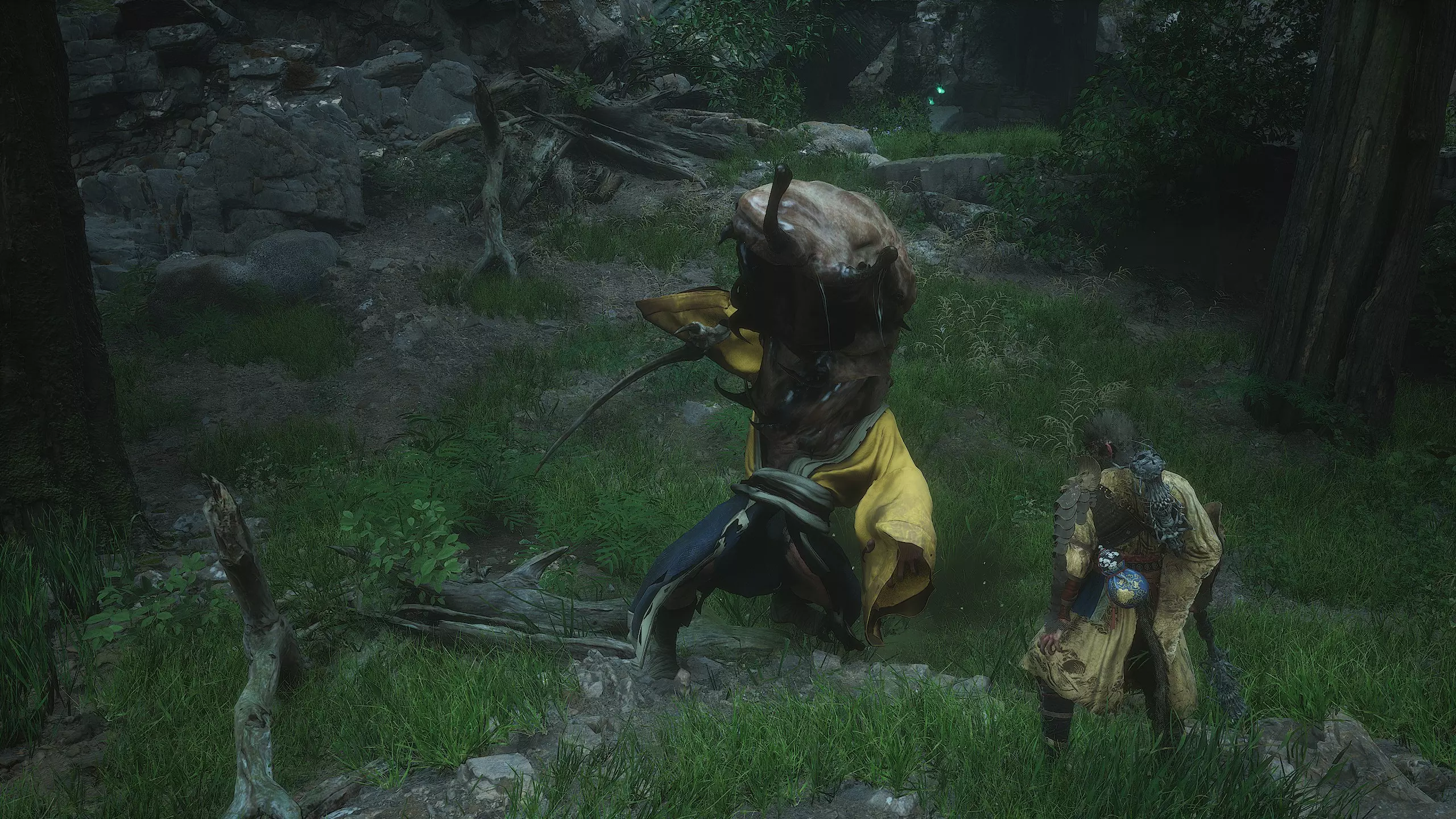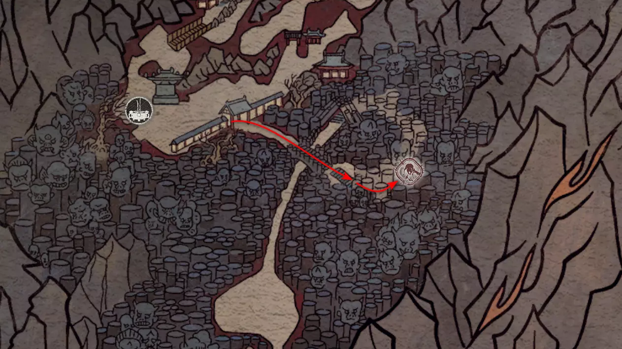 吸收与成长 吞噬那些曾吞噬他人的存在。 获胜后,沿着水路继续前进,从悬崖跳下。进入竹林后,沿着左侧边缘向出口移动。出口处有两尊雕像作为标记,可借此辨认方向。出口处将迎来一场 boss 战。击败 boss 后,将获得其【妖王之魂(3/54)-“观帽”】。