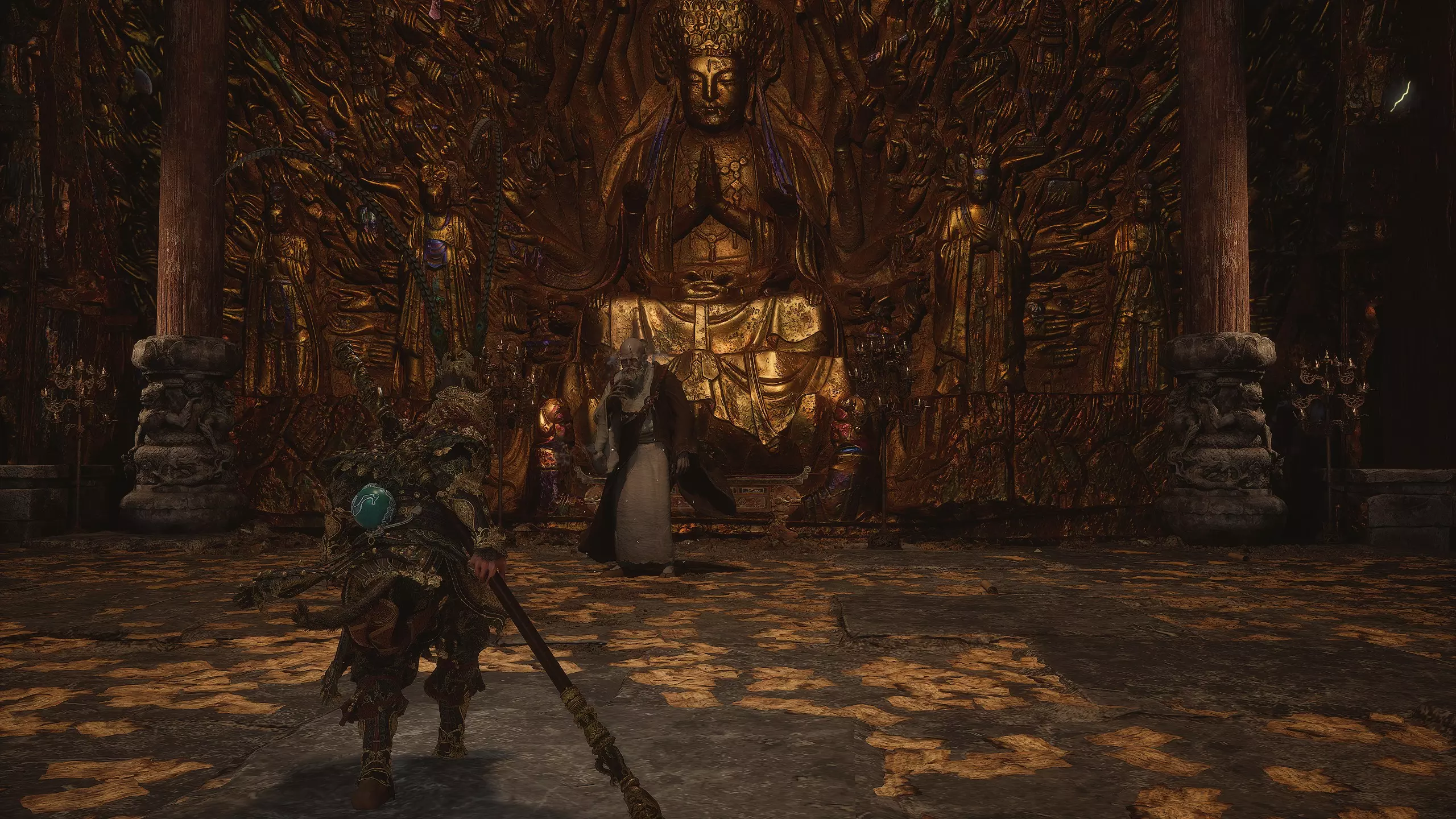 悠长回响 听到钟声后,消散的魂魄被其震慑。随后我们将被传送到一个秘密地点——【观音古寺】。 第一章 - 观音古寺(秘密) 进入寺庙后,打开“主殿”祭坛。右侧的一个宝箱中可以获得 armor piece [2/11] - 观音护腕(手部)。接下来是与 boss“敬爱的金池长老”的战斗。