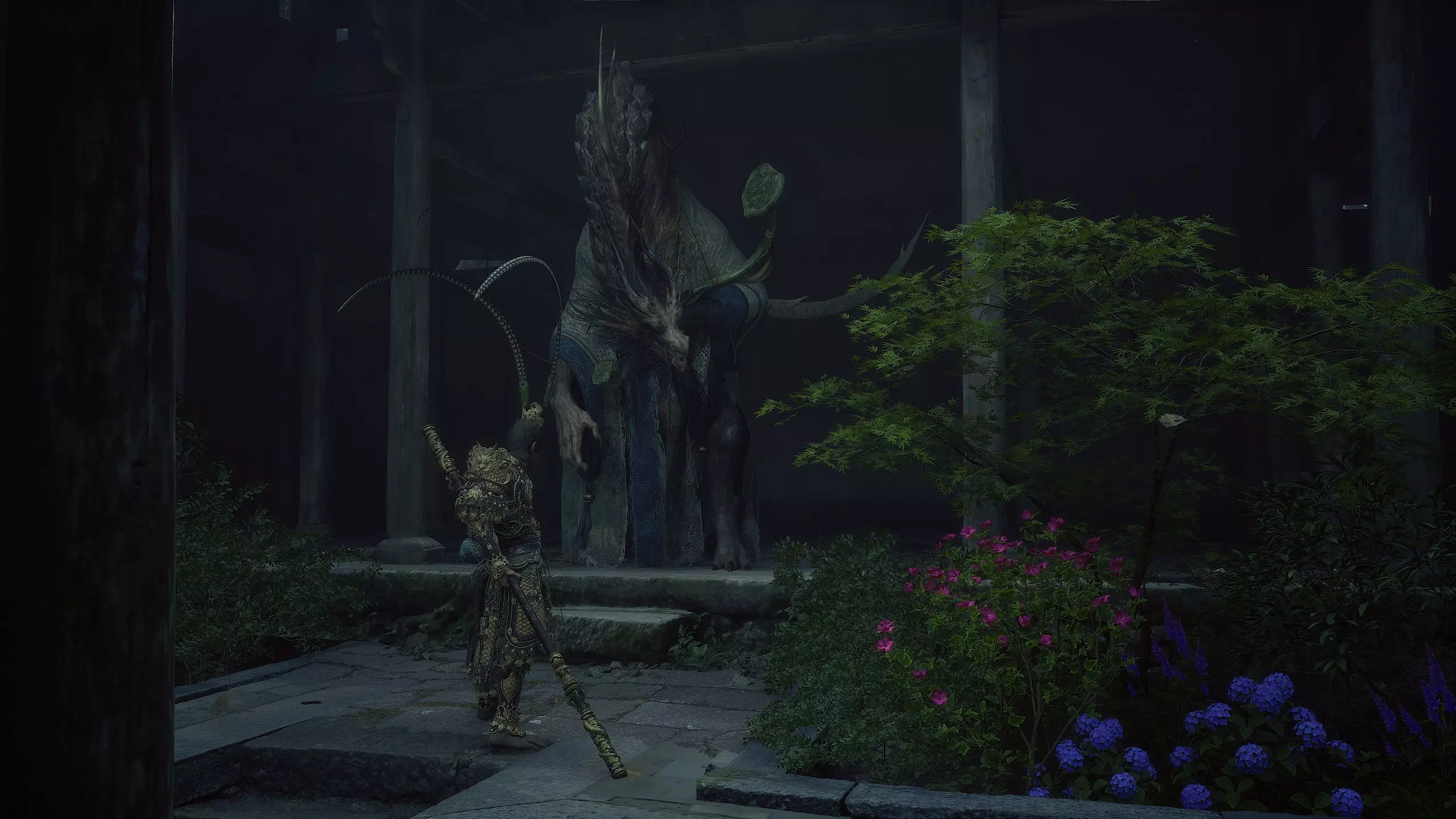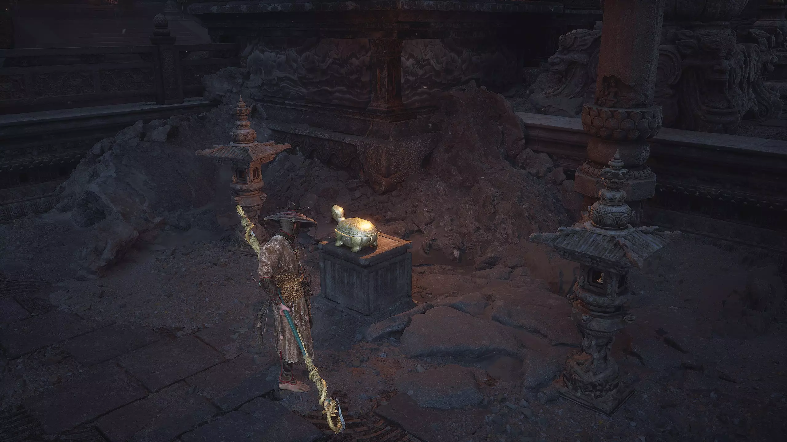 忠诚的战士 “我在此,只为侍奉我的主人。我将永远为他效力。” 返回【琉璃殿】祭坛。穿过宫殿,在出口处找到此前躲避的宝珠。拾取该宝珠可获得【妖王之魂】[53/54]——“升坠”