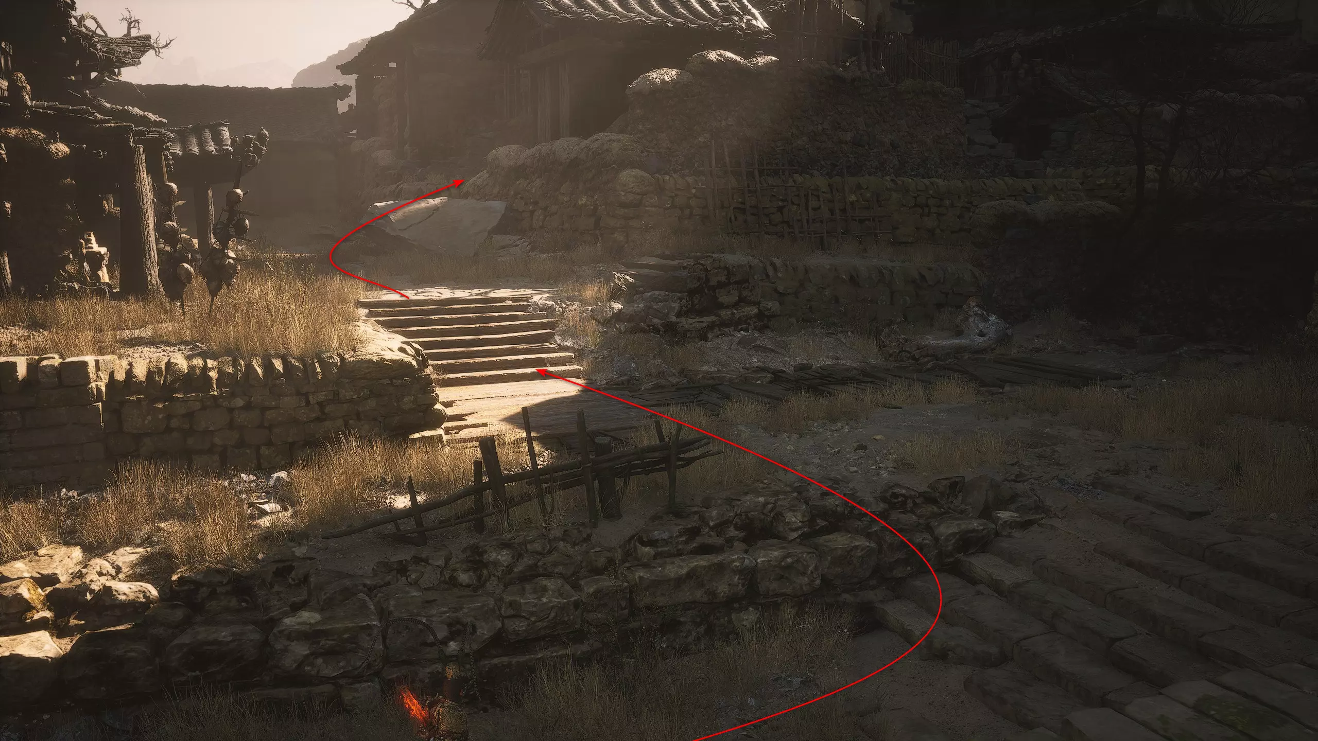 再次回到洞穴,然后从右侧的石阶向上走。沿着木板路向前行进。在顶部我们会遇到一堵墙。从右侧绕过它,让栅栏始终在左侧。最终我们会到达村庄的这个封闭区域,并遇到名为【大地之狼】的 Boss。击败它后获得【5/54 妖王之魂】——【大地之狼】
