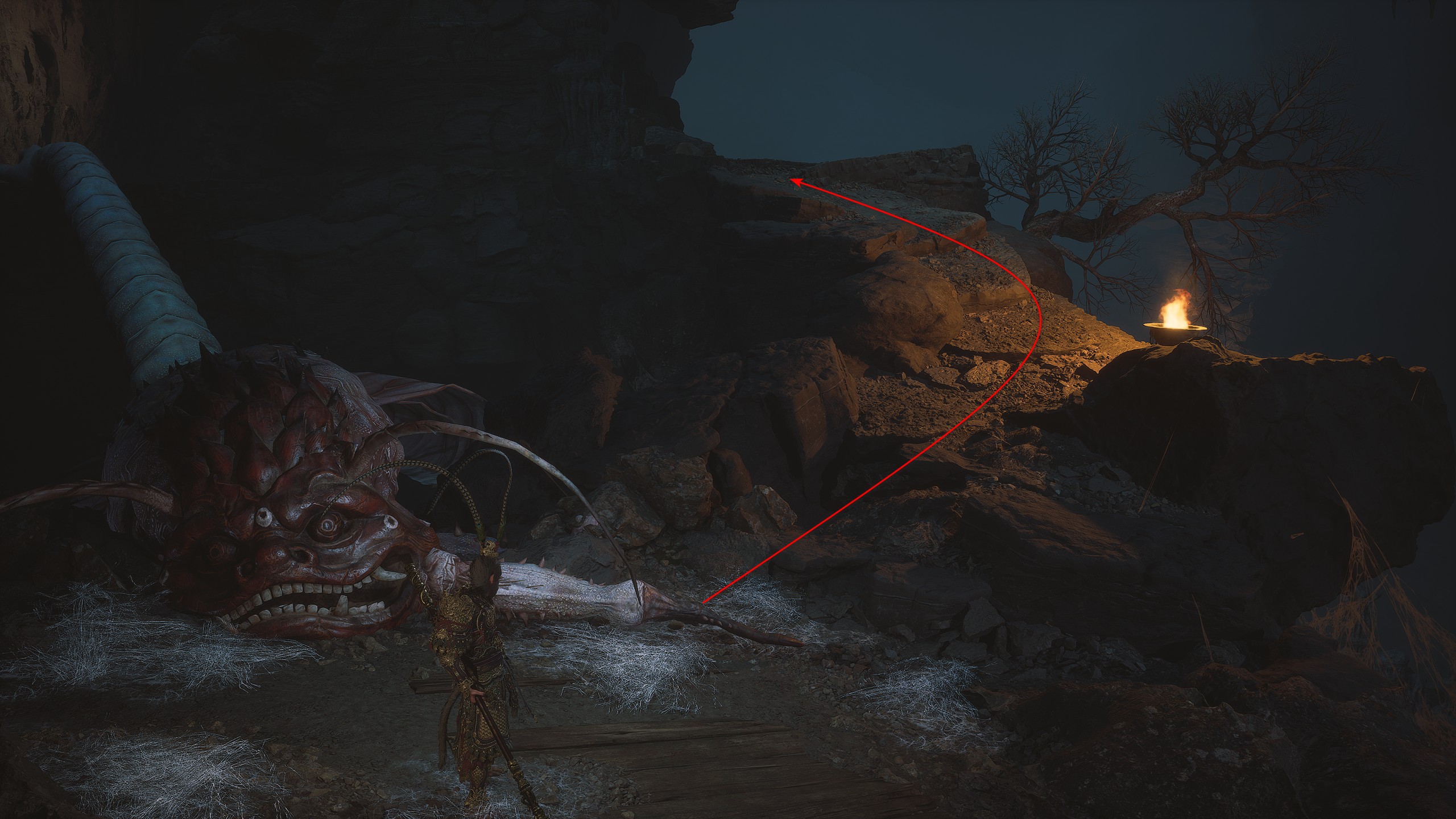 利爪囚笼 烟雾越来越浓!雷声轰鸣——听到了吗? 回到第二章的【绝望山谷】祭坛。穿过洞穴,在尽头钻进墙壁上的狭窄裂缝。会遇到一个强大的敌人。击败他后可获得【妖王之魂】[8/54]——“迅捷飞鼠”