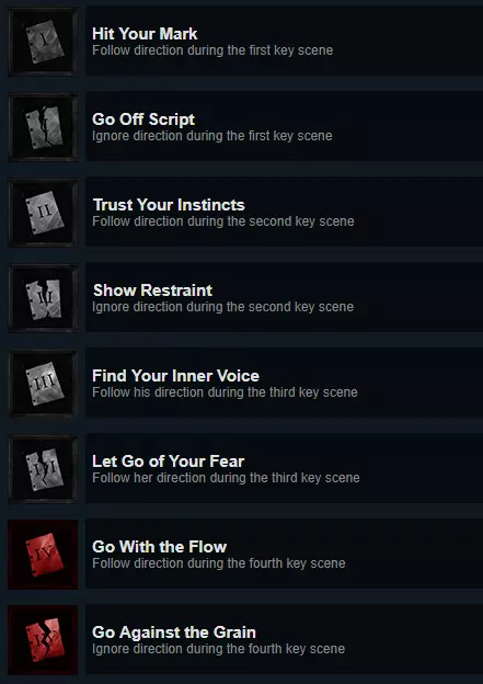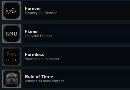 结局仅与你在每个章节中的选择有关。 结局1:至少违背三次导演的指令,主角为女性。 结局2:至少遵从三次导演的指令,主角为男性。 结局3:两次违背且两次遵从,主角死亡。 收集成就
