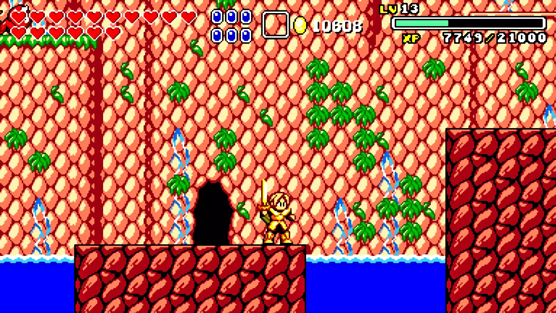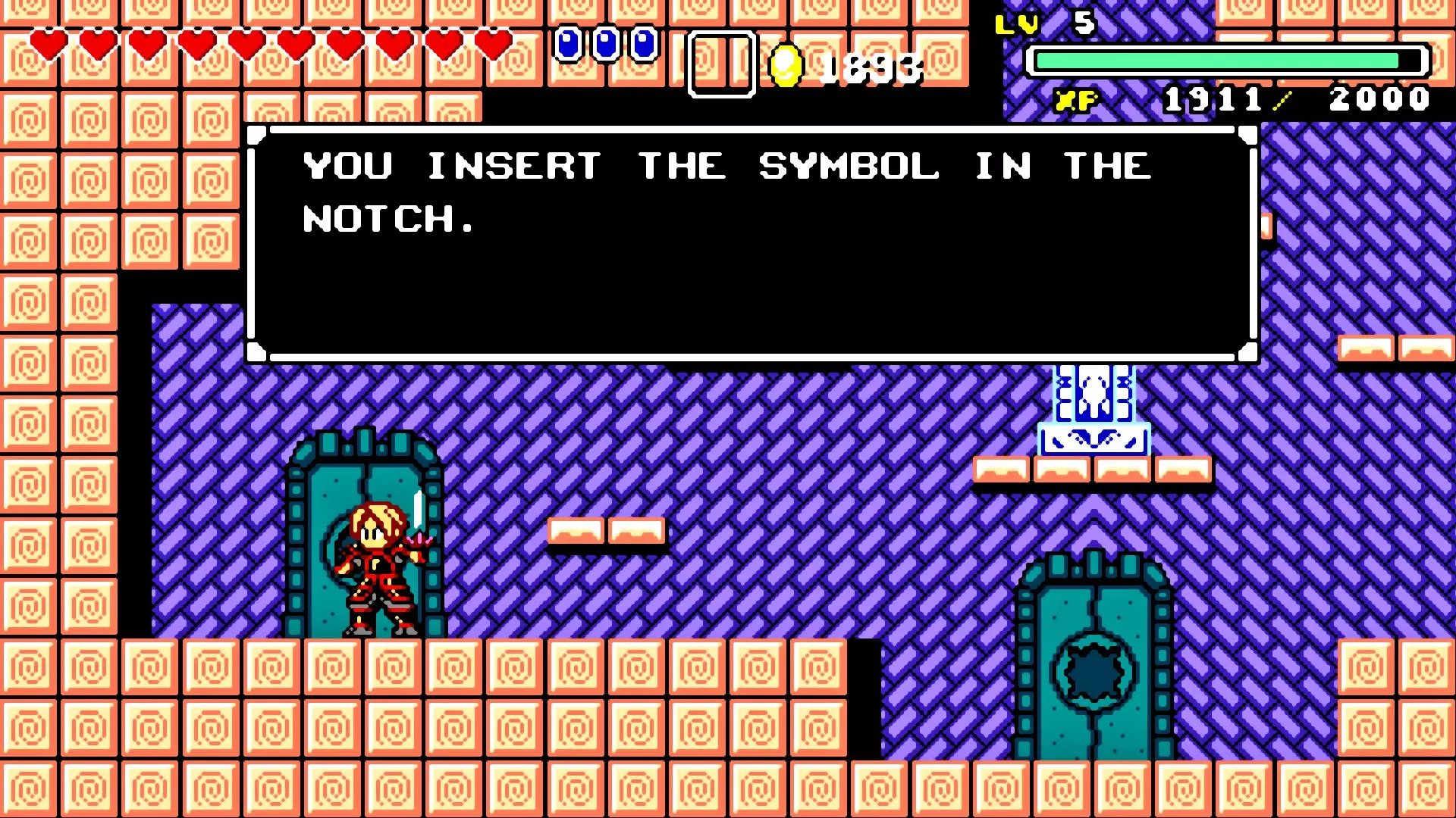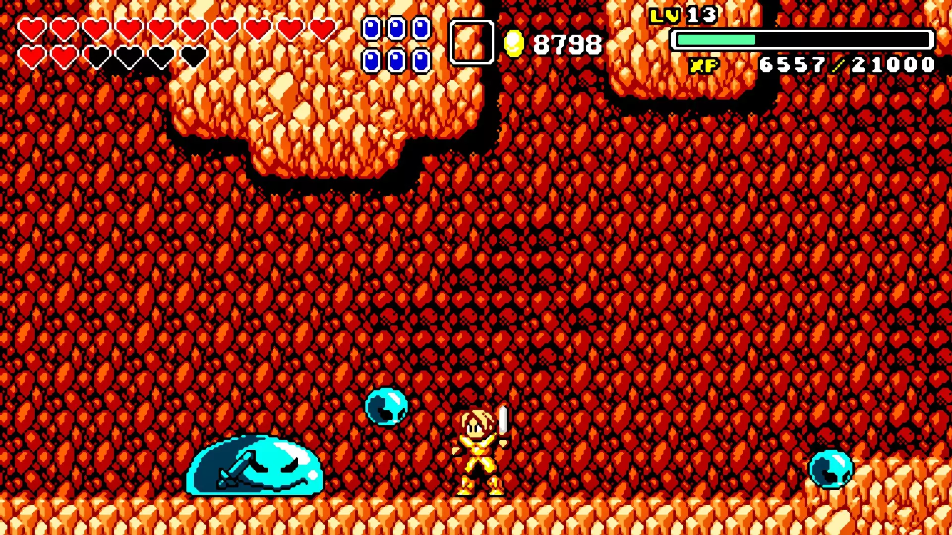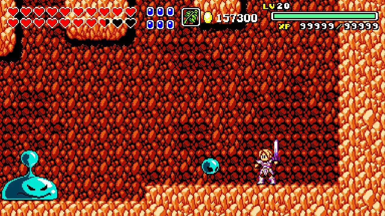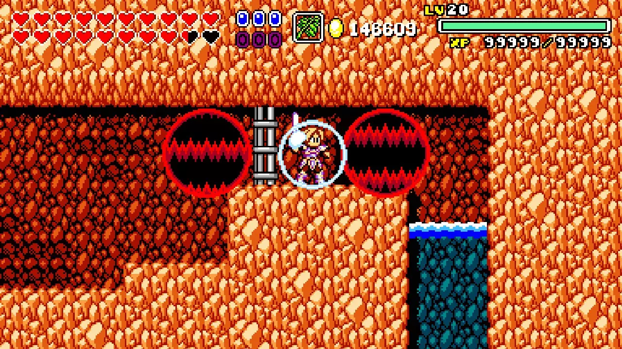 前往前一扇门,走到水边后向左走,使用水之戒,接着使用火之戒。现在跳进洞里,装备铁剑,击败巨型史莱姆以获得【破碎的阿格洛斯之剑】。