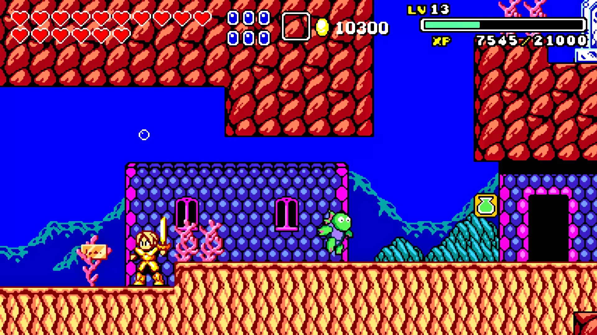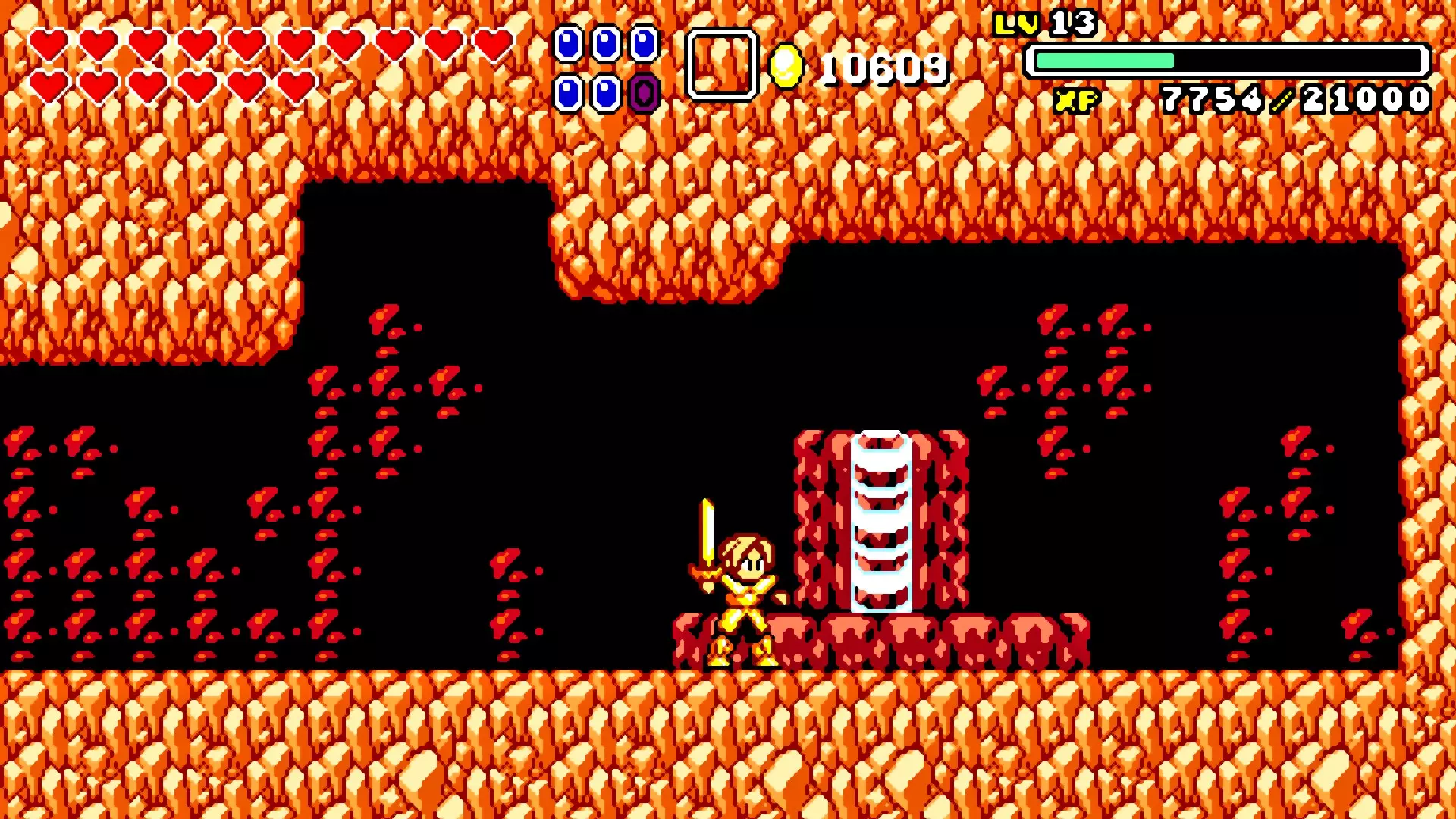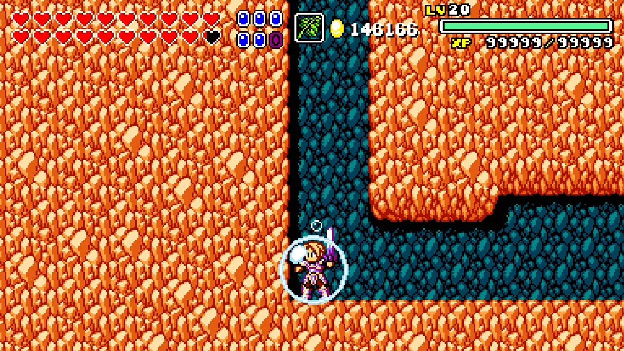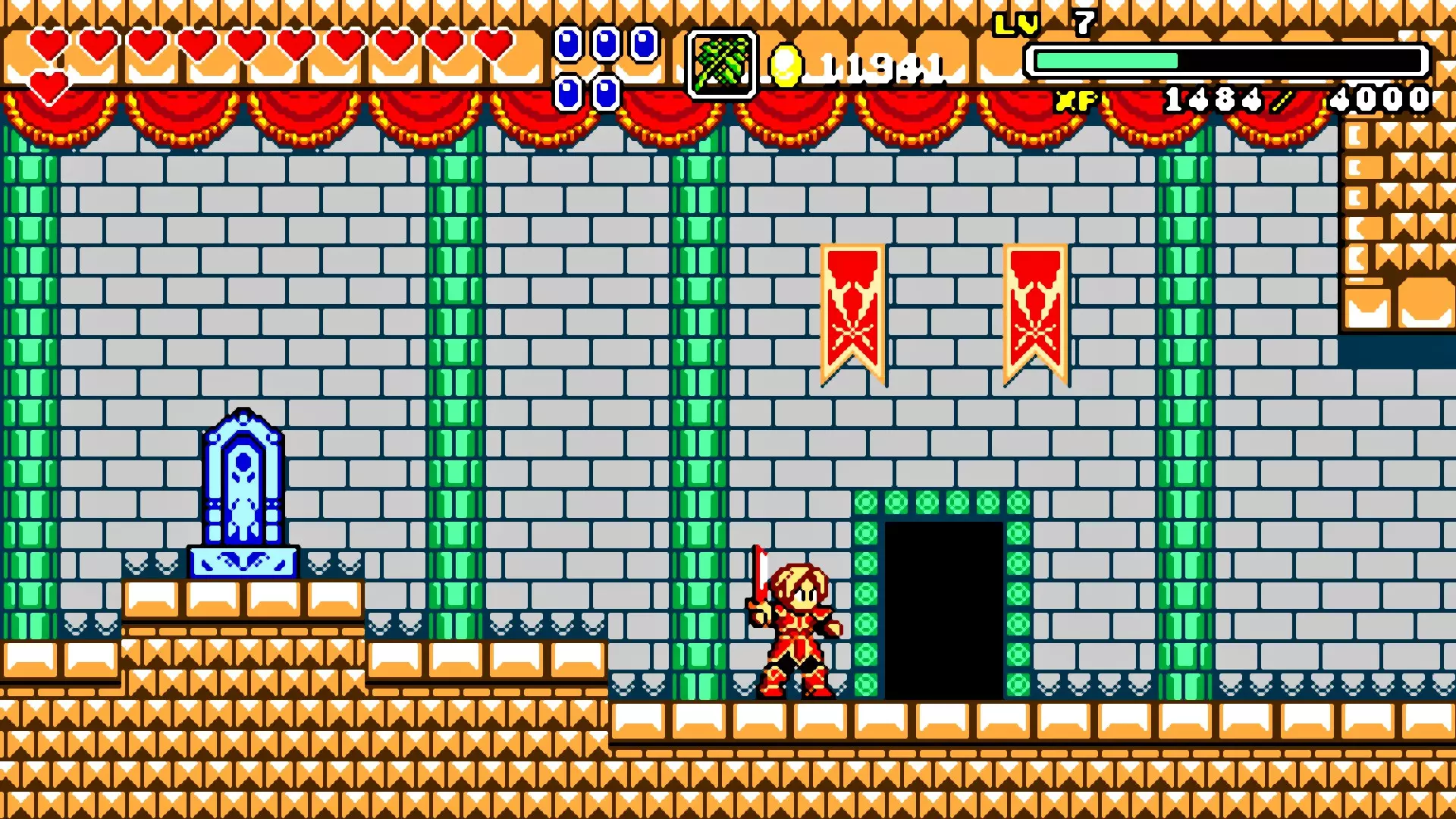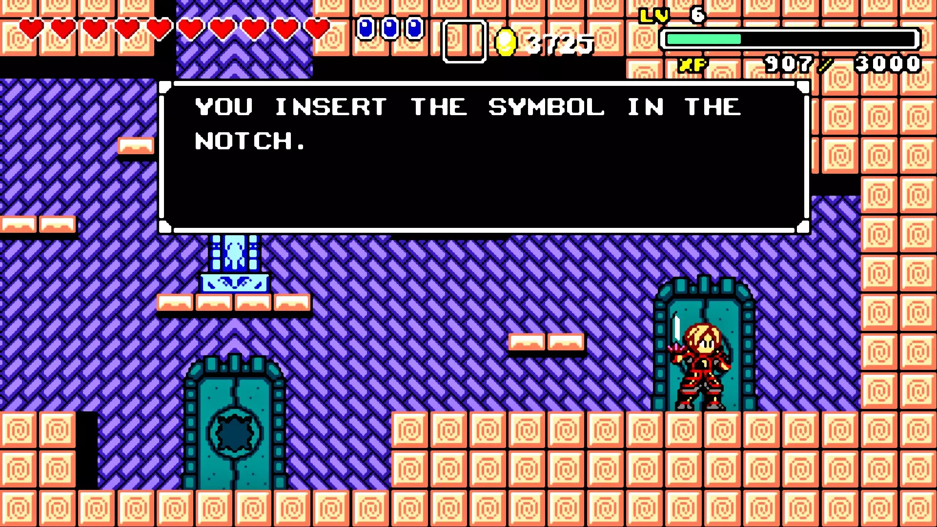 前往前一扇门,走到水边后向左走,使用水之戒,接着使用火之戒。现在跳进洞里,装备铁剑,击败巨型史莱姆以获得【破碎的阿格洛斯之剑】。