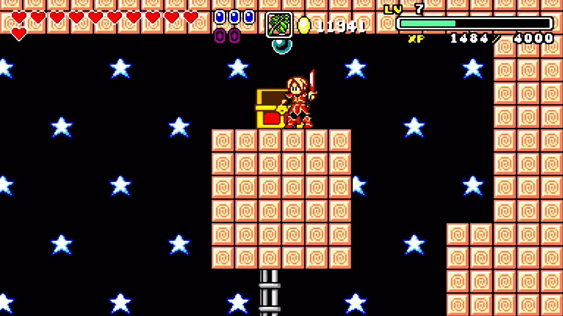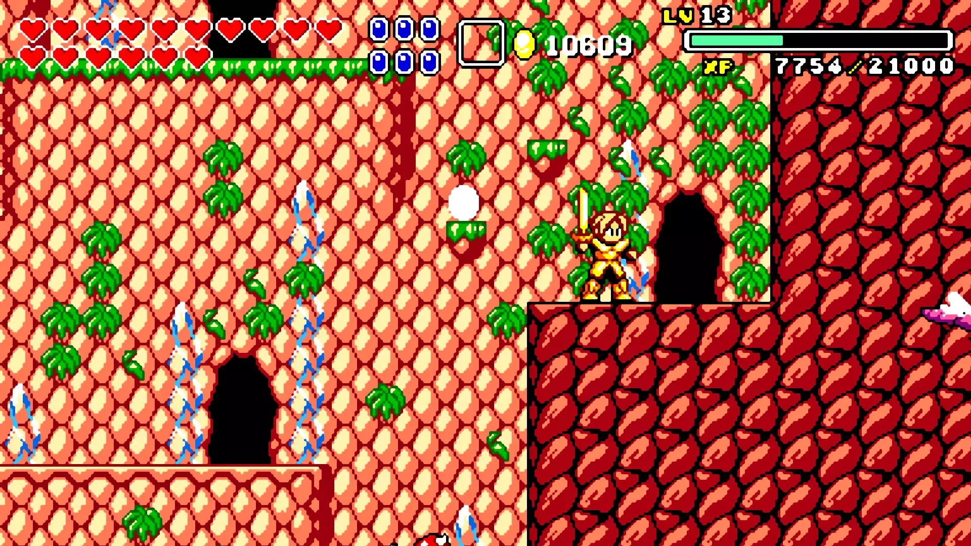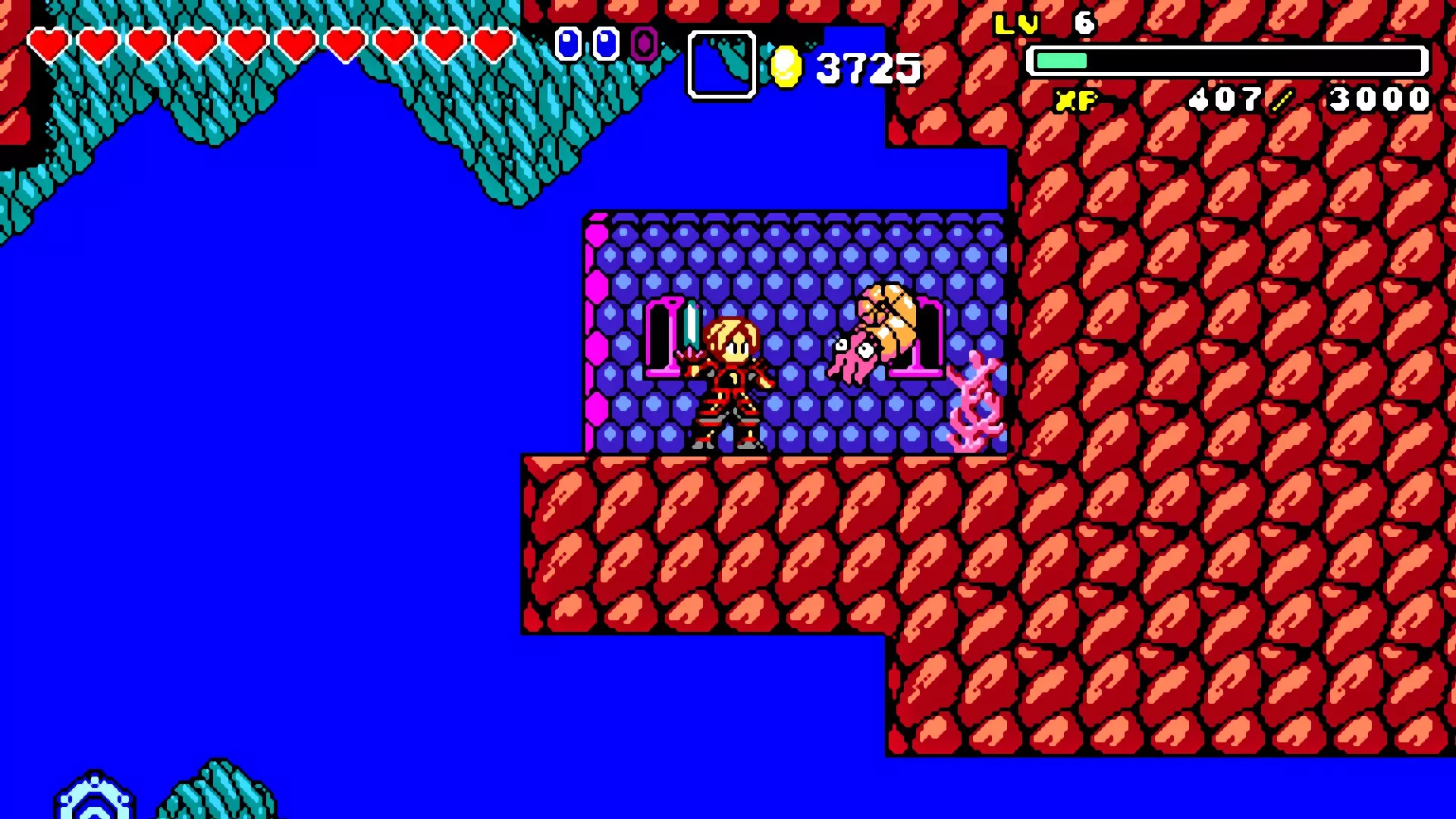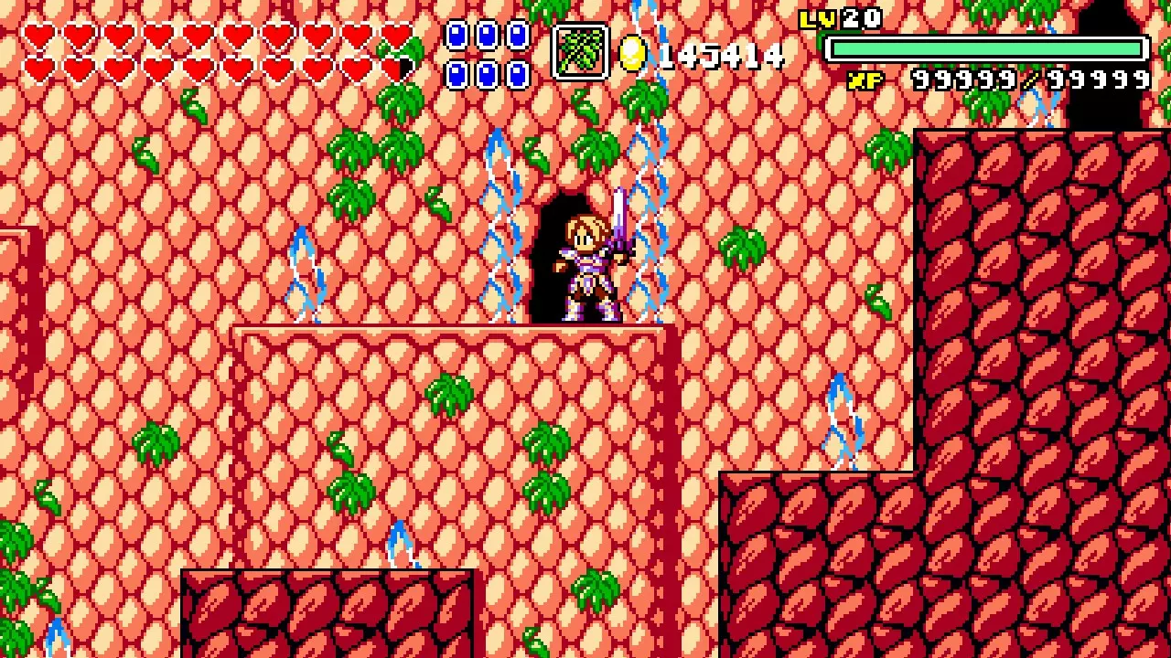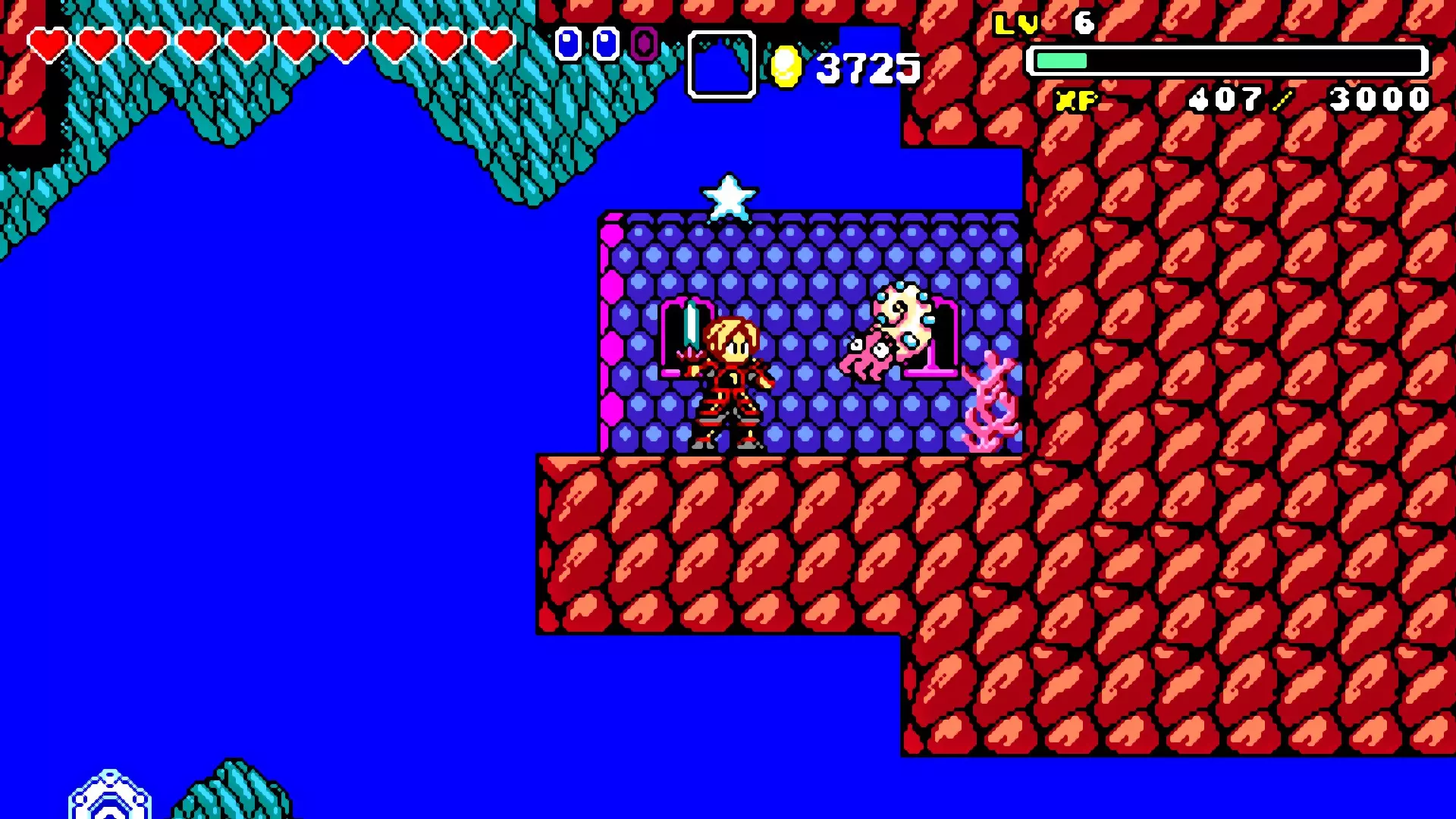 前往前一扇门,走到水边后向左走,使用水之戒,接着使用火之戒。现在跳进洞里,装备铁剑,击败巨型史莱姆以获得【破碎的阿格洛斯之剑】。