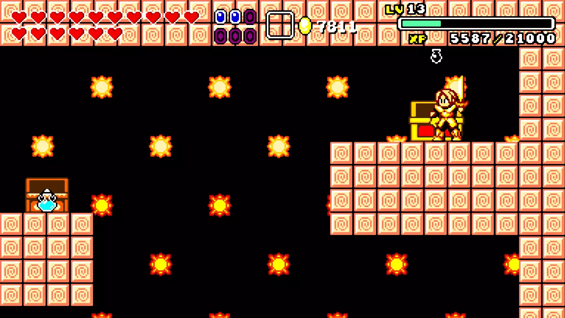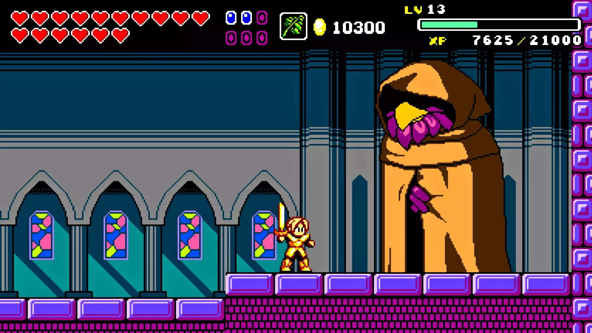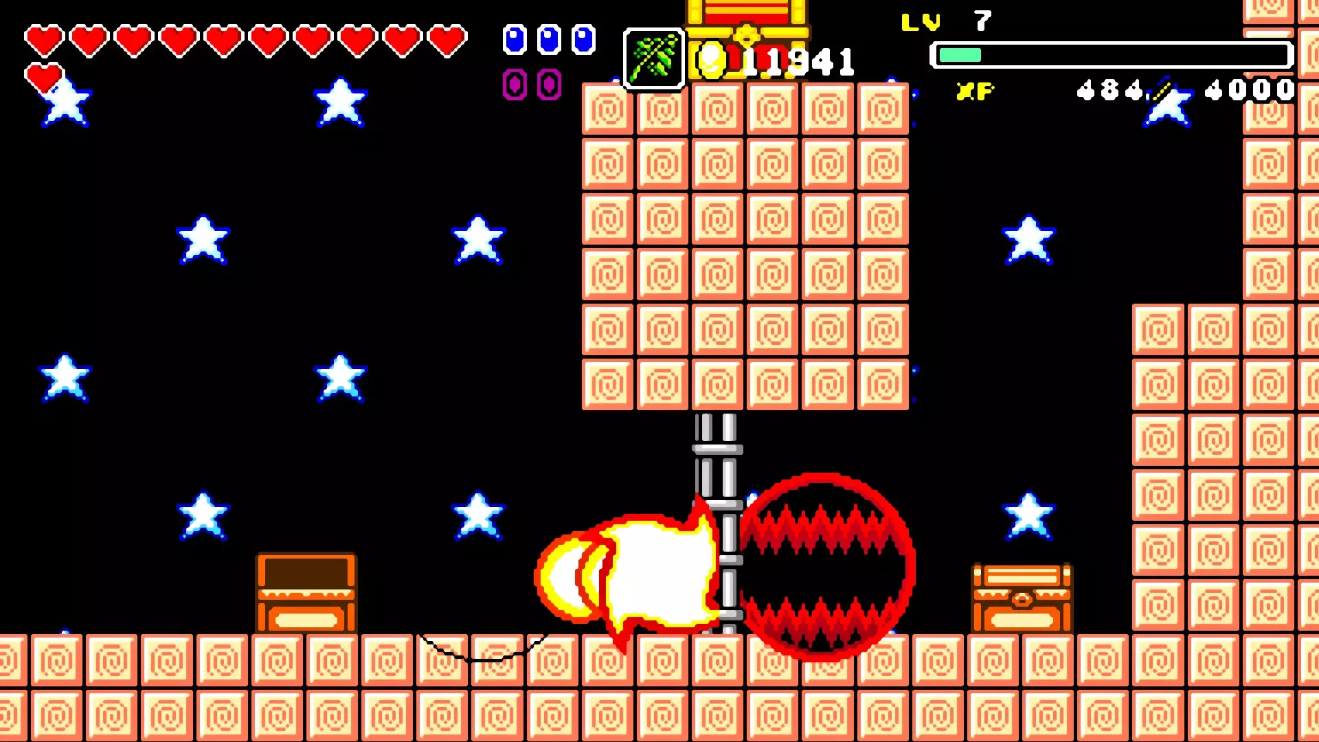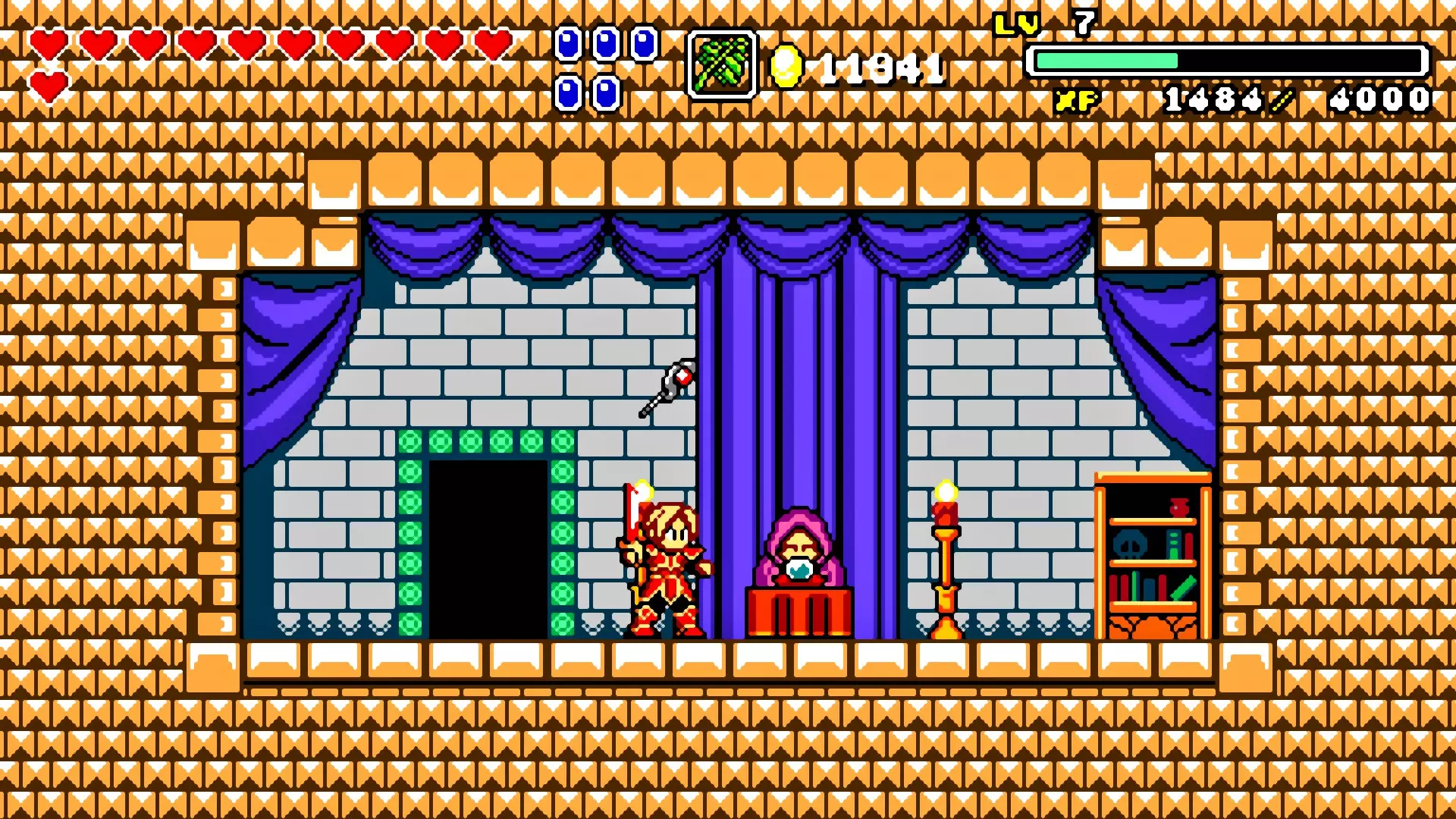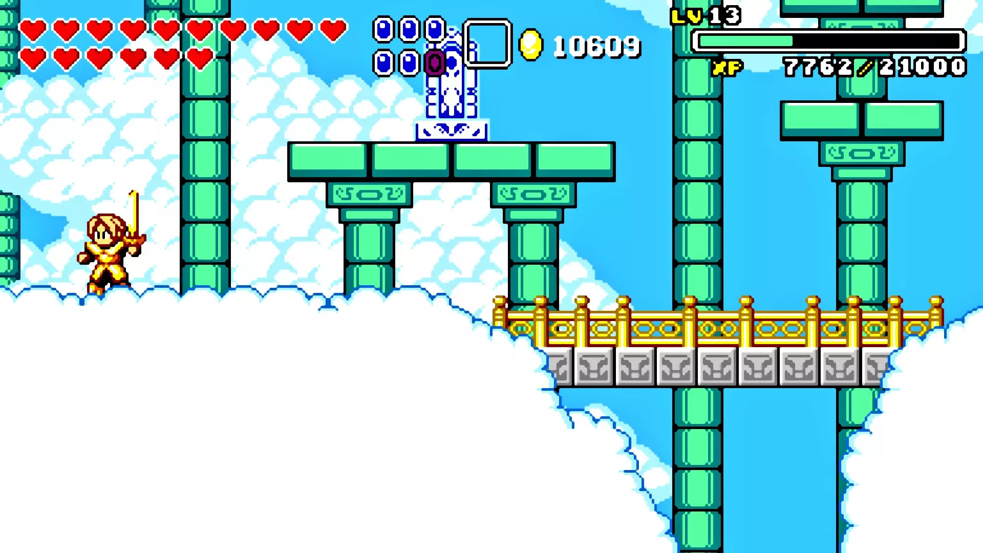 前往前一扇门,走到水边后向左走,使用水之戒,接着使用火之戒。现在跳进洞里,装备铁剑,击败巨型史莱姆以获得【破碎的阿格洛斯之剑】。