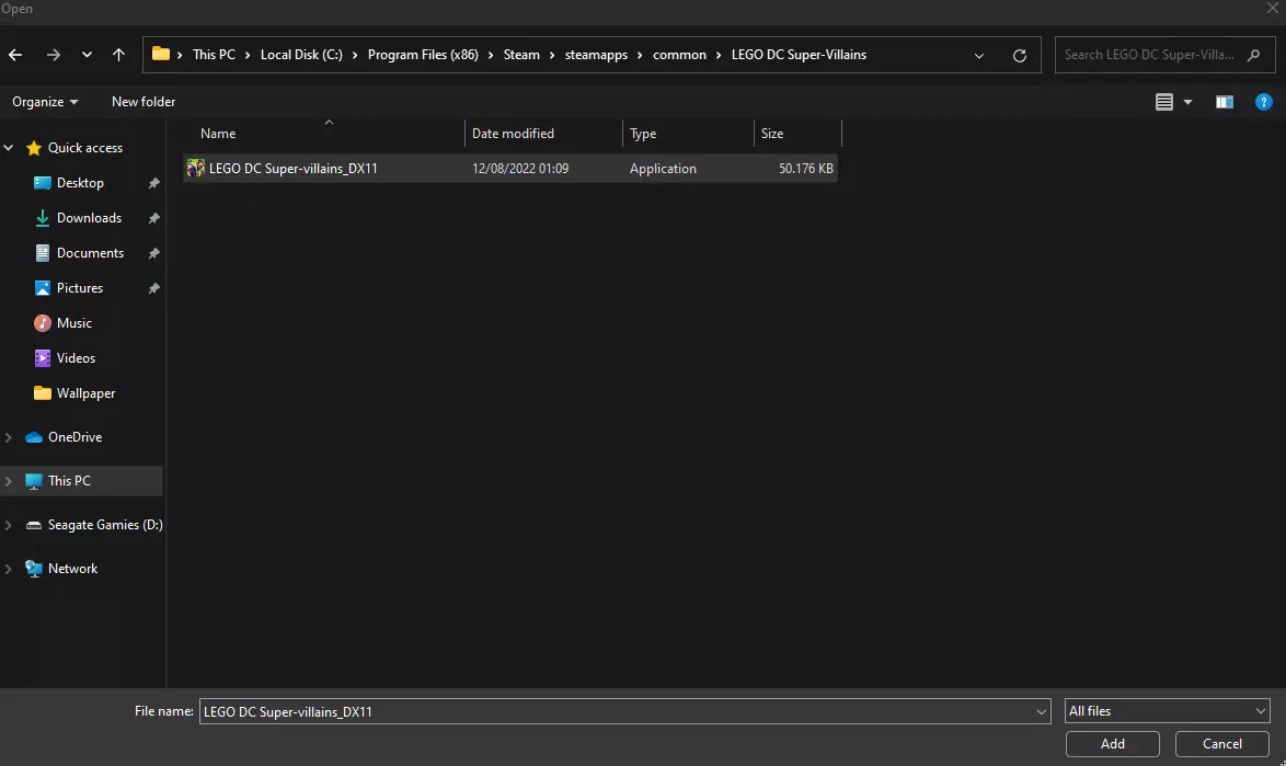 随后将打开文件资源管理器以引导你找到该应用程序。默认情况下,你的游戏应位于:C: Program Files (x86) Steam steamapps common。在该文件夹中,你会看到所有的Steam游戏,选择名为【LEGO DC Super-Villains】的文件夹。在该文件夹内,你应该只能选择一个可执行文件。只需选中它并点击“添加”即可。