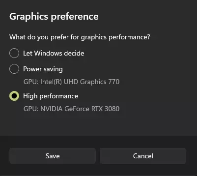 第三步:设置图形首选项 要完成设置,你还需要调整图形首选项。 现在,游戏应该会出现在图形菜单的应用列表中。点击该游戏并选择【选项】。 在弹出的菜单中,只需选择【高性能】,并且不要忘记点击【保存】。