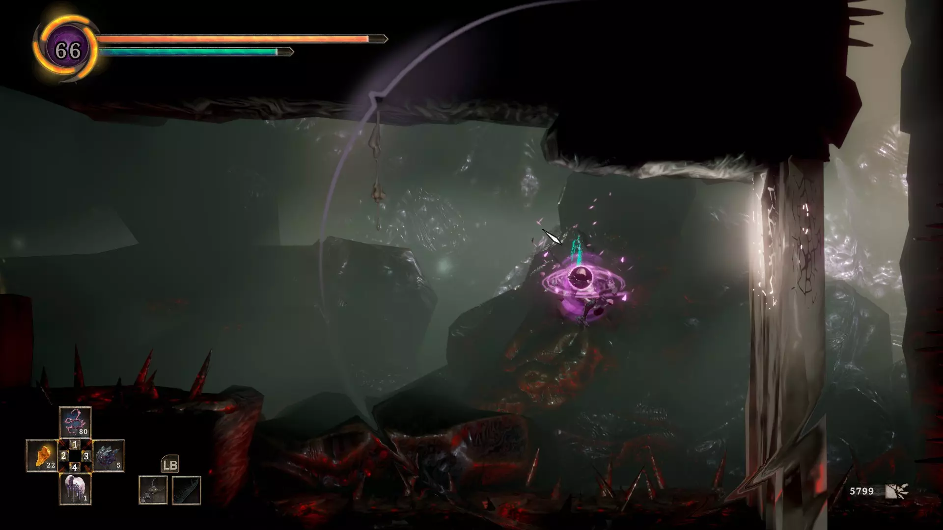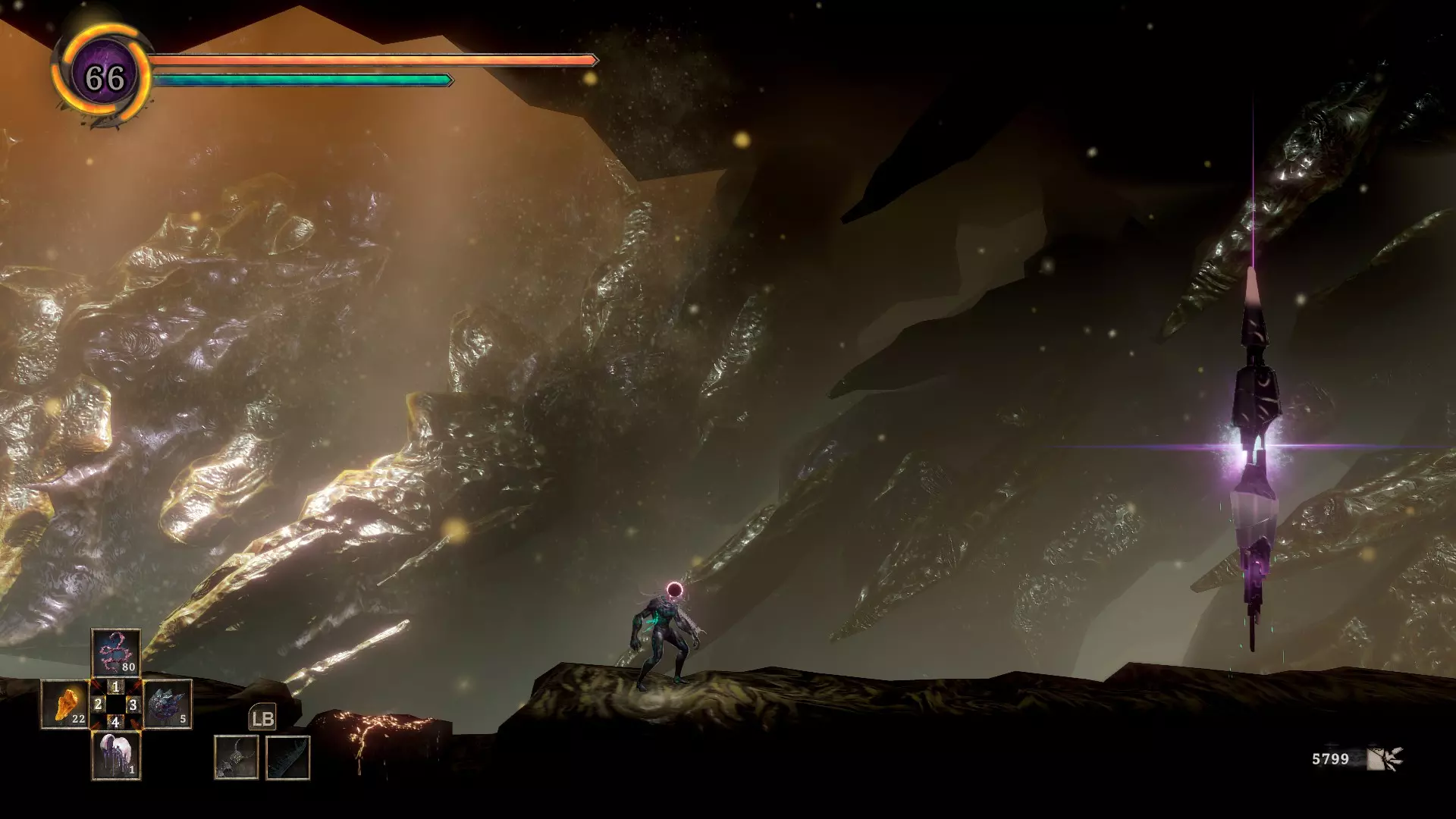 这个位置的左侧有一面隐藏墙壁。没有到这个位置的便捷传送点,第二个【哭泣空腔】传送点和第一个沙漠传送点距离这里差不多。另外,以防你忘记,在这个区域的尽头需要攻击白色墙壁,而不是冲刺穿过它。