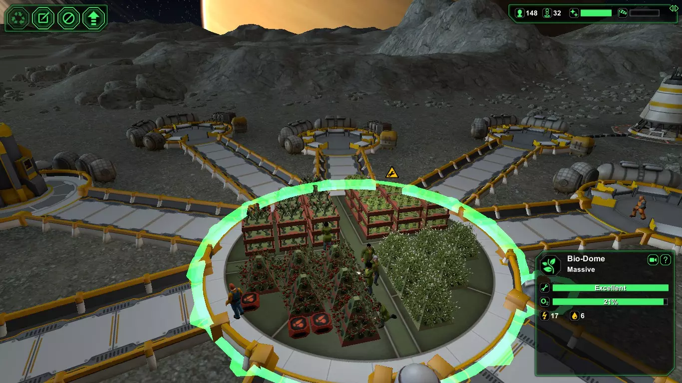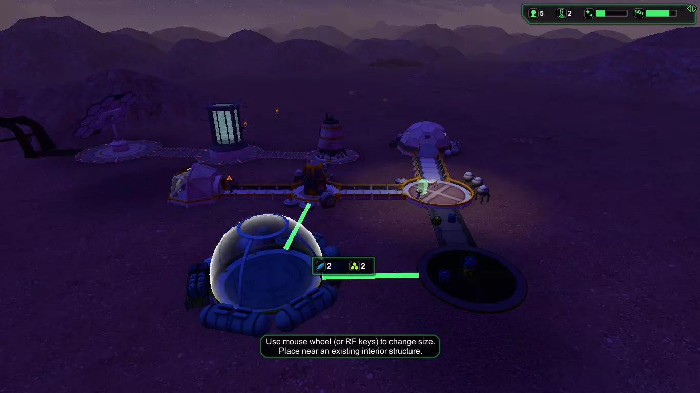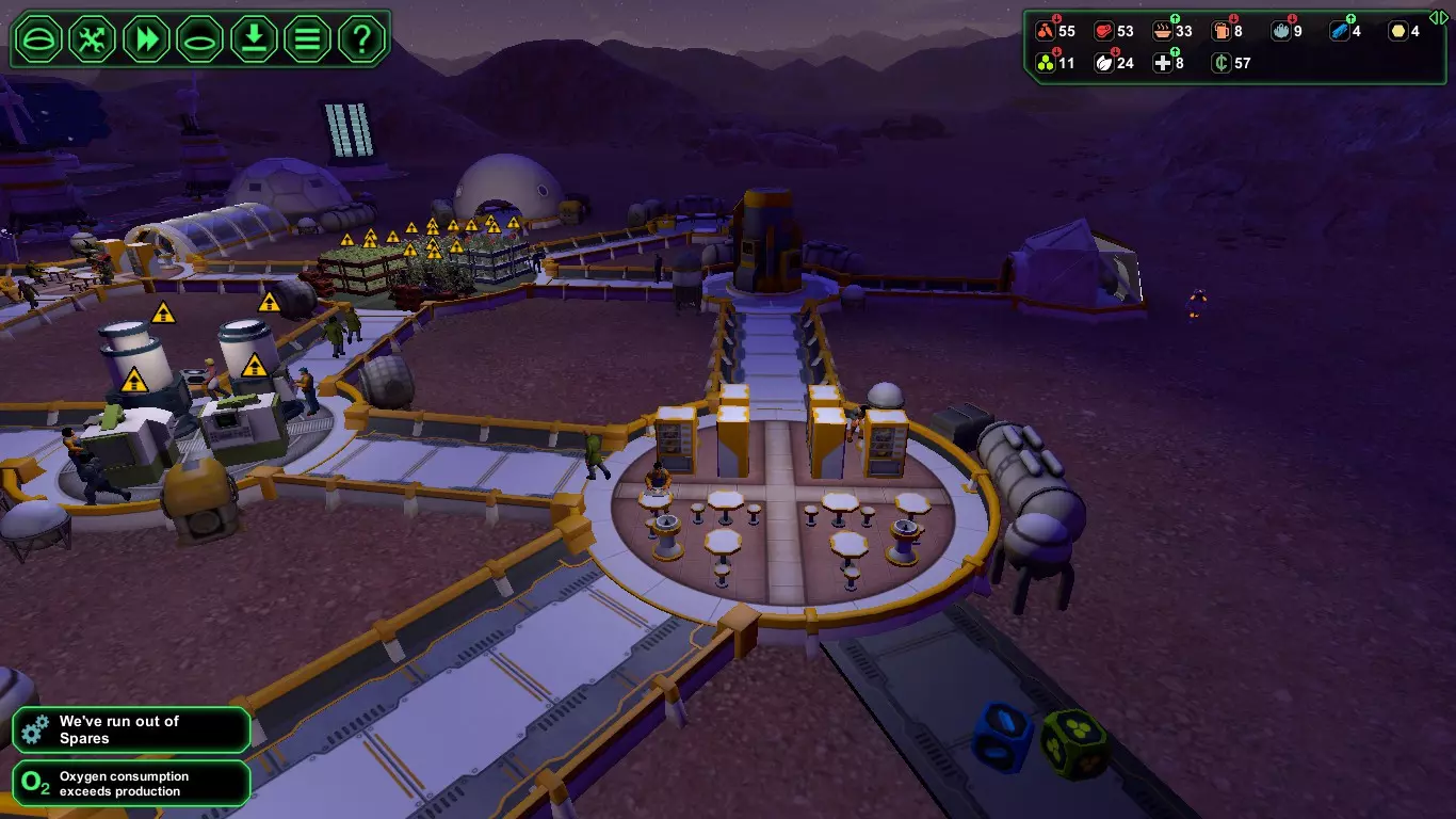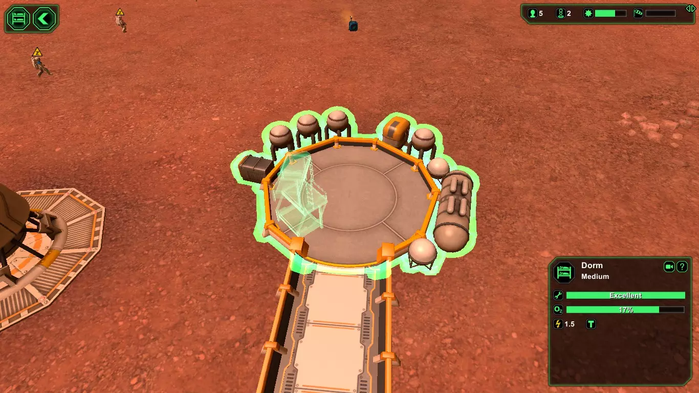 现在,在殖民者的宇航服氧气耗尽之前,建造【氧气发生器】(消耗1+1生物塑料/1+1金属)和【气闸】(消耗1+1生物塑料/1+1金属)。接下来应建造【食堂】(消耗2+1生物塑料/2+1金属),并安装【饮水机】(消耗1生物塑料)以防止因“脱水”导致死亡,以及【食物制造机】(消耗1生物塑料)。