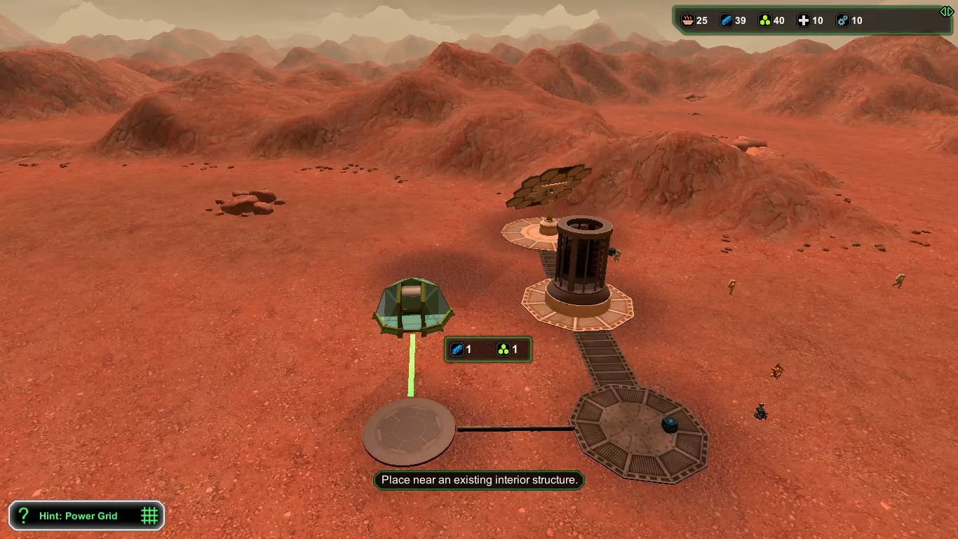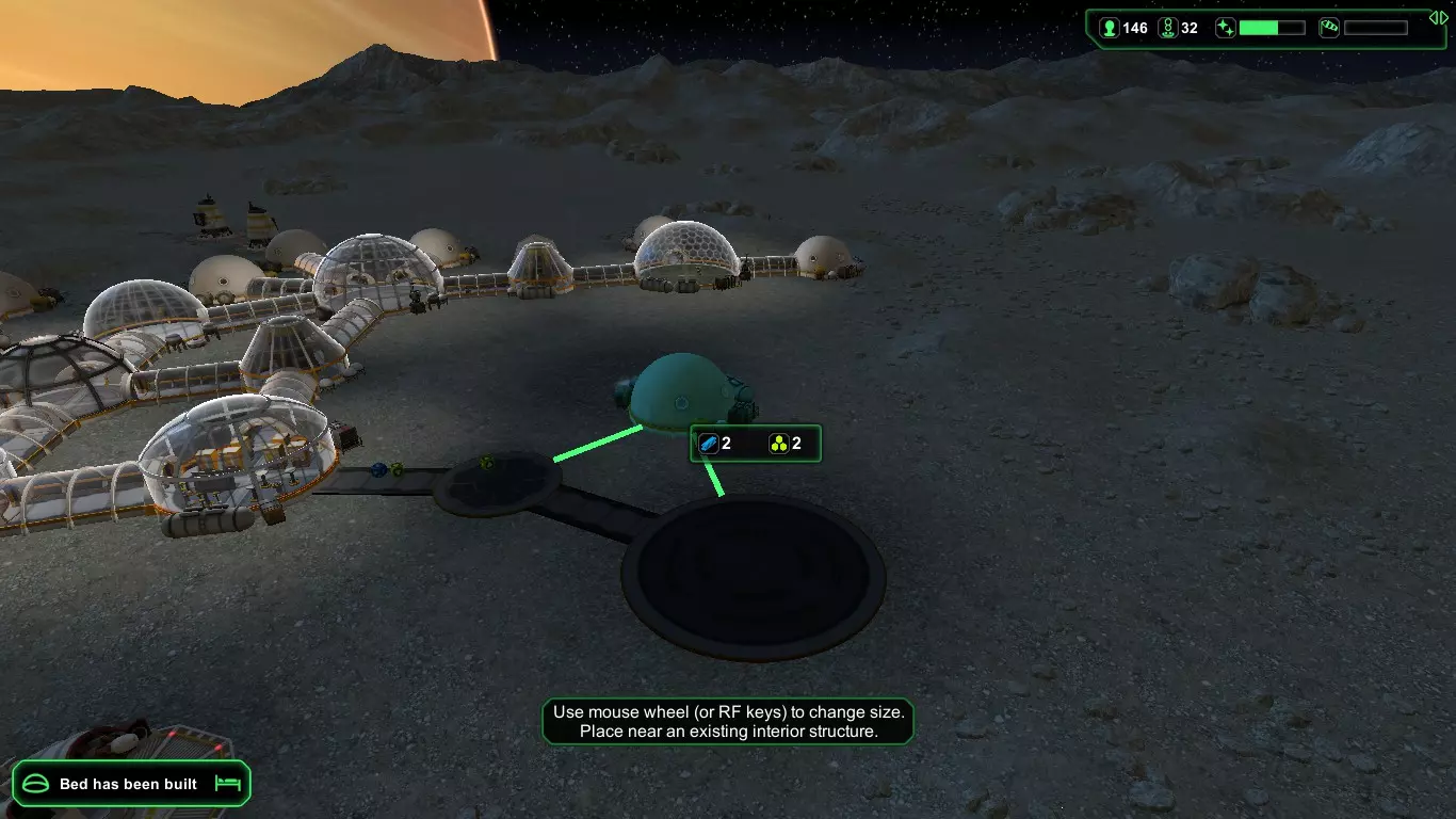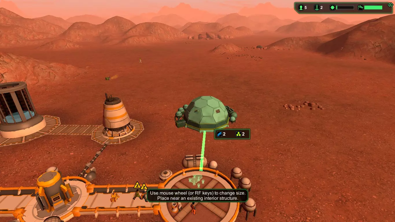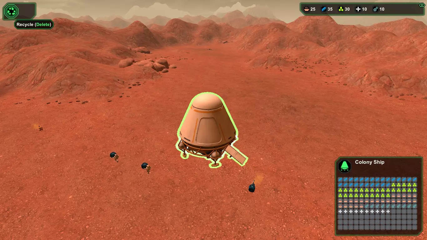现在,在殖民者的宇航服氧气耗尽之前,建造【氧气发生器】(消耗1+1生物塑料/1+1金属)和【气闸】(消耗1+1生物塑料/1+1金属)。接下来应建造【食堂】(消耗2+1生物塑料/2+1金属),并安装【饮水机】(消耗1生物塑料)以防止因“脱水”导致死亡,以及【食物制造机】(消耗1生物塑料)。