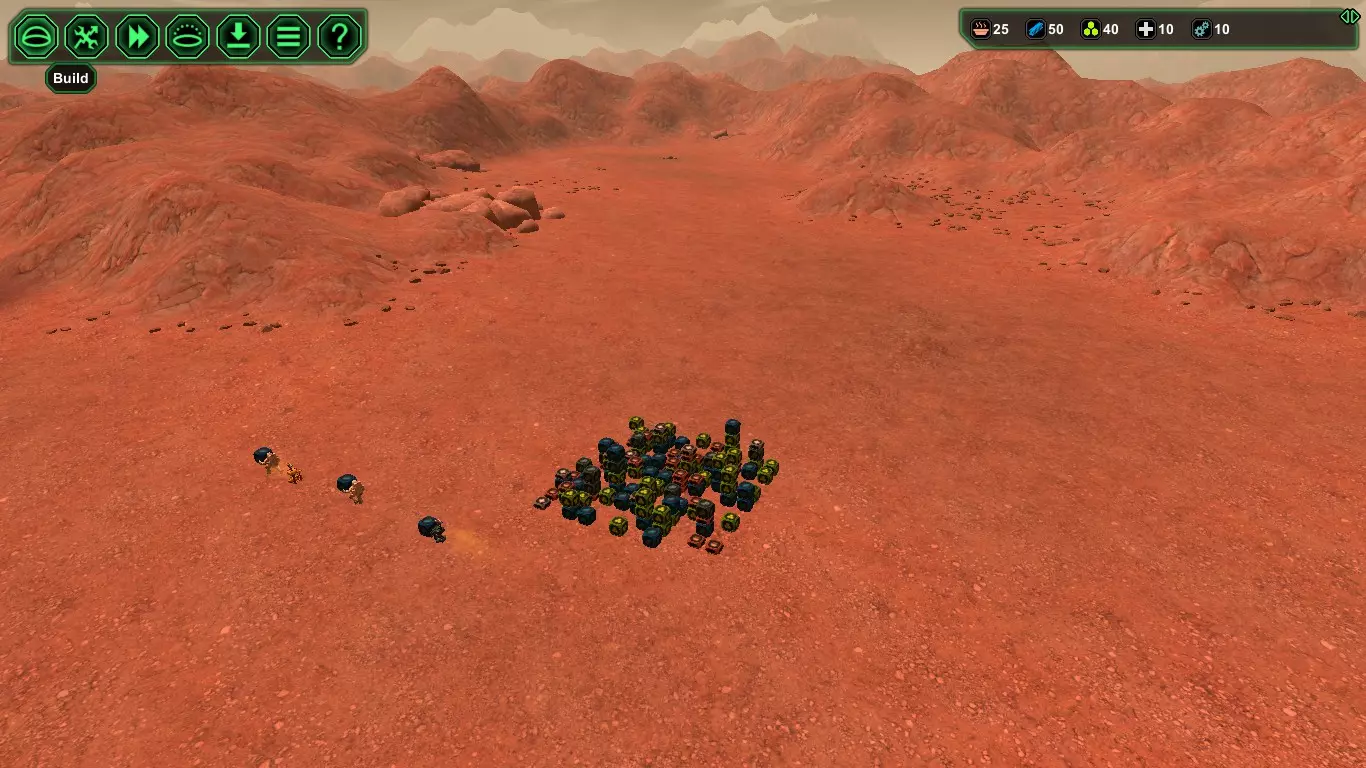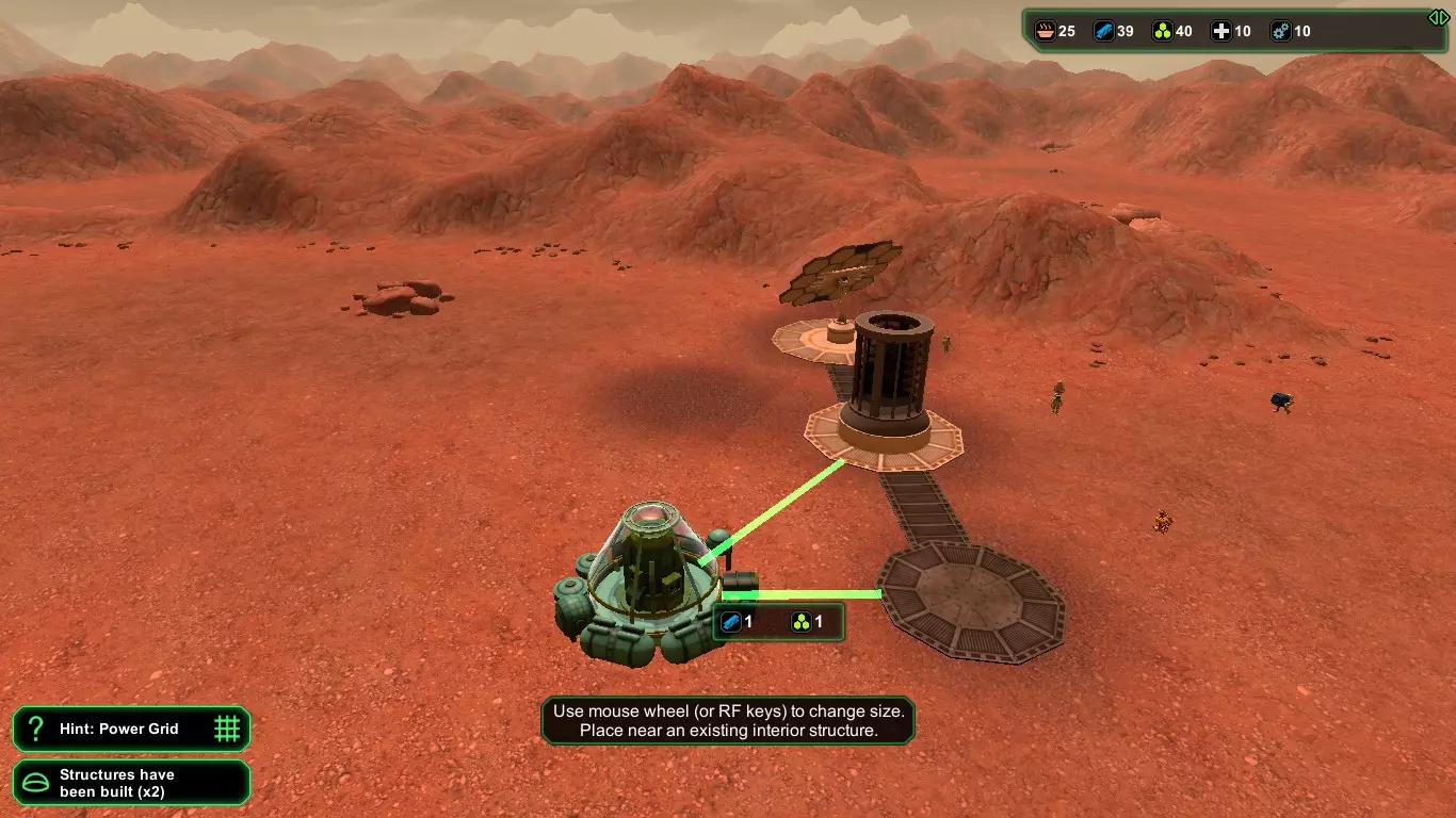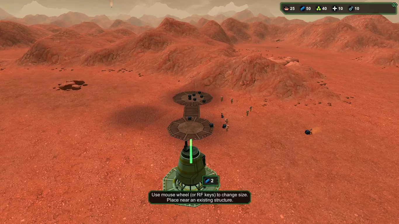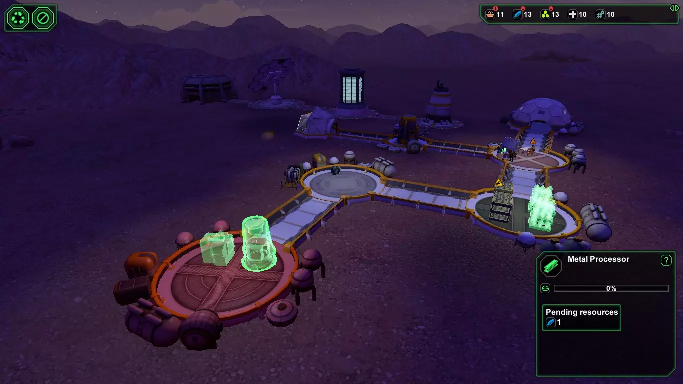 现在,在殖民者的宇航服氧气耗尽之前,建造【氧气发生器】(消耗1+1生物塑料/1+1金属)和【气闸】(消耗1+1生物塑料/1+1金属)。接下来应建造【食堂】(消耗2+1生物塑料/2+1金属),并安装【饮水机】(消耗1生物塑料)以防止因“脱水”导致死亡,以及【食物制造机】(消耗1生物塑料)。