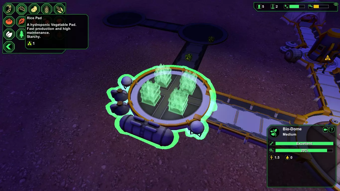 对于初期基地来说,【水稻】是一种很棒的作物,它能提供【2份蔬菜+1份淀粉】。水稻可为生物塑料加工机提供充足的淀粉,并且你可以将其与任何肉类搭配,制作出【意面(混合餐食)】。 要在环境恶劣的星球上生存下来,我们必须利用有限的资源建立“可持续农场”。 1.利用地图的视野范围大致分为四个部分(左-右),其中三部分用于建造室内建筑,另外一部分用于建造室外建筑。首先让登陆飞船“回收”模块着陆以获取额外资源,然后在靠近着陆点的地图边缘山脉处建造“太阳能电池板(7+1金属)”,接着建造“电力收集器(4+1金属)”,之后建造“集水器(2+1金属)”。对于电力和供水系统,建议直接建造大型的,因为其效率更高且维护成本更低。此外,这也比之后安装补丁更加方便。(+1指的是建造建筑之间【连接部分】的成本,这是一项隐藏的建设成本,计算时一定不要忘记。)3.现在定居者所在区域的空气将开始进入危险状态,请尽快建造【氧气发生器(Oxygen generater)】[消耗1+1生物塑料/1+1金属]和【气闸(Airlock)】[消耗1+1生物塑料/1+1金属]。之后再建造【食堂(Canteen)】[消耗2+1生物塑料/2+1金属],并安装【饮水机(Water Foutain)】[消耗1生物塑料]和【食物制造机(Meal maker)】[消耗1生物塑料],以防止缺水。还应建造一张餐桌来提升定居者的士气(这样他们就不用蹲在地上吃饭了)。小型餐厅建议使用四人餐桌效果最佳。“建筑连接通道”的建造资源消耗不变,无论其长短,但较长的连接通道会消耗更多电力。建造【宿舍(2+1生物塑料/2+1金属)】以应对殖民者的疲劳问题,建造【生物穹顶(2+1生物塑料/2+1金属)】开始生产食物和“面团”,建造【矿场(2+1金属)】来获取“矿石”,建造【加工厂(2+1生物塑料/2+1金属)】将“矿石”转化为“金属”、“面团”转化为“生物塑料”,再建造【仓库(2+1生物塑料/2+1金属)】,这样我们的殖民地就能进入初始殖民地的“可持续”种植状态。建议种植【水稻】,因为它能提供适量的淀粉用于生产生物塑料,并且未来还可以与肉类进一步加工成【意大利面】(营养全面的食物)。
