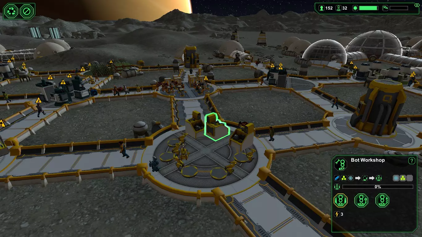 关于管理殖民者【士气】的方法: 1. 2.拥有床铺也能提升士气,持续建造【小屋】和【床】。 3.多穹顶不像啤酒那样受欢迎,但无论如何都必须建造。 4.氧气流通不难管理,只需确保每4个建筑中或在【生物穹顶/小屋/宿舍】等集中区域附近有一个氧气发生器。氧气发生器是最佳的扩建建筑,如果你不知道该建造什么的话。 5.啤酒酿造机消耗蔬菜很快,确保有足够的生物穹顶来供应。 6.资源流通:始终确保原材料供应多于你的加工能力。座位与食品及啤酒生产设备的合理比例为50%/50%(齐全的啤酒和食品能提升殖民者的幸福感) 2.拥有私人床铺也能让殖民者感到幸福,务必建造【小屋】和【床】 3.多穹顶不像啤酒那样受欢迎,但无论如何都得先建造出来 4.空气流通管理并不难,只需确保每隔三栋建筑的距离,或者人口密集的地方,都配备有氧气生成器。 5.【啤酒酿造机】“浪费”蔬菜资源非常快,建造生物穹顶以更好地满足需求。 6.如果不想让生产循环受阻,要始终确保原材料的生产能力大于原材料的加工能力。 供参考:2台奴隶机器人【奴隶工作状态良好】 1.每种类型的机器人至少应配备1个机器人制造器。【搬运机器人/建造机器人/钻探机器人】以防止因无法补充而出现“机器人短缺”的情况。 2.确保机器人自动维修站的数量充足。【每个维修站配备5-8台机器人即可】 3.钻探机器人不会感到疼痛,一旦用钻探机器人取代所有人类矿工,“创伤”问题就会成为过去。【这样能节省大量医疗包】