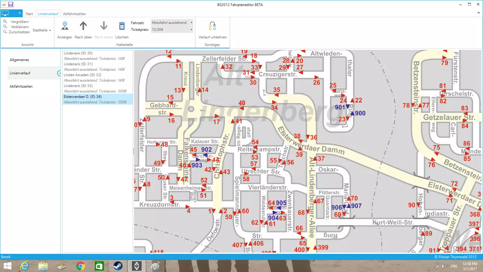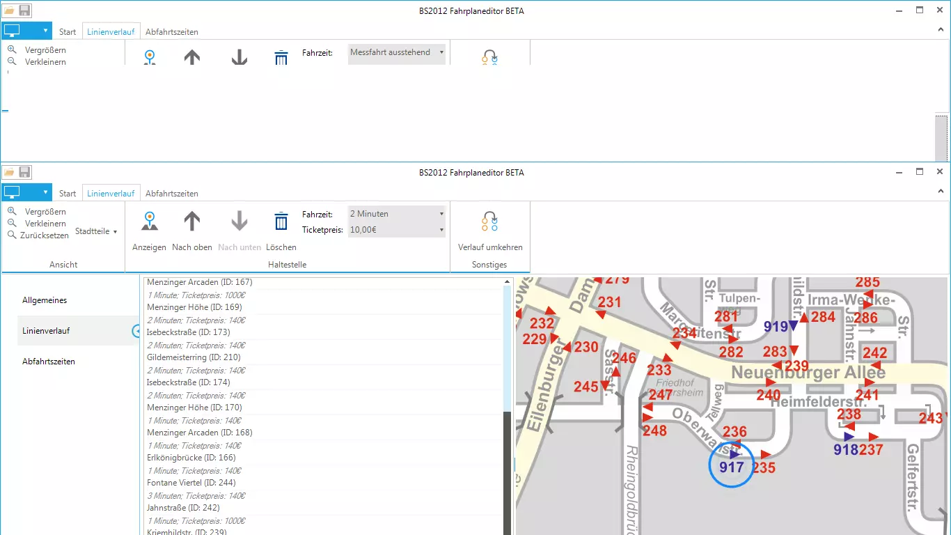 选择公交站点 你可以从德国FT软件公司开发的路线编辑软件中选择任意公交站点。 1. 蓝色标记的站点为终点站。 示例:弗赖富特火车站终点站以蓝色标记,ID为(932)。 2. 红色标记的公交站点可供你选择用于新路线。 3. 【Fahrzeit】列显示的是你希望到达下一站的发车时间,例如1分钟或2分钟。