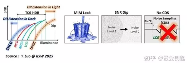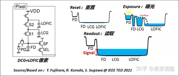 不过在提升 CMOS 动态范围这条路上,LOFIC 虽然表现出色,但也不是唯一的解法。 像 Sony、三星几乎全线在用的“DCG”技术,就是在 CMOS电路上装了个智能开关,根据光线强弱自动调整灵敏度。在强光环境,切换到大电容,避免过曝,保留更多亮度信息。在暗光环境,就用小电容,让照片噪点更少。 现在不少厂商还把 DCG 和 LOFIC 搭配使用,中低亮度靠 DCG 智能调优,极端高光交给 LOFIC 兜底,两者配合,让动态范围又宽又平滑,HDR 效果更自然。 DCG+LOFIC方案示例