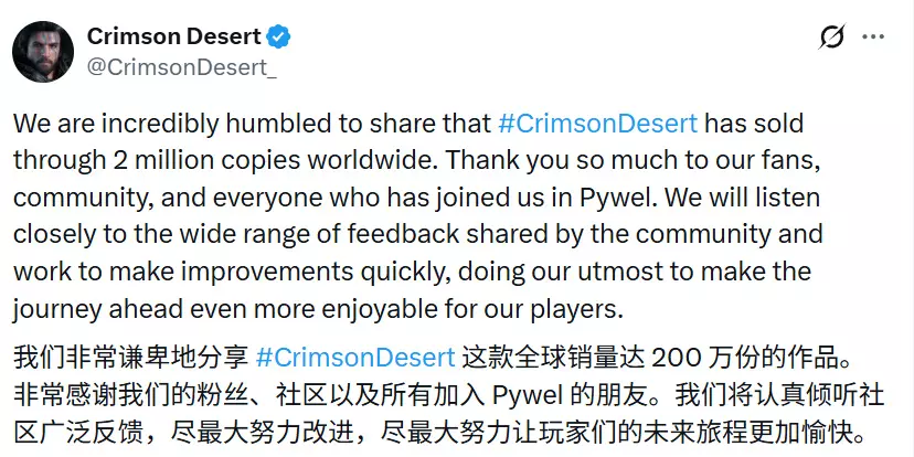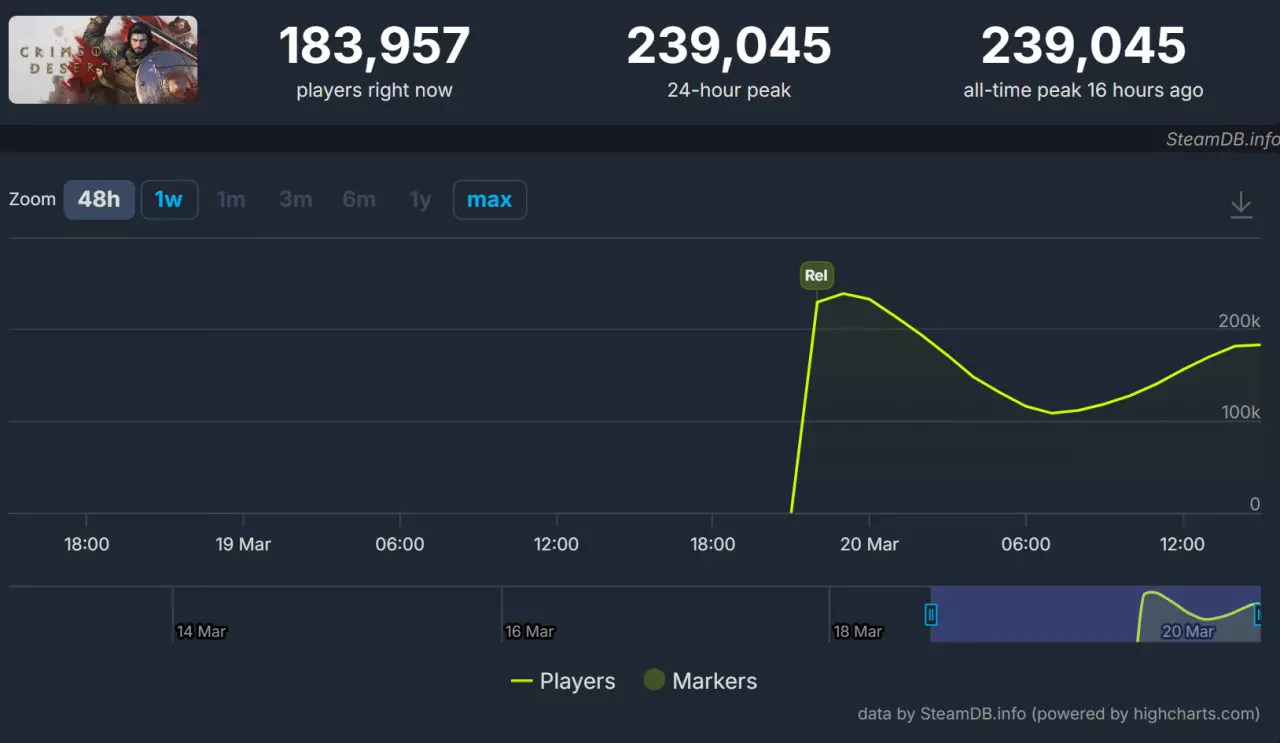 珍艾碧丝旗下备受期待的开放世界动作冒险游戏《红色沙漠》已于近日正式发售,并迅速取得商业成功。据官方公布,游戏在发售首日全球销量已突破200万份,而Steam同时在线峰值为239,045人,展现了强劲的市场吸引力。然而,与亮眼的销售数据形成对比的是,在游戏媒体评分解禁后,开发商珍艾碧丝的股价出现了近30%的下跌,反映出资本市场对作品初期口碑的谨慎态度。