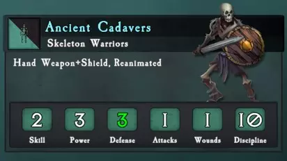技巧与窍门: 分割对手: 亡灵国度的部队通常混合了速度极快和行动迟缓的单位,这使得分割他们的军队变得尤为容易。 蹒跚之主的迅捷但脆弱的恐狼会向前推进,通常能在第二回合就冲入玩家的部署区。远程攻击对它们造成的任何伤害都会极大地削弱其输出能力。它们会冲向射程内最近的可见单位。一旦恐狼移动后,你可以通过移出它们的射程范围,或者让一支纪律值高的单位进行撤退,来拖延它们的冲锋。这种佯退需要有支援单位能够拦截诱饵单位随后可能遭受的后方冲锋,理想情况下是对恐狼发动侧翼冲锋。这两个不死族步兵单位同样容易受到散兵的攻击。它们无法被击溃,因此以近战为核心的军队应同时用两个单位冲锋这些移动缓慢的步兵单位,以避免在长时间交战中受到伤害。这些单位在面对一个以上技能等级3或更高的对手时,很难在第二轮战斗中存活下来。即使是没有升级的单位,通常每回合也会平均损失15个模型中的20%到30%。此外,当它们在一回合战斗中失利时,每回合还会损失1到3个模型。