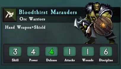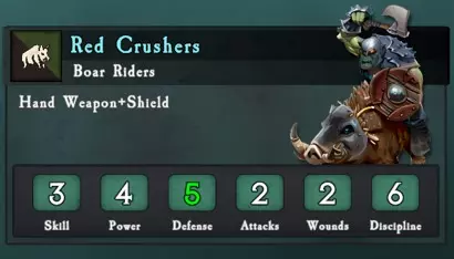 移动力 总生命值 远程伤害 单位损失1点生命值时的逃跑概率 从后方攻击时使单位100%逃跑所需的生命值损失量 平均消灭单位所需攻击次数 8 12x 防御2 对防御4的射程0-12:2.0平均伤害 对防御4的射程13-24:1.3平均伤害 纪律5+2队列-1=58% 4 36次技能3威力4的攻击 冲锋 持续作战 对典型攻击者的防御 10次技能3威力3→对技能3防御4的平均伤害2.0 10次技能3威力3→对技能3防御4的伤害2.0 12次技能3威力4的攻击造成4.该单位平均伤害为0 兽人斥候 兽人斥候拥有2次行动机会,花费200点,其部队固定为一队野猪骑士和一队兽人战士。