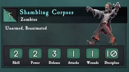 移动力 总生命值 远程伤害 部队损失1人时的逃跑概率 从后方攻击时使部队100%逃跑所需的伤害值 平均消灭所需攻击次数 8 15x 防御3 射程0-12对防御4:1.7平均伤害 射程13-24对防御4:1.1平均伤害 纪律7+2队列-1=28% 6 30次技能3威力4的攻击 冲锋 持续作战 对典型攻击者的防御 10次技能3威力3→对技能3防御4平均1.7伤害 10次技能3威力3→对技能3防御4伤害1.7 12次技能3威力4攻击造成4对单位造成0平均伤害 蹒跚集群 蹒跚集群包含3个作战单位,总兵力值最高为200点。 其中两个单位栏位各有50%的概率生成15名僵尸,也有同等概率生成15名骷髅战士。 骷髅战士因手持武器,在冲锋回合拥有+1力量的冲锋加成;同时因装备盾牌,拥有与僵尸相同的防御力。不过该加成通常不会造成任何实际影响。