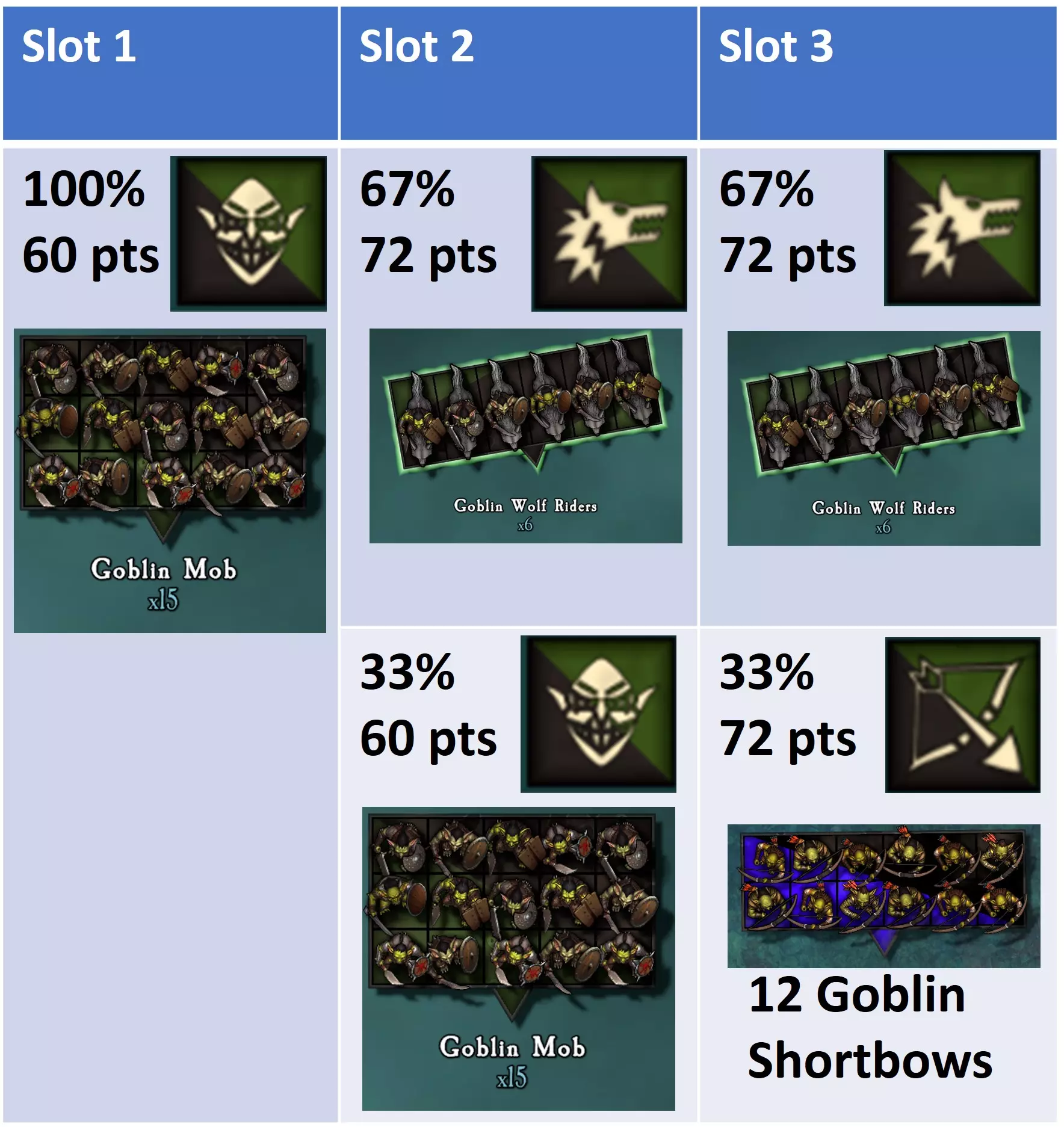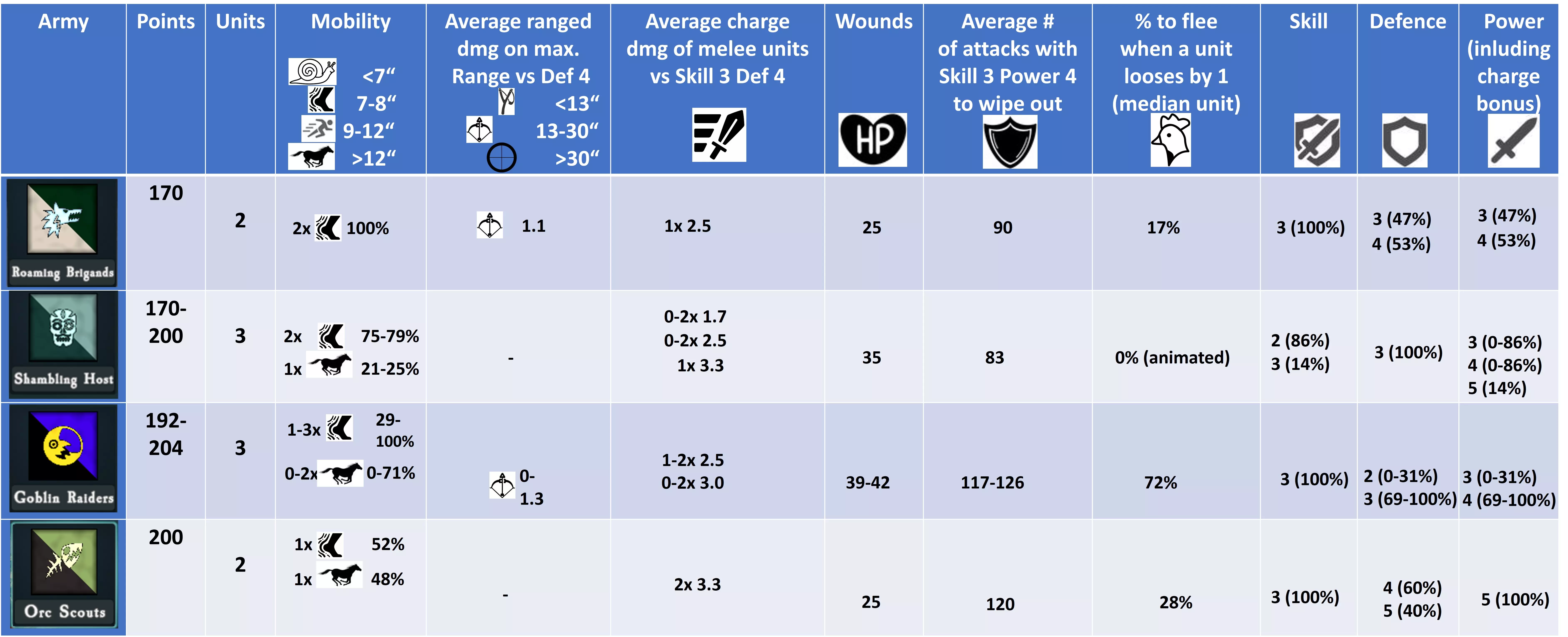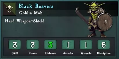 移动力 总生命值 远程伤害 部队损失1人时的逃跑概率 从后方攻击时使部队100%逃跑所需的伤害值 平均消灭所需攻击次数 16 5x 防御3 - 7 + 1队列 -1 = 42% 5 15次技能3威力4的攻击 冲锋 持续作战 对典型攻击者的防御 10x技能3威力5 --> 对技能3防御4的平均伤害3.3 10x技能3威力4 --> 对技能3防御4的伤害2.5 12次技能3威力4的攻击对该部队造成平均4.0伤害 哥布林掠夺者 哥布林掠夺者拥有3次行动机会,并且能有最多样化的选择。在自定义战斗中,单位拥有相当于192至204点的点数。部队不仅可以包含不同类型的步兵单位,还可以配备零到一个远程支援单位以及零到两个快速突击单位。