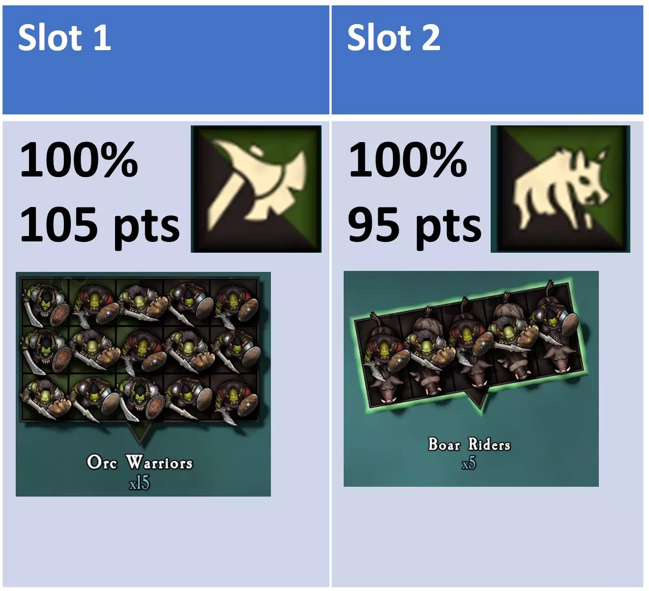分割敌军: 兽人为主的绿皮军队通常混合了不同速度的单位,这使得分割他们的军队并孤立单个单位变得容易。他们的纪律性仅略高于地精,但更高的防御力和力量使得难以通过决定性战斗击溃一个单位。机动绕过这些更昂贵的单位,从侧翼和/或后方发动冲锋以避开他们的攻击,会带来更大回报。 野猪骑兵是远程攻击的主要目标。他们5点的较高防御力在面对3点力量(大多数远程武器的常见数值)时无关紧要。而且他们从损失第一个模型开始就会降低伤害输出。 兽人斥候是早期阶段中最坚韧和强大的单位。理论上,只要兽人不逃跑,这支军队的两个单位几乎可以承受与整个蹒跚宿主相当数量的低威力攻击。风筝战术或多个单位同时攻击孤立兽人单位的侧翼和后方,都是避免受到伤害的可行选择。将多个单位集中攻击单个兽人单位也至关重要,这样可以防止兽人在战斗的第一回合后改变朝向,从而使出其强大的正面攻击。