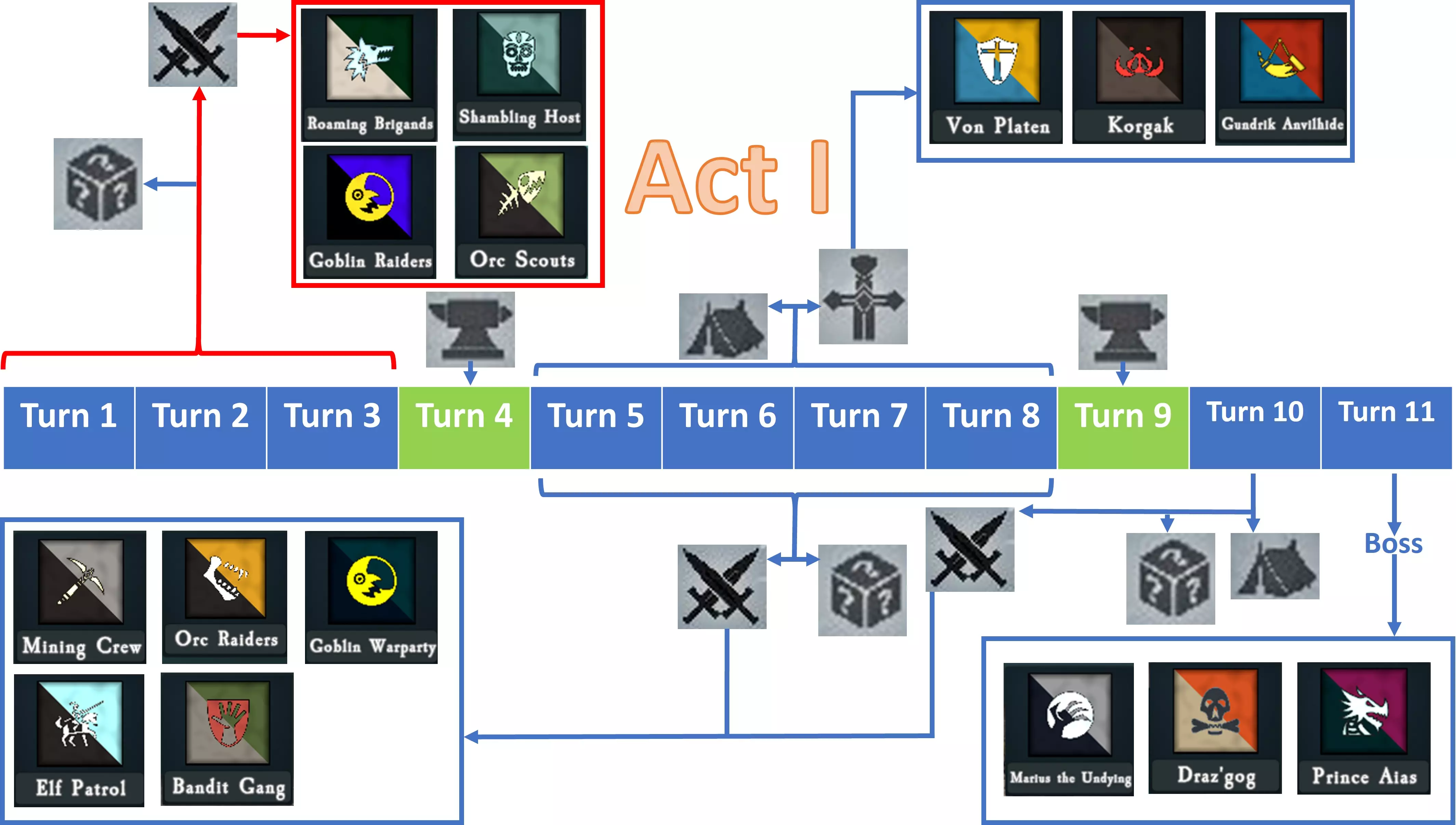 在常规战斗中,存在两个不同的单位池:一个用于第4回合首个军械库之前的常规战斗,另一个用于本幕第二部分的常规遭遇战。 在第1至3回合,玩家可能会遭遇4种不同的军队: 【游荡的强盗】 【蹒跚的亡灵军团】 【哥布林突袭者】 【兽人斥候】 每支军队在一场战役中可能出现不止一次,但不会连续回合出现。