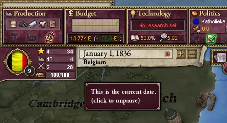 原因在于比利时国土面积相当小,且相当温顺,并且有一个与荷兰提前开战的脚本事件。这场战争很容易获胜,之后这个国家也易于治理。 掌控时间和/或空间 首先:作为国王,掌控时间是你的特权。你可以通过摆弄国家旗帜旁那个看起来像一张纸的东西来实现。你也可以掌控空间,或者至少是你对空间的观察:使用方向键或轻推屏幕边缘,在天地间不受控制地移动,用失望的目光俯视你那渺小的比利时。无论如何,他们都会敬仰你。有趣的是,无论你搞砸多少次,他们都会一直追随你。哦,天哪!