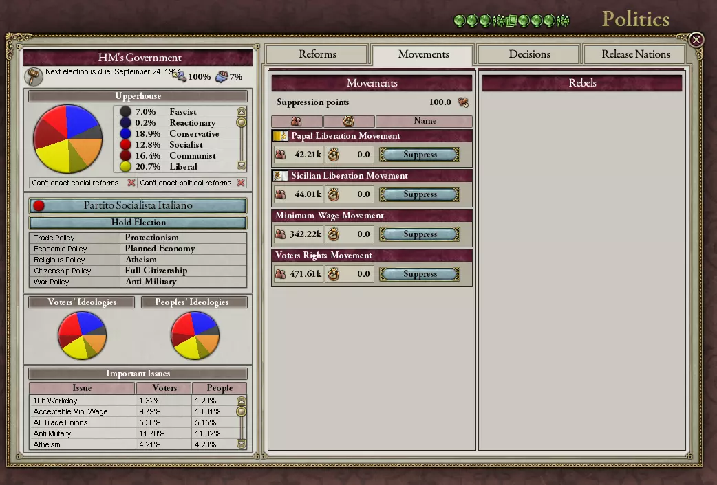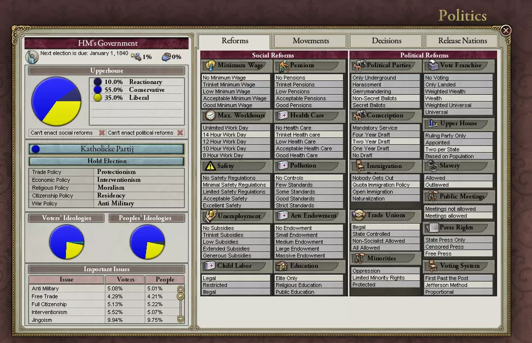 在游戏左侧,你会看到描述你的国家及其理念的内容:蓝色代表保守主义,黄色代表自由主义,深蓝色代表反动主义。这些都是政治势力,且运作方式各不相同。若保守派在政治上占多数且民众满意度高,那么从政治层面而言,你的国家几乎不会发生改变:不会有改革,不会推行和平主义,也不会出现极端军国主义,一切都维持原样。要是民众成为极其不满的乌合之众,保守派就会改变想法,允许进行改革,这主要是为了保全他们资产阶级自身的利益。自由主义者热衷于变革,因此如果议会中黄色势力占比较大,你很可能会实施一些听起来不错的政策,比如选举和无记名投票。反动派则恰恰相反:他们希望建立一个18世纪太阳王风格的绝对君主制国家。在游戏过程中,会出现更多的政党,但目前就先介绍这些。 此界面的右侧可通过点击顶部的标签页进行切换。现在我们应该查看【改革】标签页,即便暂时不进行任何操作:这里面充满了能让你的国家变得舒适宜人的内容。若将所有改革都颁布实施,你将获得两块“饼干”,一块来自社会主义,另一块来自自由主义。为道德进步欢呼吧!但不幸的是,你同时也会收到来自反动派、法西斯分子和共产主义者的死亡威胁。唉,就是这样。