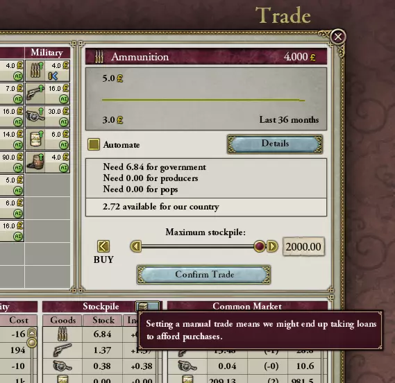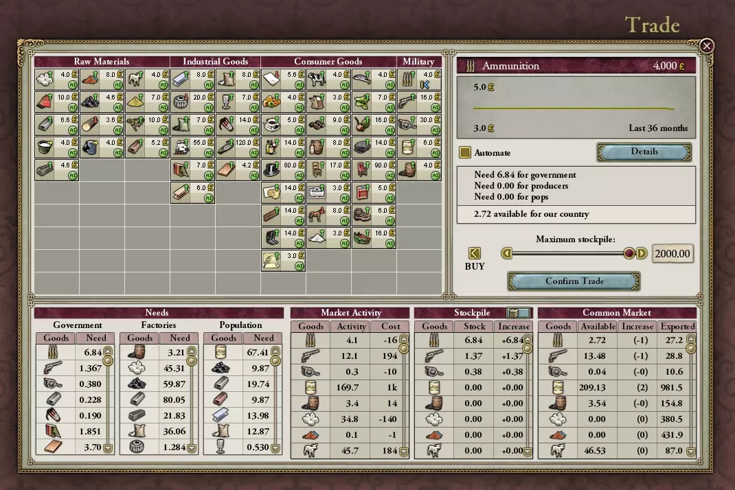 《维多利亚2》在经济描绘上努力做到合理且引人入胜,但遗憾的是,其真实度堪比梵高画作的“写实主义”——有人向我保证,在游戏中你会遇到工匠用水果制造坦克的情况。因此,新手最简单的经济处理方式就是持续囤积必需品,然后大胆地不去管它——除非你想深入钻研《维多利亚2》经济系统的深奥奥秘。 囤积本质上是命令你的国家在特定商品有货时建立一定的库存。这能防止AI市场把你所有的坦克都贱卖掉,比如为了换几个三明治就不小心让你的军队失去了先进武器。要执行此操作,请打开贸易窗口,然后选择你想要囤积的商品。在下方截图中,我选择了弹药,这是一种【军事】商品。取消勾选【自动】框;将【最大库存】滑块调至最大;然后点击【确认交易】。对所有军事商品、混凝土和钢铁重复此操作。