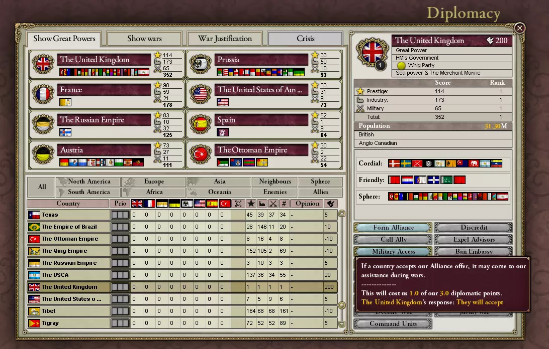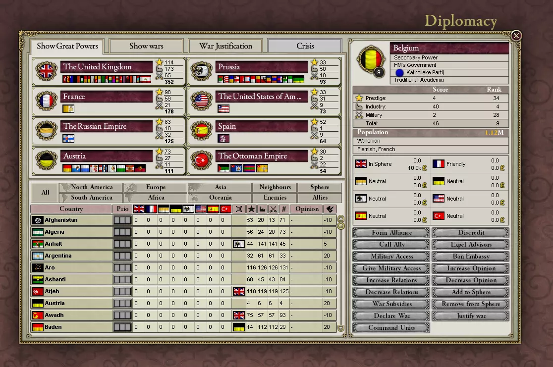 《维多利亚2》是一款经典的游戏,但也存在一些缺陷。这两点导致游戏时常崩溃,让人在诸多乐趣中感到沮丧。你可以通过使用模组来避免部分此类问题。我认为【人口需求模组(Pop Demand Mod)】是提升游戏体验的必备模组:它为所有国家增添了多种实用机制和特色内容,同时不会改变游戏本身的玩法。请注意,为此你需要在Steam中选择《维多利亚2》相应的“测试版”版本。 有些人可能是从《维多利亚3》的“阳光高地”过来的。嗯,姑且算是高地吧。或者说,是《维多利亚3》那片泥泞、多雾又烟雾弥漫的低地。不管怎样——《维多利亚2》与其续作有很大不同。 它们之间最大的相似之处可能在于经济系统。《维多利亚3》让你完全掌控国家内所有工厂的一切事务:它们采用何种生产方式、如何组织运营,以及其他诸如此类的微观管理。你对此的看法可能各不相同。相比之下,《维多利亚2》仅要求你选择是否补贴公司、从政府金库拨款支持其扩张、建造新工厂或拆除旧工厂——而这些选择还会因执政党意识形态的不同而受到各种限制。 战争方面则截然不同。《维多利亚3》要求你为将军分配战线,然后让他们自行行动:你不能直接指挥任何军队,也不能直接招募任何部队。你只需决定他们使用的武器以及弹药的获取方式,之后便不再参与。《维多利亚2》提供了更大的掌控力:你可以决定招募哪些单位、何时招募、在哪里招募;你可以决定如何将单位组建为军队;你可以决定由谁来领导它们;你可以决定它们前往何处以及与谁作战。 政治方面同样有着天壤之别。《维多利亚3》设定了政府稳定机制:如果你的政府软弱,你将不得不应对叛乱,并且无法通过任何立法。《维多利亚2》则更为宽容——其机制也更少预设。在两款游戏中,糟糕的治理都会引发叛乱:在《维多利亚3》中,叛乱势力本质上是你国家内部的主权实体:它们会完全占据叛乱区域内的所有设施,拥有自己的军队,然后试图征服 loyalist forces。如果你在内战中失败,游戏就会结束。《维多利亚2》则与之形成鲜明对比。叛军会以与激进化压力团体规模成比例的独立军队形式崛起:在某个省份中,如果激进共产主义者势力强大,可能会出现20000人的叛军。这些20000名叛军确实是个问题,但他们是无国家叛军:无法进行谈判,他们不会“征服”任何东西,也不拥有土地;他们的存在只为击败 loyalist 军队并占领首都,从而宣告胜利。如果叛乱成功,你不会输掉游戏:你的政府类型和/或政府组成会发生变化,以反映叛军的意图(如果是分离主义者获胜,你会失去省份——不像《维多利亚3》中那样提前失去)。 外交方面遵循相同模式。《维多利亚3》的外交危机机制存在“想法不错,但执行欠佳”的问题。遗憾的是,这种系统会导致诸如美国介入石勒苏益格战争,或是中国干涉无关紧要的非洲殖民冲突等情况;此外,它实际上还会让国家以难以置信的频率陷入全面战争。《维多利亚2》则完全不同。AI会独立且根据明显的优先级采取外交行动;你会发现它们的行为(相对)很少有荒谬之处。国家可以为了明确的目标单方面宣战——无需外交危机。尽管如此,《维多利亚2》中也存在危机机制。在这里,它们扮演着“冲突热点”(可参考1914年巴尔干危机)的角色,相关国家可以通过向对方提出要求来维持和平(或发动战争),且并非刻意引发:它们的出现是特定省份的人口达到一定“冲突热点紧张度”阈值的结果(可参考奥地利在塞尔维亚的介入被称为“欧洲火药桶”)。 尽管《维多利亚2》的游戏体验略显粗糙,但在我看来,它最终成功地带来了极佳的乐趣。这是一项不朽的成就。维多利亚2的光辉永不落幕! 比利时的辉煌宫殿荣光(将为你所有) 开始游戏吧。你想征服世界吗?研发可怕的新技术?创作令全世界羡慕的艺术与文学作品?用一千双钢铁意志的战靴踏碎百万敌人?选比利时吧。