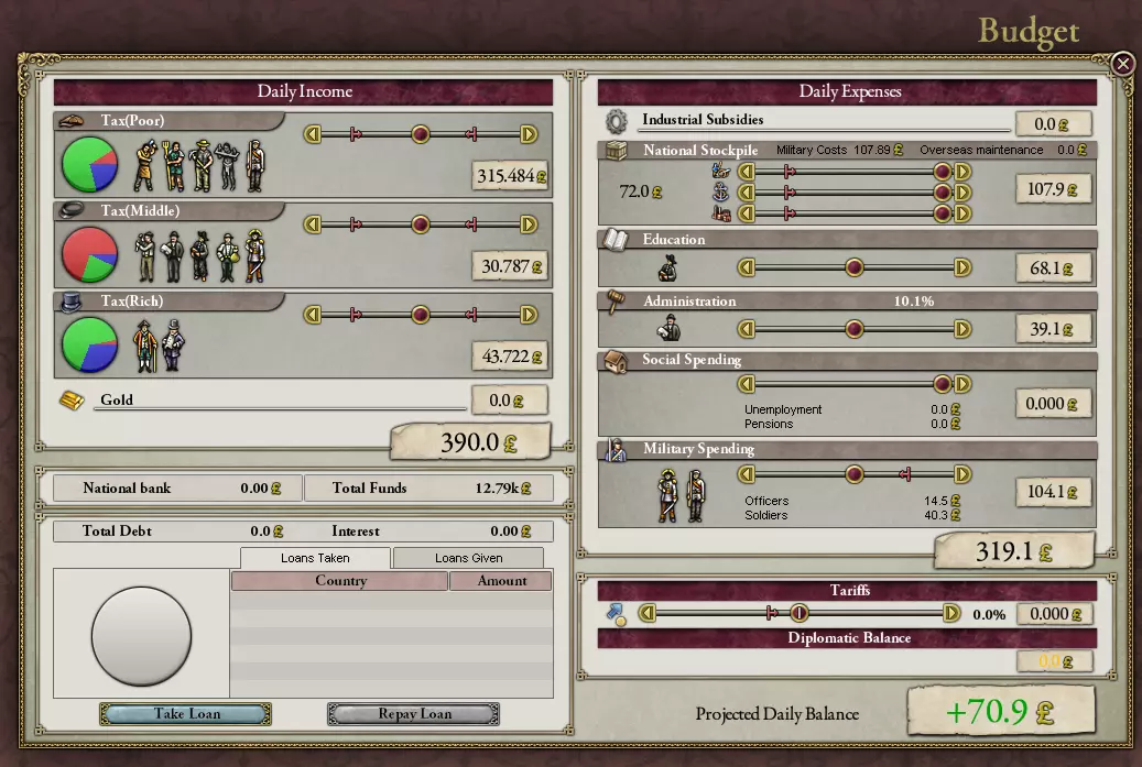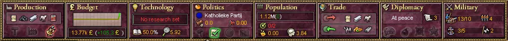 太棒了!点击那个与结盟相关的选项,接受那个看起来有些令人费解的对话框中的内容,然后就可以坐下来,悠闲地抽口烟斗,因为今天的任务圆满完成了! 预算:民生与工业 当你准备好后,可以退出外交界面——我记得是点击那张精致的木质桌面上的外交按钮——然后看看其他按钮。在左侧,我们能看到“生产”选项——这是一个模拟国内所有人生产活动的游戏机制。
