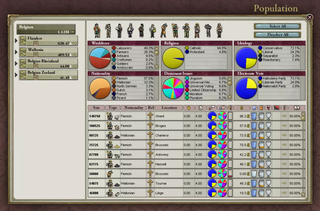 人口数量指的是你国家中正在工作并做出贡献的人数——实际人口数量更多,你可以将鼠标悬停在人口框上查看。 带圆圈的箭头和“0/2”是你的国家焦点。可以将其视为与国民相关的政府政策。国家焦点可以放在某个省份,以鼓励当地民众从事特定事务。例如,你可以鼓励他们成为士兵或军官(这通常是个好主意——你应该对比利时的附庸国这样做!)。你也可以选择鼓励资本家建立特定产业,或鼓励民众以特定方式投票、迁移到某地,或进行其他多种活动。火焰状图标表示民众的不满情绪,即【 militancy( militancy)】。该数值越高,民众就越有可能做出诸如试图斩首他们那位虽遭误解却充满慈爱的国王之类的过激行为。将鼠标悬停在该图标上,还能查看其增减趋势,由此你可以判断自己那些可爱的子民是否正一天比一天更厌烦你。 那个带有大脑的人头图标,其标题【 Consciousness( Consciousness)】确实容易让人困惑。实际上,它代表的是政治意识,并非指民众是否处于昏迷状态。这一数值越高,你就越有可能听到王室助手提及平民对政治议题的认知正不断提升:他们阅读文献,了解时事,自认为见解独到,思想也变得愈发活跃。这类人群在投票时往往不会支持保守党。若他们的诉求完全被忽视,就会变得激进并开始参与叛乱。 militancy(激进度)和 consciousness(觉醒度)同样会受到民众生活状况的影响。处境悲惨、受压迫的民众容易发动叛乱;而生活优渥、享有特权的群体则倾向于维持现有地位。因此,根据他们上述的社会地位和所受教育,高觉悟会导致(在民主制度下)选出更多心软的自由主义者、爱讥讽的社会主义者、阴险的共产主义者以及不信神的法西斯主义者。