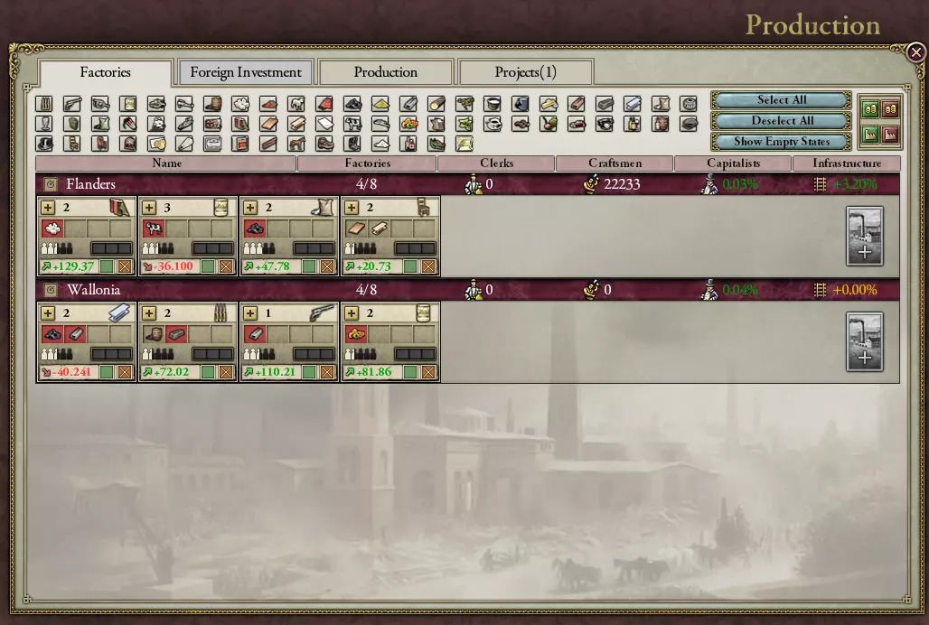 在“生产”界面中打开了“工厂”选项卡。该选项卡显示了比利时的所有工厂。资本家会投资建设新工厂,或者你也可以在绝对主义政府类型下自行建造工厂。