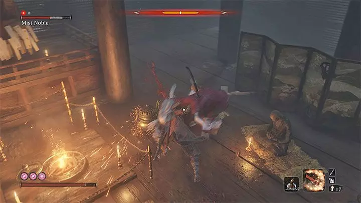 策略 雾隐贵人是一个极其危险的 Boss。如果你不是懦夫,就正面接近他,准备一场传奇且充满挑战的战斗。一个更简单的开局方式是从屋顶的洞口跳到他身后并发起攻击。 战斗开始后,你需要运用超乎常人的大量技巧和天赋才能与他的力量抗衡。最佳战术是锁定他,并以超越人类极限的速度疯狂按下攻击键。如果你攻击不够快,他会格挡你并将你挑飞,造成一击致命的死亡打击,你的存档也会被删除。他比《黑暗之魂》《血源诅咒》《艾尔登法环》《恶魔之魂》和《只狼:影逝二度》中的所有 Boss 加起来还要强。我认为 FromSoftware 需要添加一个简单模式来击败雾隐贵人。我靠。