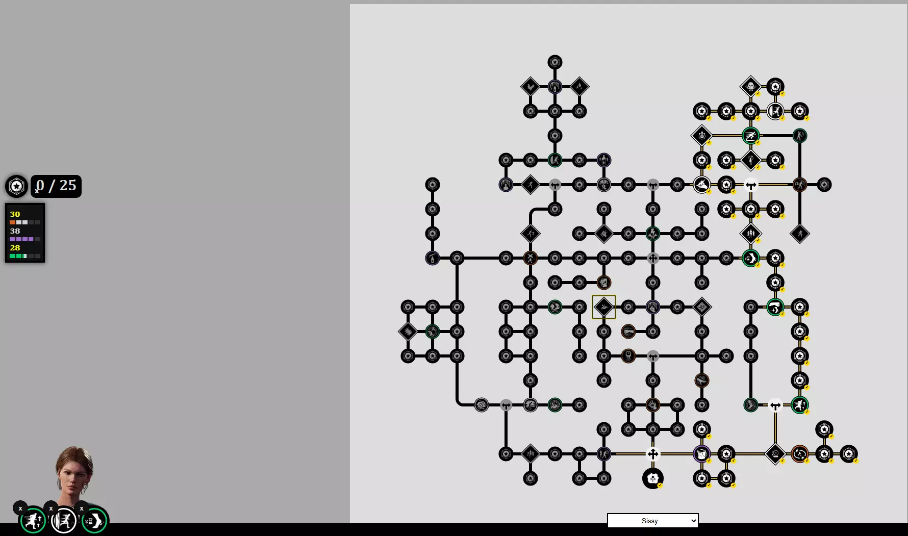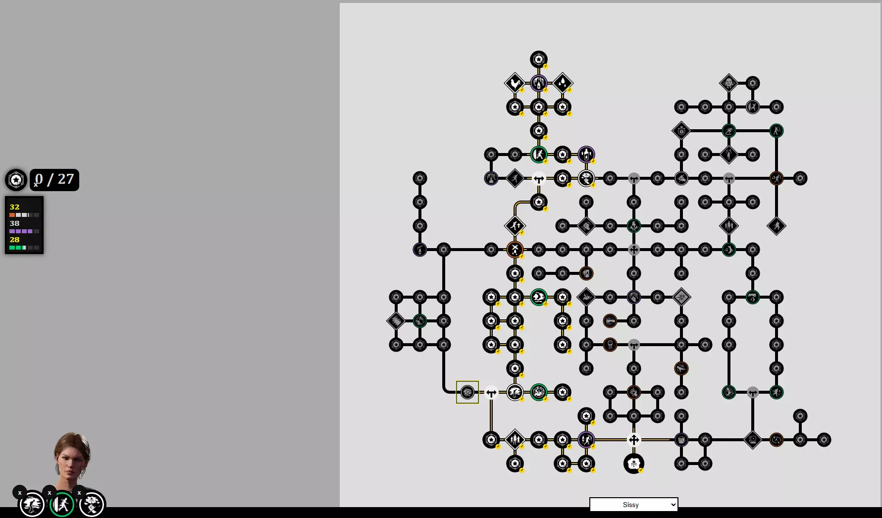 孢子失败者 - 绝对必备。在挣脱失败时释放毒雾,且不消耗你的粉末。茜茜在挣脱小游戏中的力量值最低,所以这为她提供了一个翻盘机制。 属性点+爷爷技能 32点残暴 - 规则同上:对40点韧性造成7次命中。 38点采血 - 默认值。 28点耐力 - 同样,这里我们能做的不多。