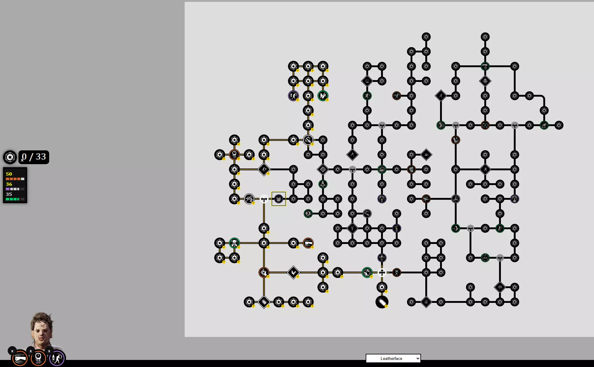 【软化者】/【血库管理员】/【坠入兔子洞】——就我个人而言,【坠入兔子洞】是这三个中最好的,但它目前存在bug,没有按预期工作——有时受害者甚至不会被高亮显示,即使被高亮了,持续时间也只有大约5秒,而不是17秒。 如果是这种情况,可以选择【软化者】来获得额外伤害(尤其是如果你擅长关门撞击的话),或者如果你想给爷爷喂食更多,就选【血库管理员】。 话虽如此,自从爷爷重做后,我不太建议专注于给他喂食——这一点后面再详细说。 最终,这里唯一必选的是【侦察】和【粗切割】;第三个槽位可以灵活选择。 属性点+爷爷 perk 50点残暴值——把它点满。 32点采血——把剩余的点数都用在这里。35 耐力值 - 默认数值 - 对皮脸没有任何作用