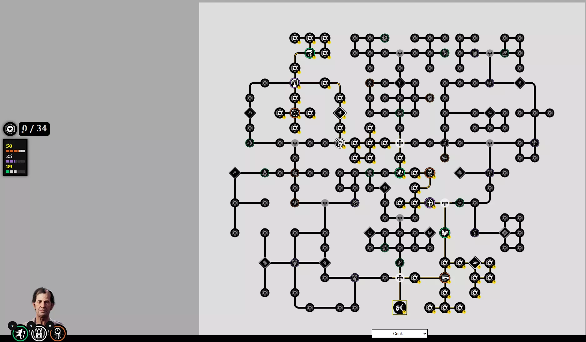 锯齿 - 额外伤害总是好的,尤其是与厨师的门压力和地图控制配合使用时。 属性点 + 爷爷技能 50 残暴 - 我倾向于在厨师身上将这个属性点满。即使有侦察技能,他也抓不到受害者,所以把点数投入耐力并没有什么回报。如果你想把点数分配到其他地方,可以将其降低到42。 25 采血 - 这里的性价比不错(每桶20点血,血瓶100点) 29 耐力 - 把剩余的点数都投入这里。对厨师来说帮助不大,但聊胜于无。
