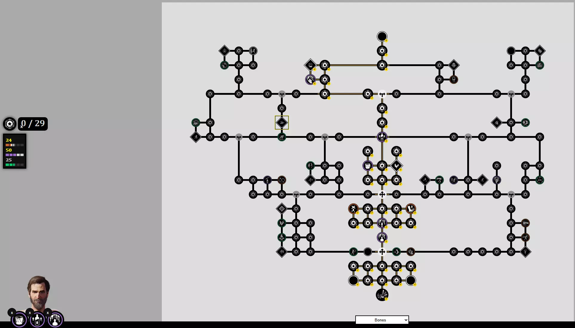 通用供血者+血库管理员+外科医生 骨头是目前最差的家族成员,但这可能是他最好的配装了。 你的职责?用两个没用的炸弹困住爷爷,然后疯狂给他喂食。就这样。他行动迟缓,玩法无聊,还没有侦查能力——但这个配装至少能让他有点用处。